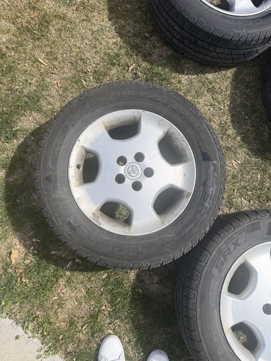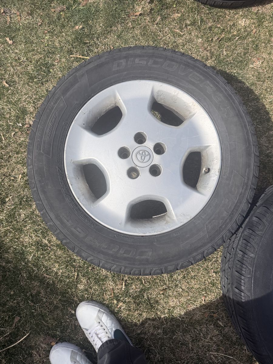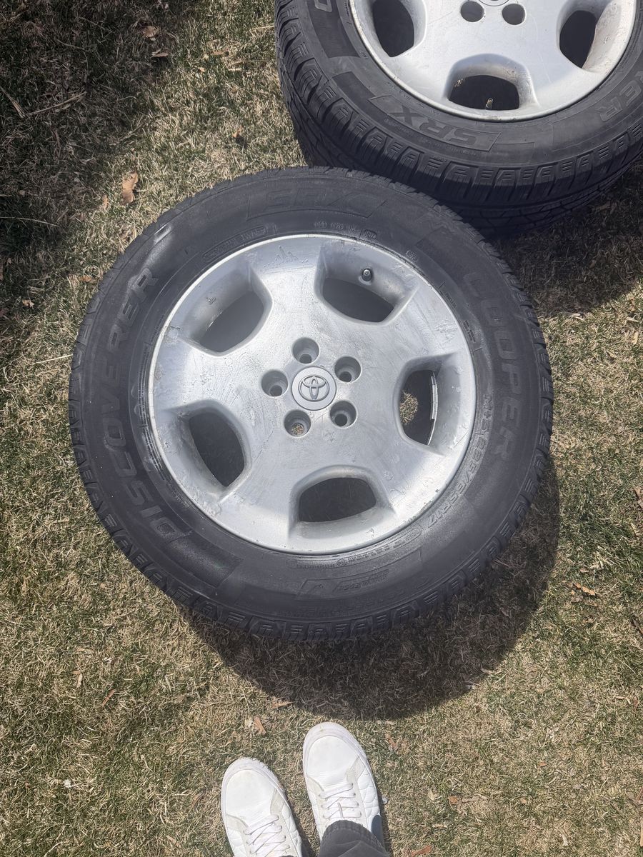 4wheels 17in rim 225/65 Tread is in great shape One wheel has very minor leak I just haven’t had the time to plug it One wheel looks like it was spray painted