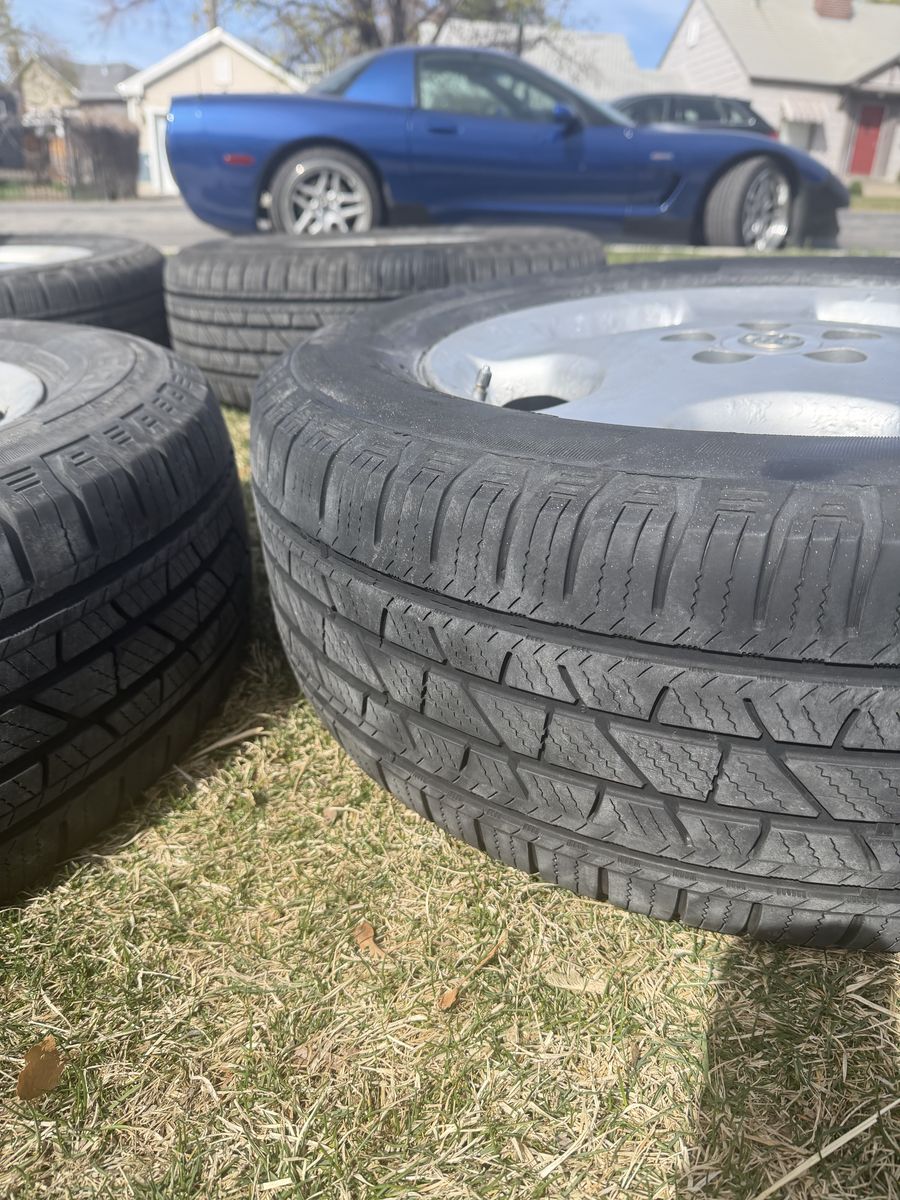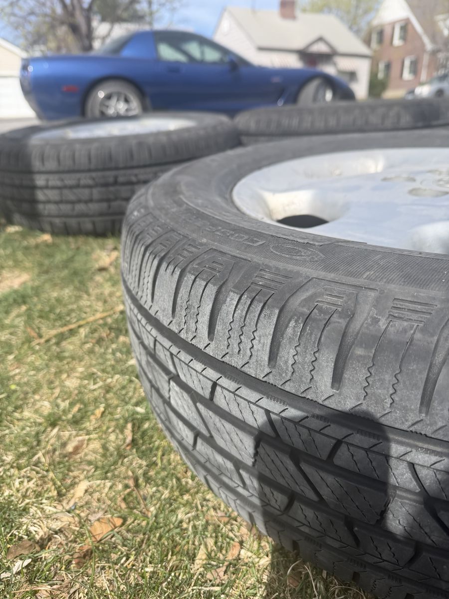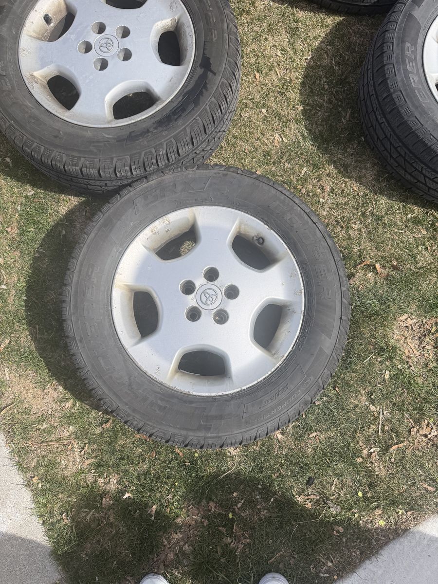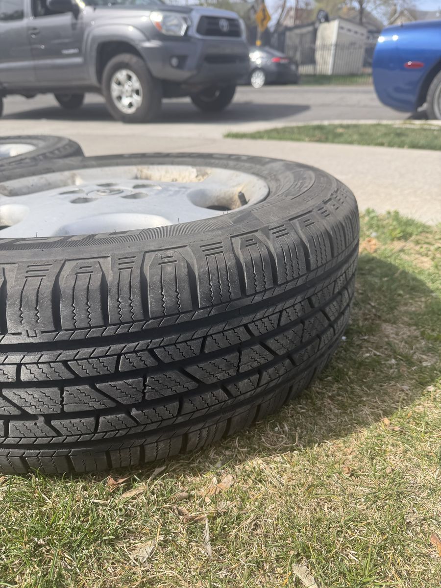 4wheels 17in rim 225/65 Tread is in great shape One wheel has very minor leak I just haven’t had the time to plug it One wheel looks like it was spray painted
