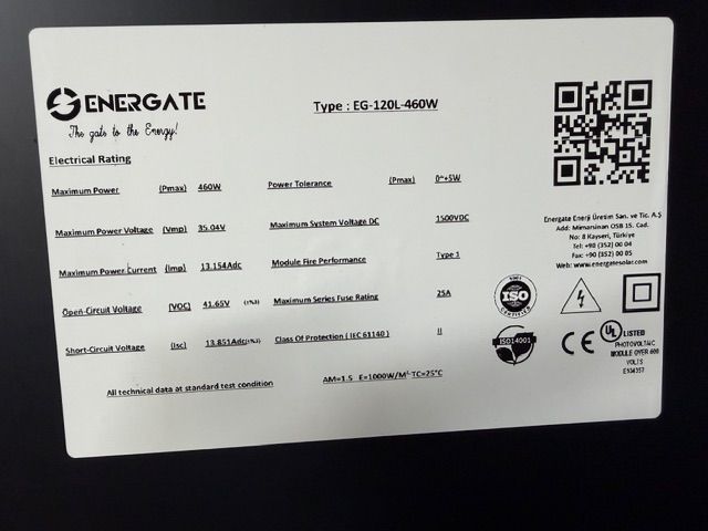 • 460W panel: ~41.6V open-circuit (Voc), ~13.1A current • (4) Energate 460W Monocrystalline Panel (EG-120L / EG-12M series)