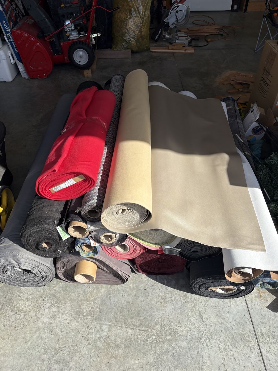 Rolls of vinyl and upholstery fabric and some bolts of cotton. Removed from a basement. Estimated guess for yardage on large rolls is 150 yards. Some rolls sell between 500.00 and 1000.00 roughly selling as one group but would be willing to sell individually. buyer to pickup. Cash only. Serious offers and inquiries only please. will sell for 3000.00 for all. Indian prices are listed below.