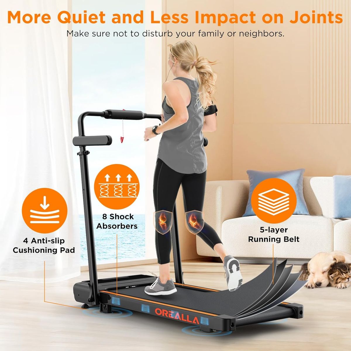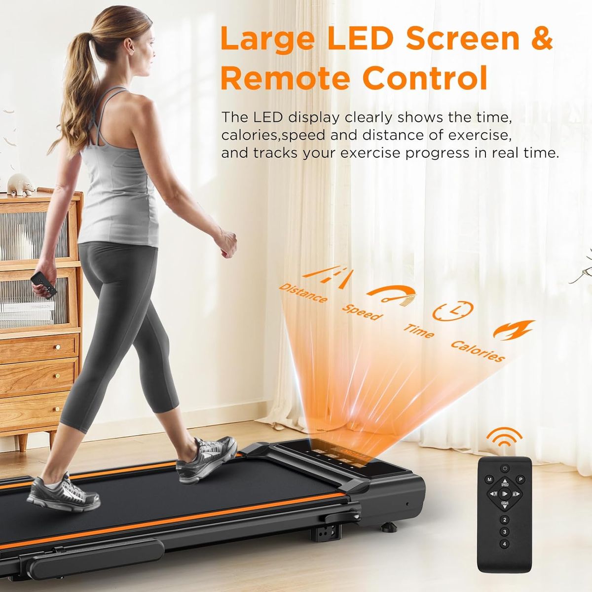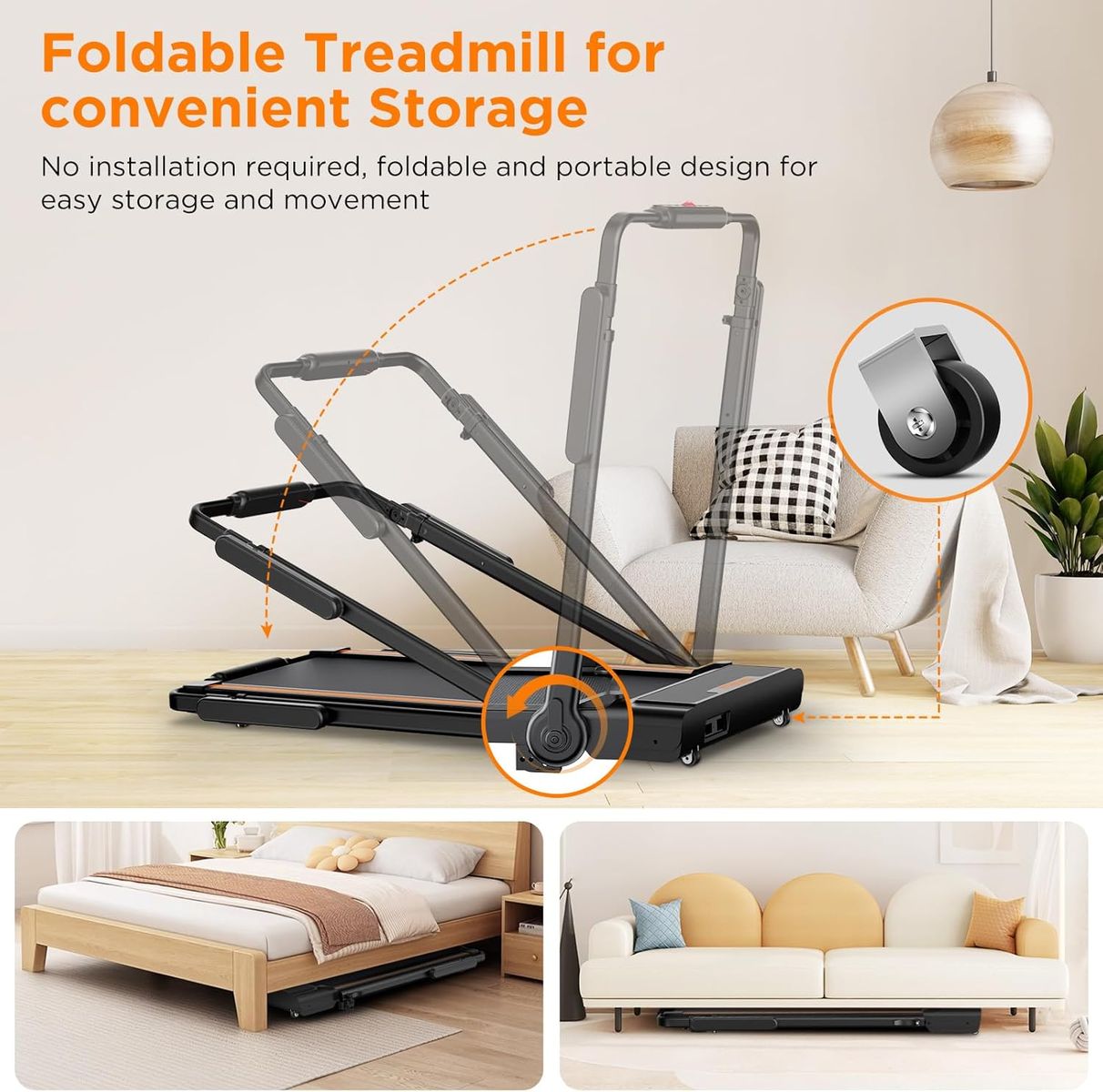 Ready to Use & Easy to Move - No assembly needed – just unbox, plug in, and go! This walking pad for home has handles and folds up compactly to slide under your bed, couch, or desk. Perfect for small spaces like apartments or tight offices. Built-in wheels make moving it a breeze for workouts anywhere at home or work.