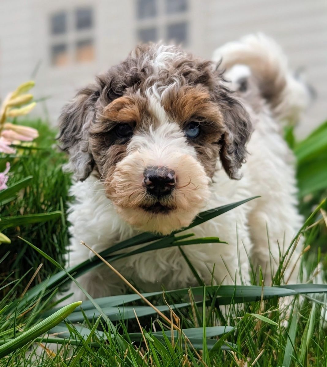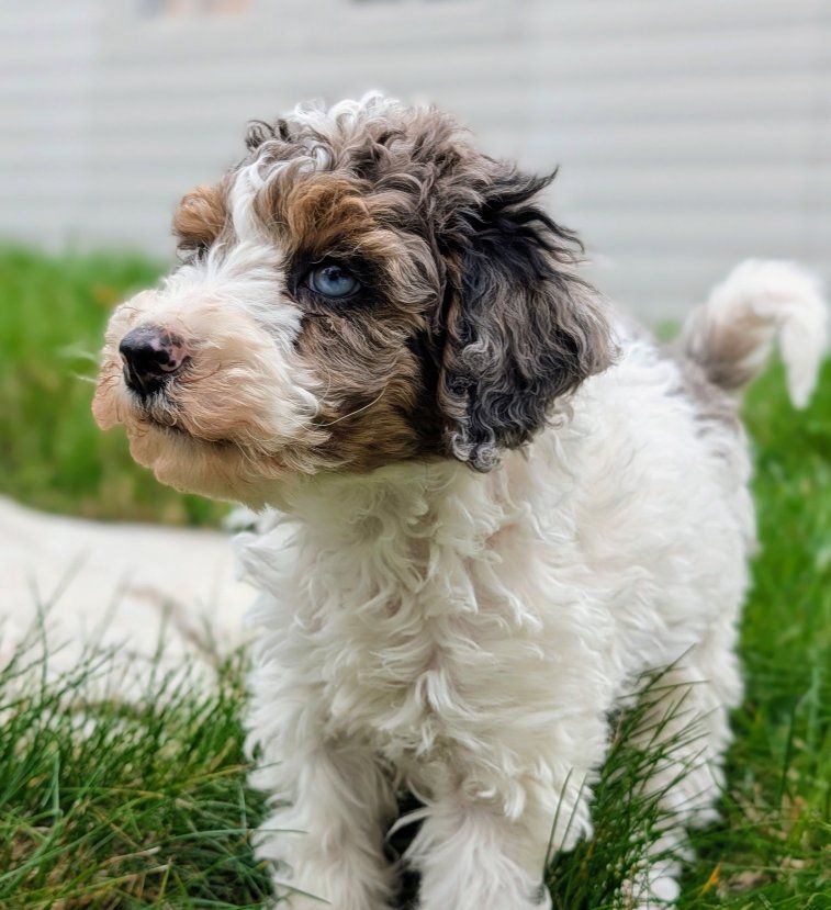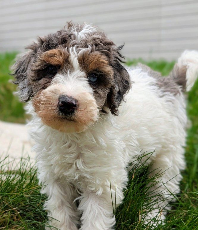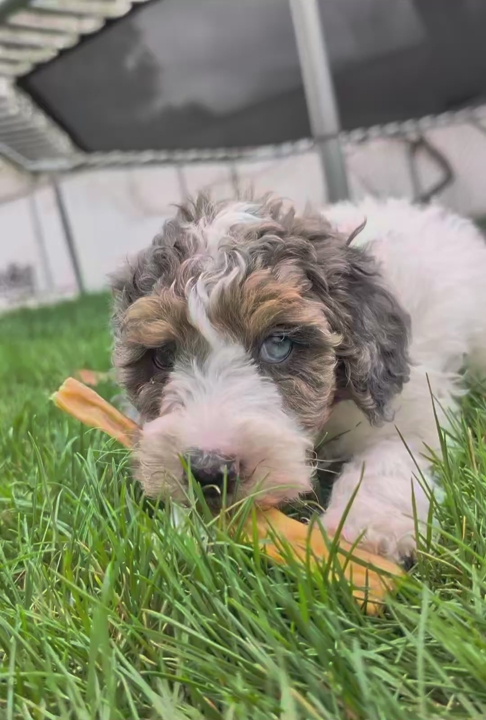 He is a stunning merle tri toy Labradoodle with one striking blue eye, but what makes him special is how deeply connected he is to people. He is affectionate, human-focused, and naturally in tune, while still carrying a playful, adventurous personality. He will be 8 weeks old on April 5th, just in time for Easter!