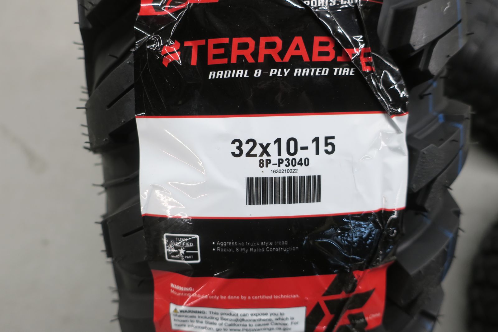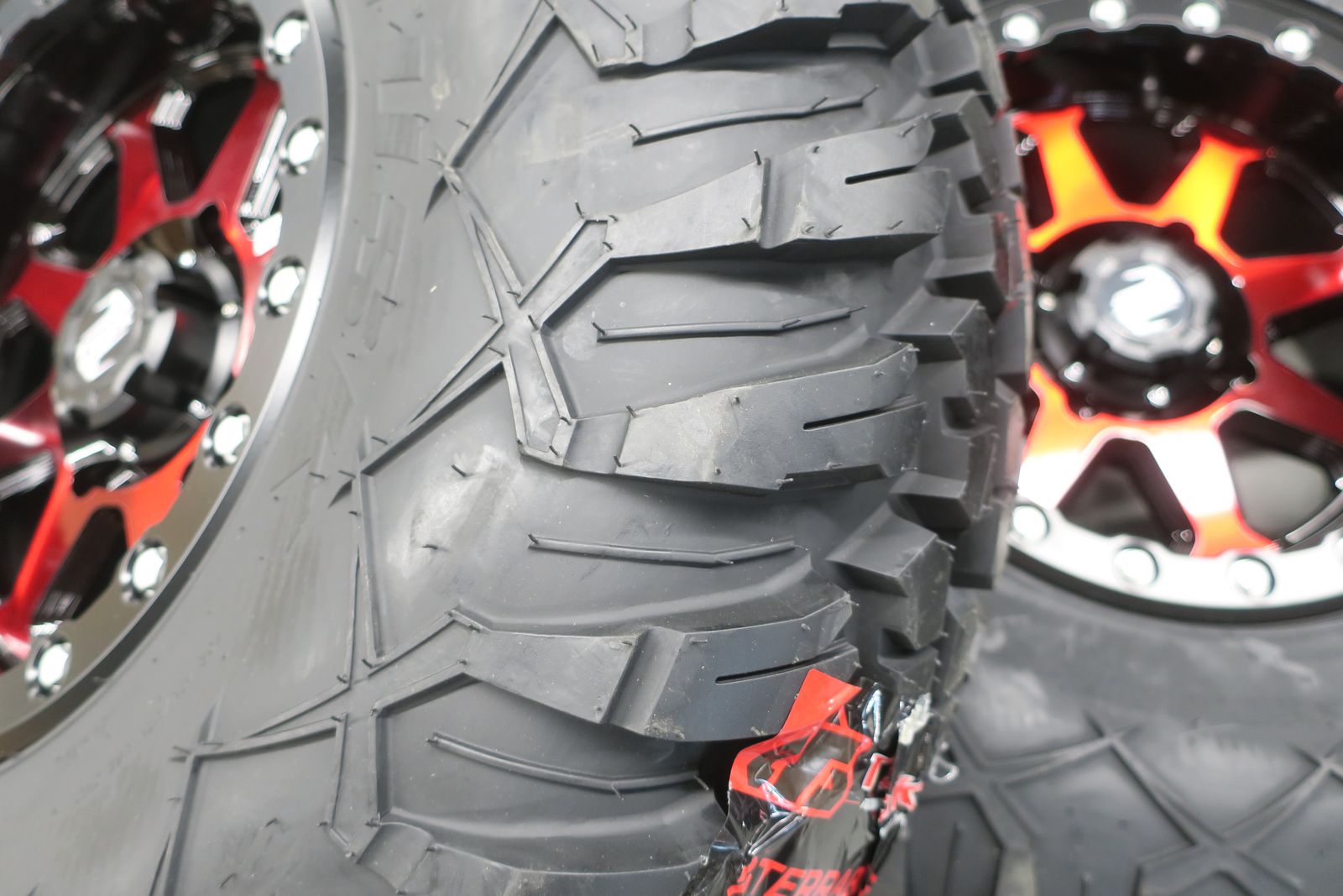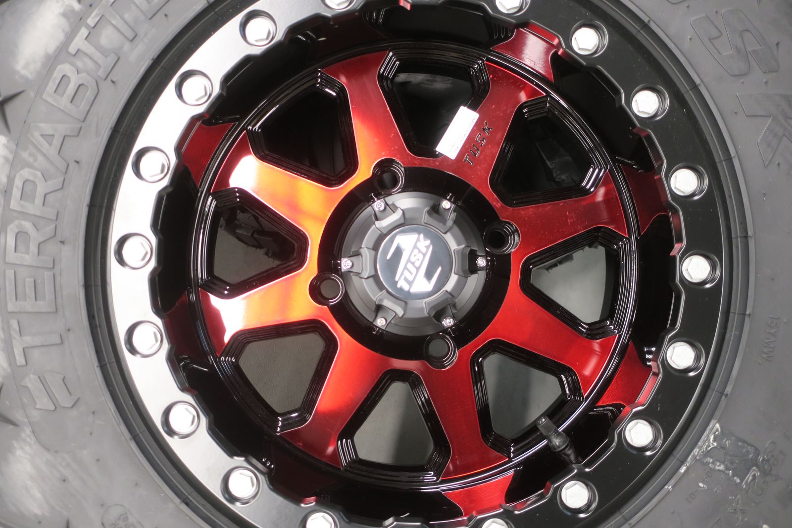 4/137 Tusk Uinta Beadlock Wheels 15x7 4.0 + 3.0 Candy Red on Tusk Terrabite® Radial Tires 32x10-15 Medium/Hard Terrain.