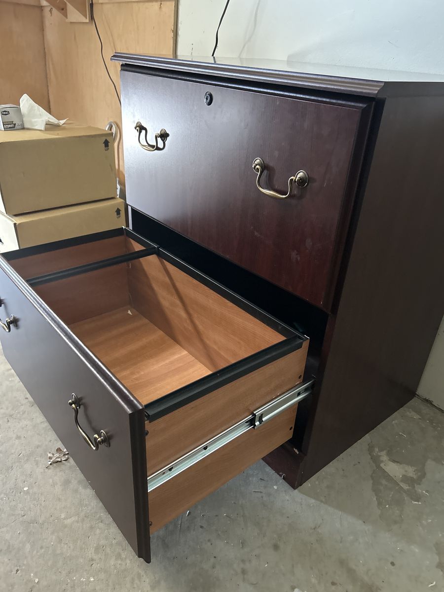 Two drawer lateral file cabinet made of MDF. Dark burgundy wood pattern.