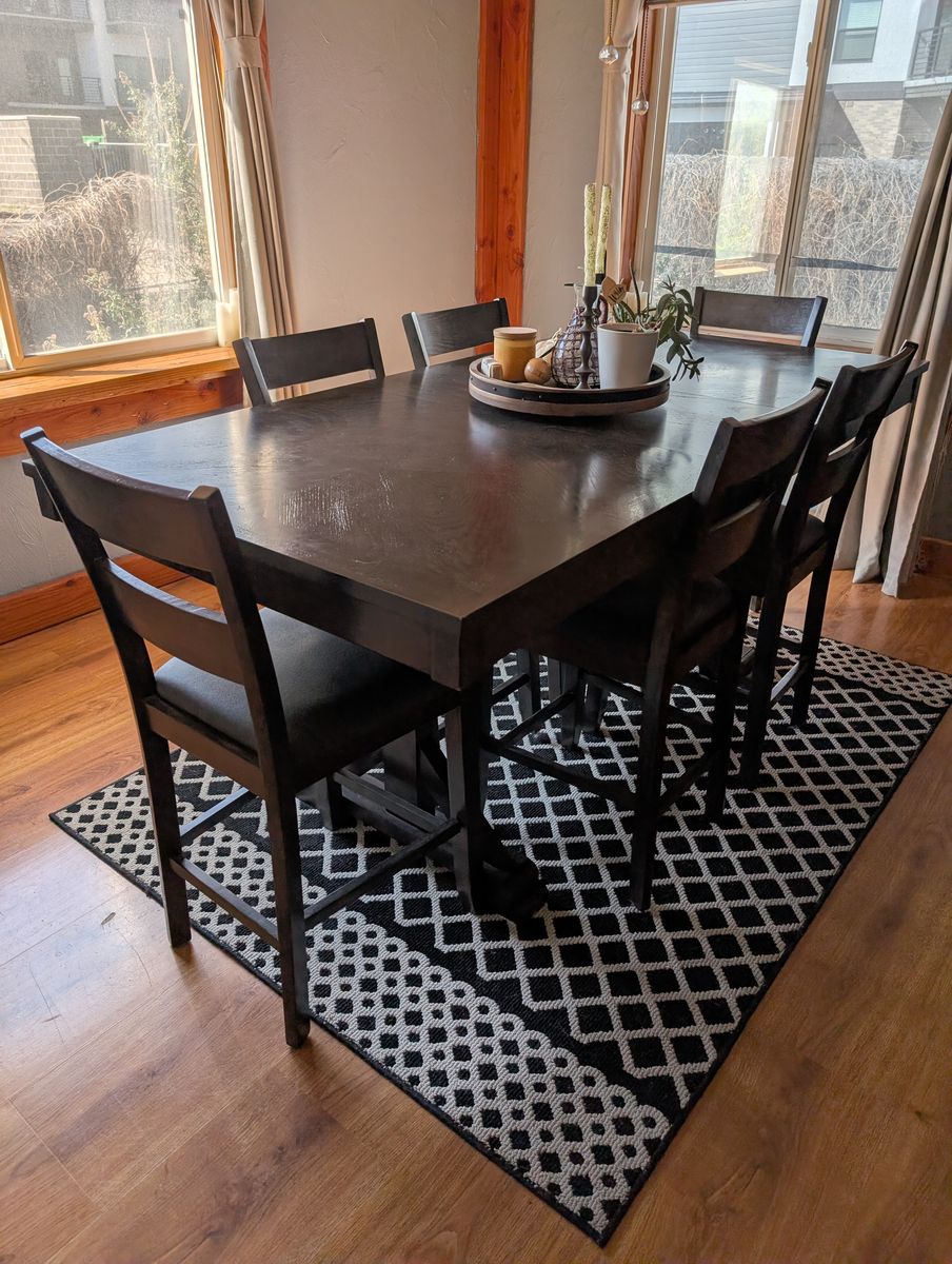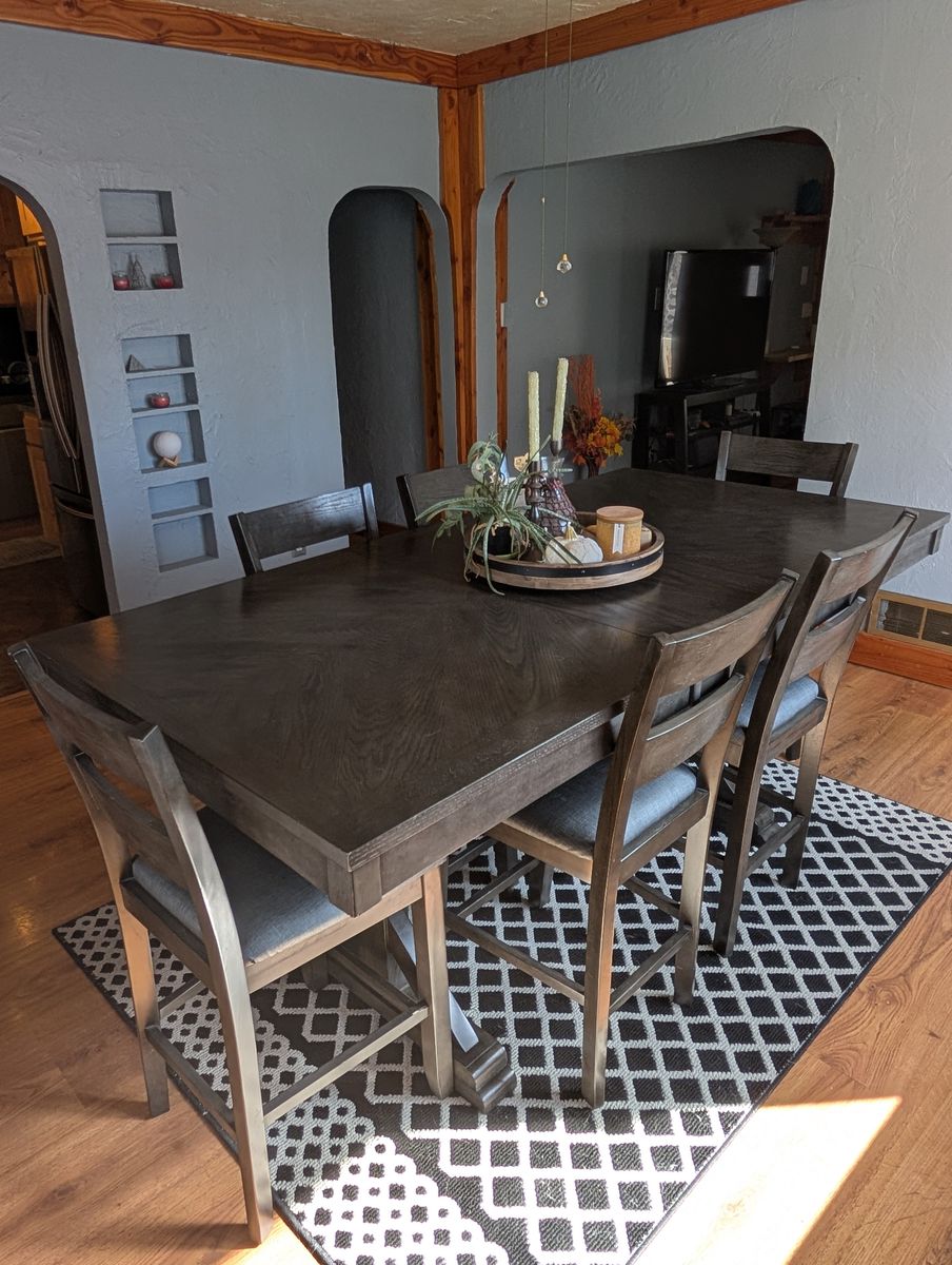 VenmoVery well protected and maintained counter height dinning table. It has a leaf for extended seating. 6 chairs are included.