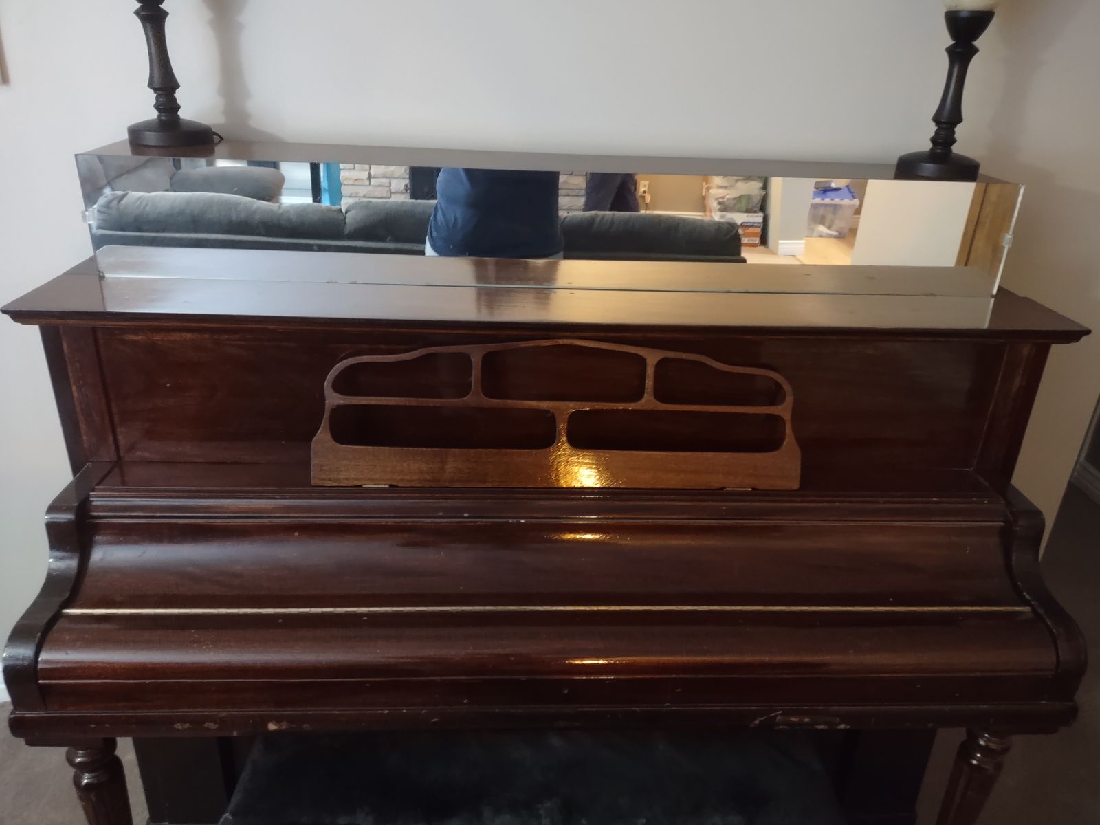 VenmoTall upright piano with mirror top portion. Refurbished and in decent condition besides minor damage from wear and tear and being in a family home. Make/model: Kimball