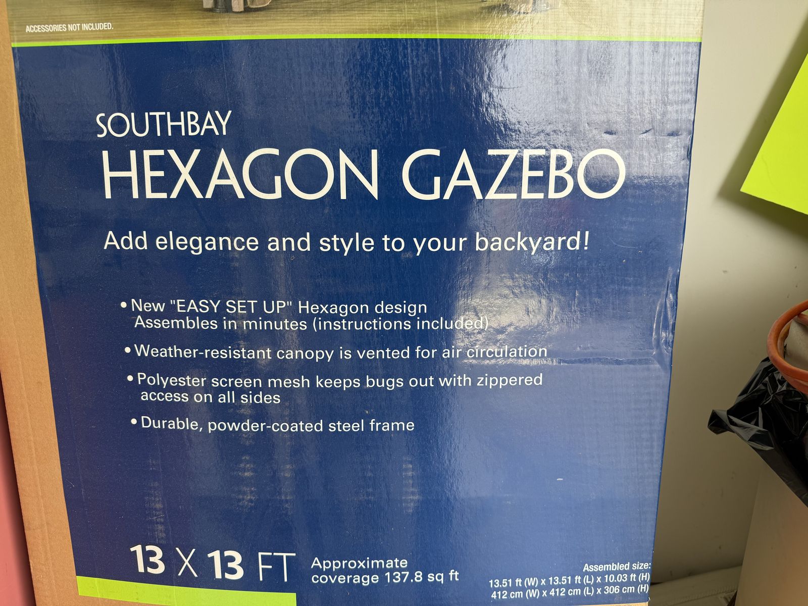 Zelle$225 New, Southbay Hexagon Gazebo 13 X 13. New in the box.