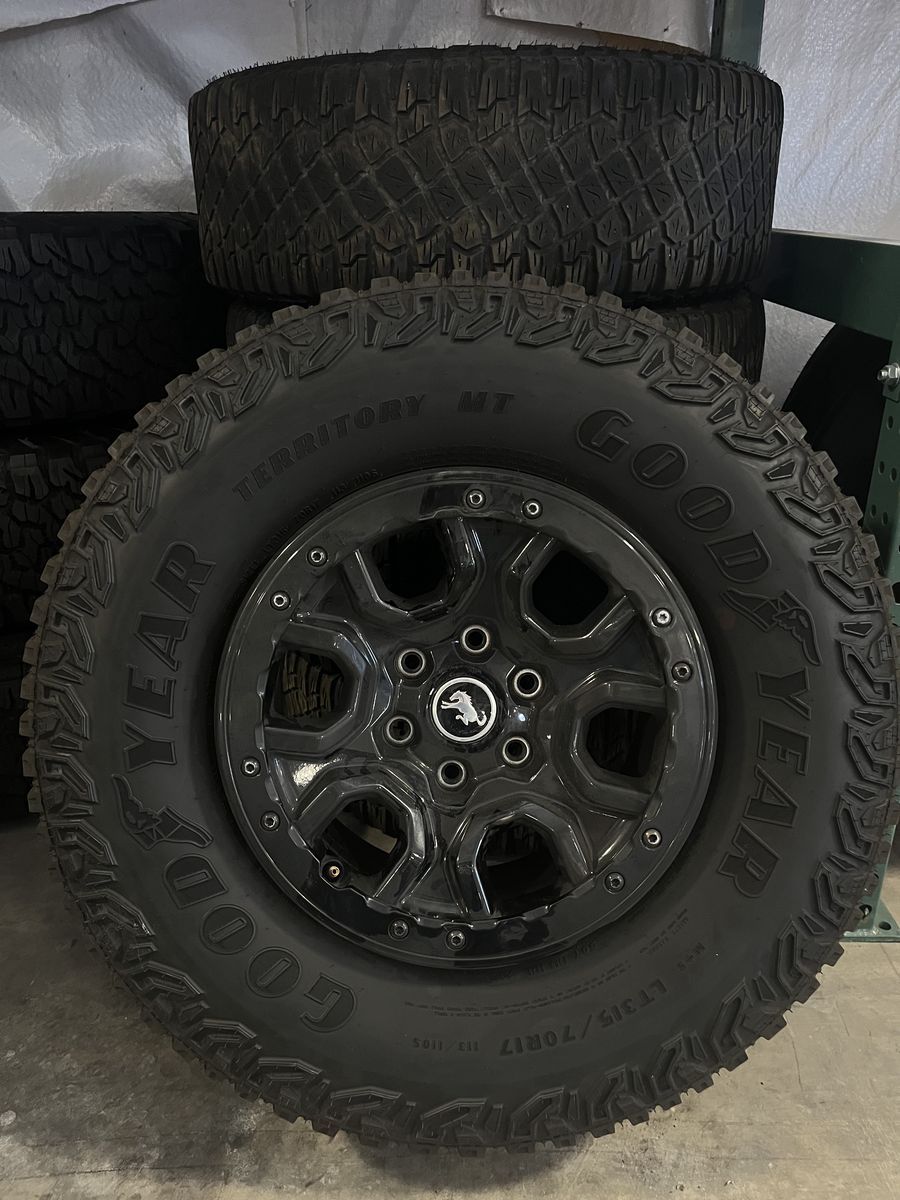 These are aggressive mud-terrain that perform great off-road while still driving well on pavement. Wheels feature the factory Bronco design.