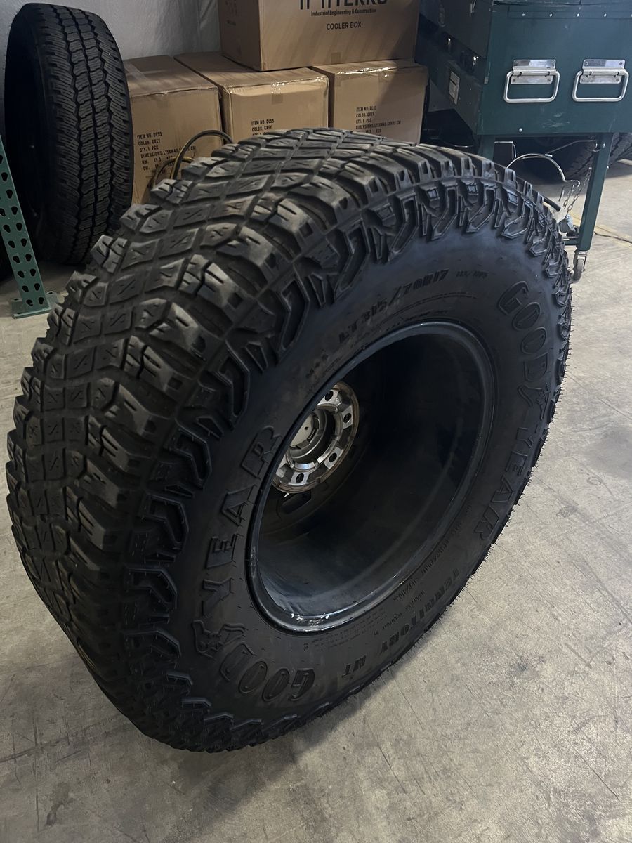 Set of 5 Goodyear Territory MT Tires mounted on Ford Bronco Wheels.