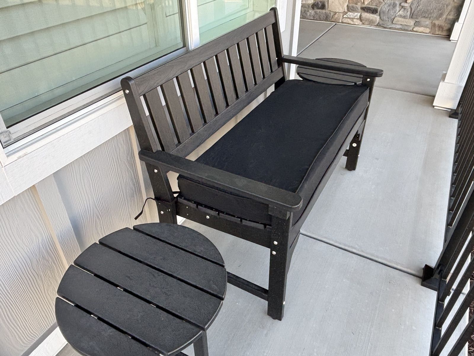 Black weatherproof bench with 2 matching round tables. Cushion included.