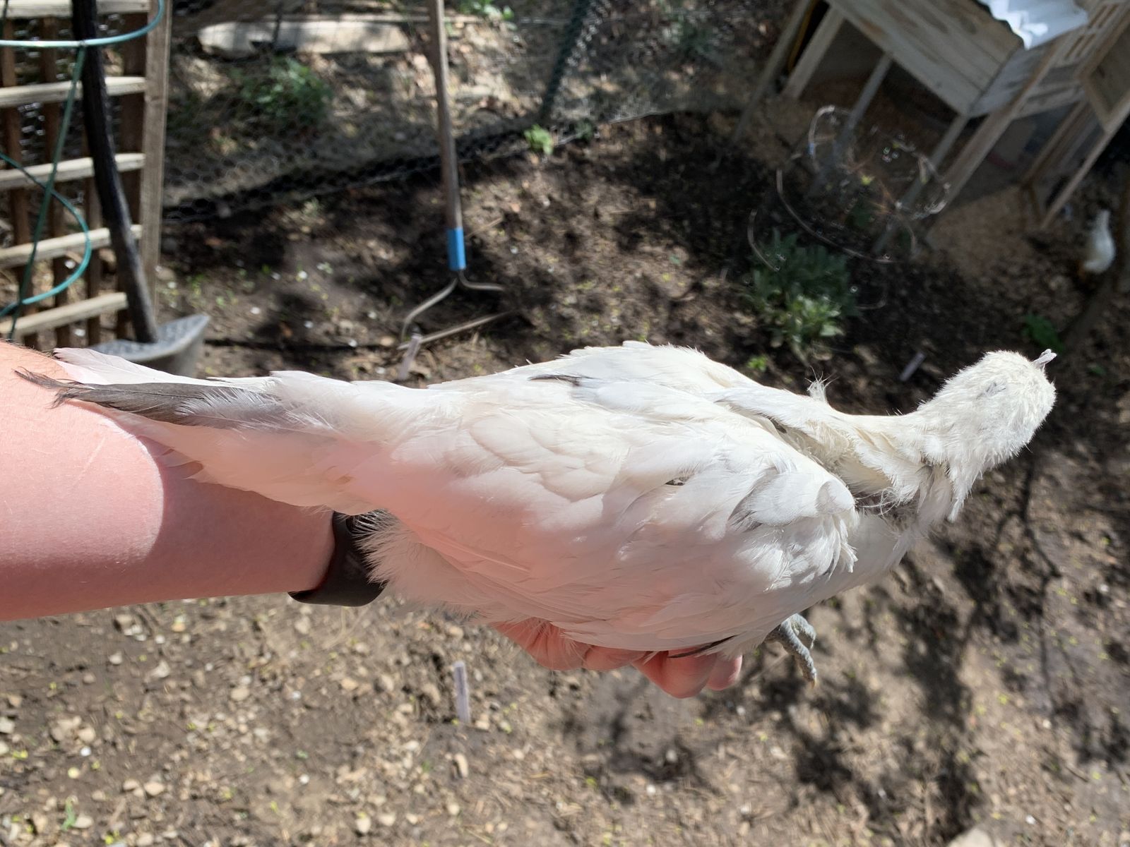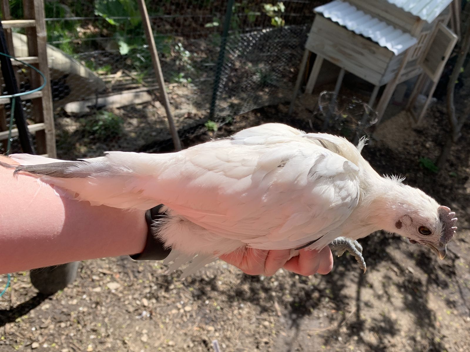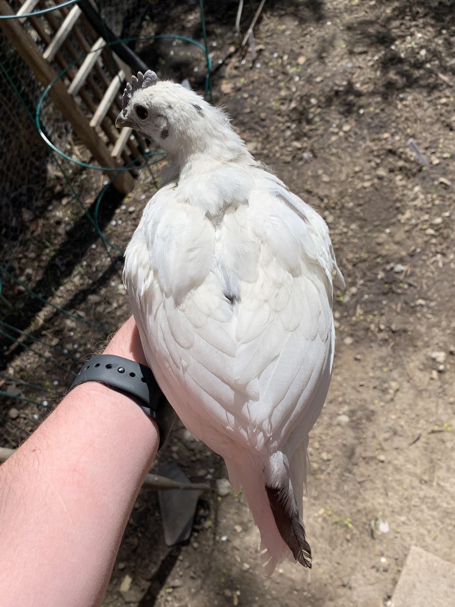 Venmo6-week-old zombie (Ayam Cemani x American Bresse) cockerel chick, already living outside full-time. Both breeds are renowned for their meat, so he should be good eatin'. He is quite confident and protective of his girls (the chicks he was raised with), but always gives me a respectful distance and doesn't pick fights with adult Top Hens, other than to make them back off from bullying one of his girls. He is always the first of the chicks to investigate a potential threat and has chased rats away from his coop, so he would also make an excellent rooster to defend and cover a flock of hens. He has had new black feathers appearing on his head and on his back as he matures. Make an offer, holds ok. Text preferred.