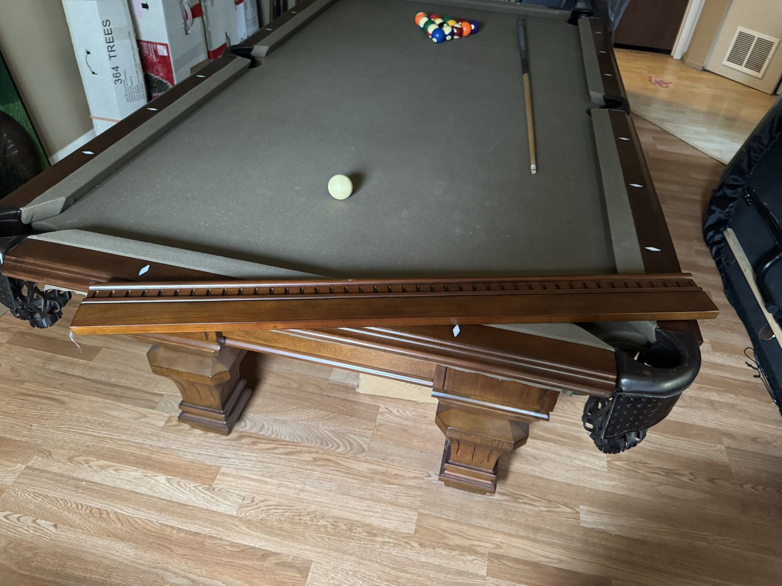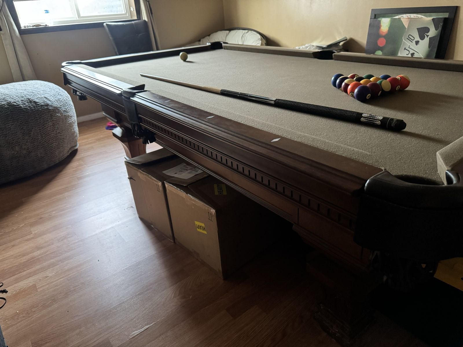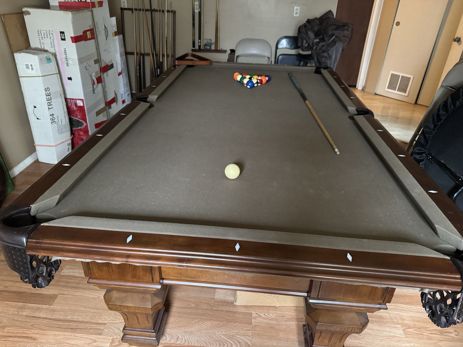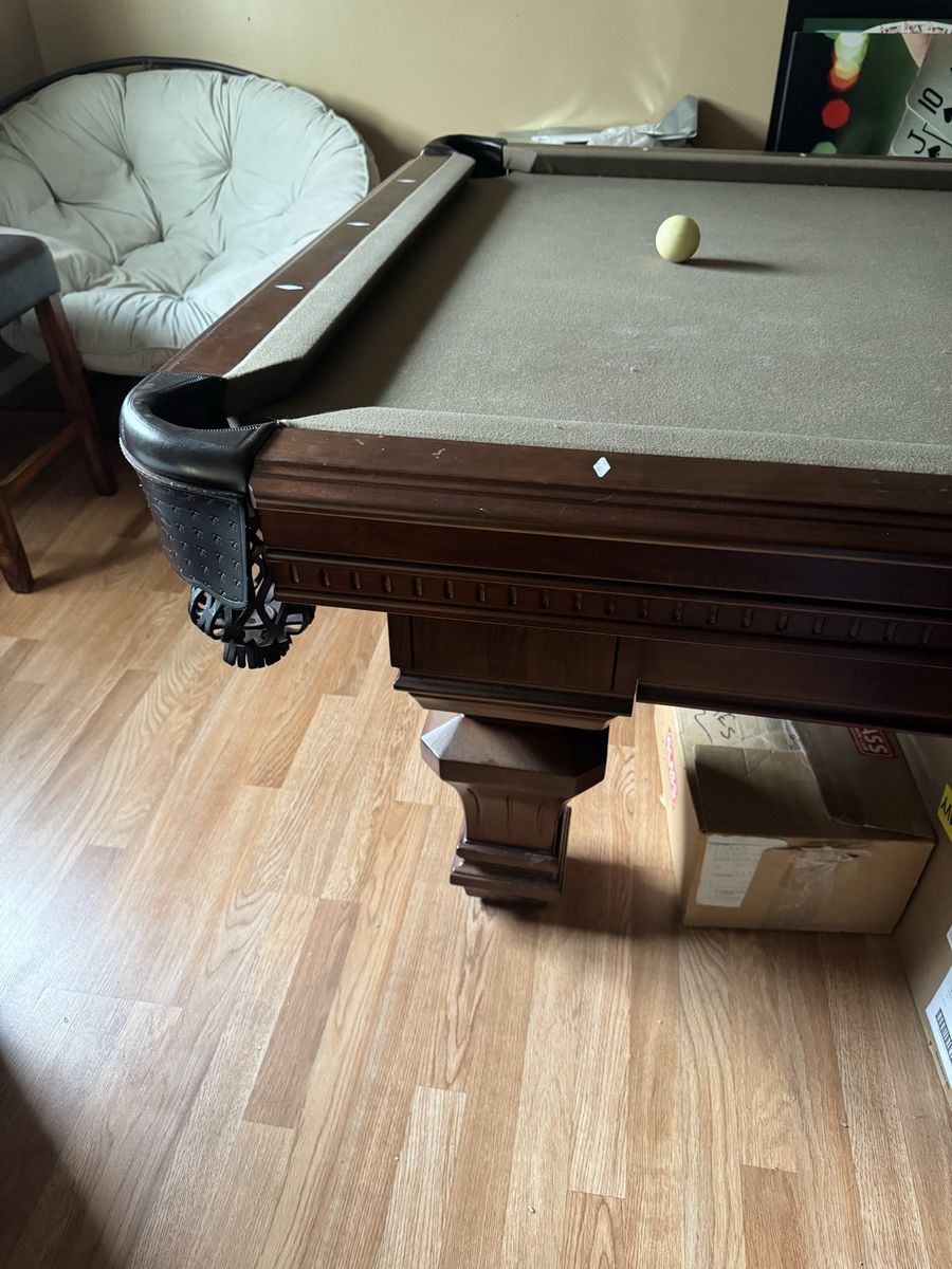 Selling our nice solid pool table. Comes with balls, sticks, frame, cover, etc. It does have the one end wood panel that just needs to be reattached.