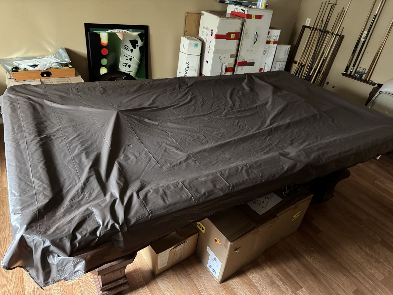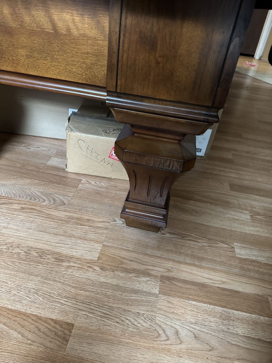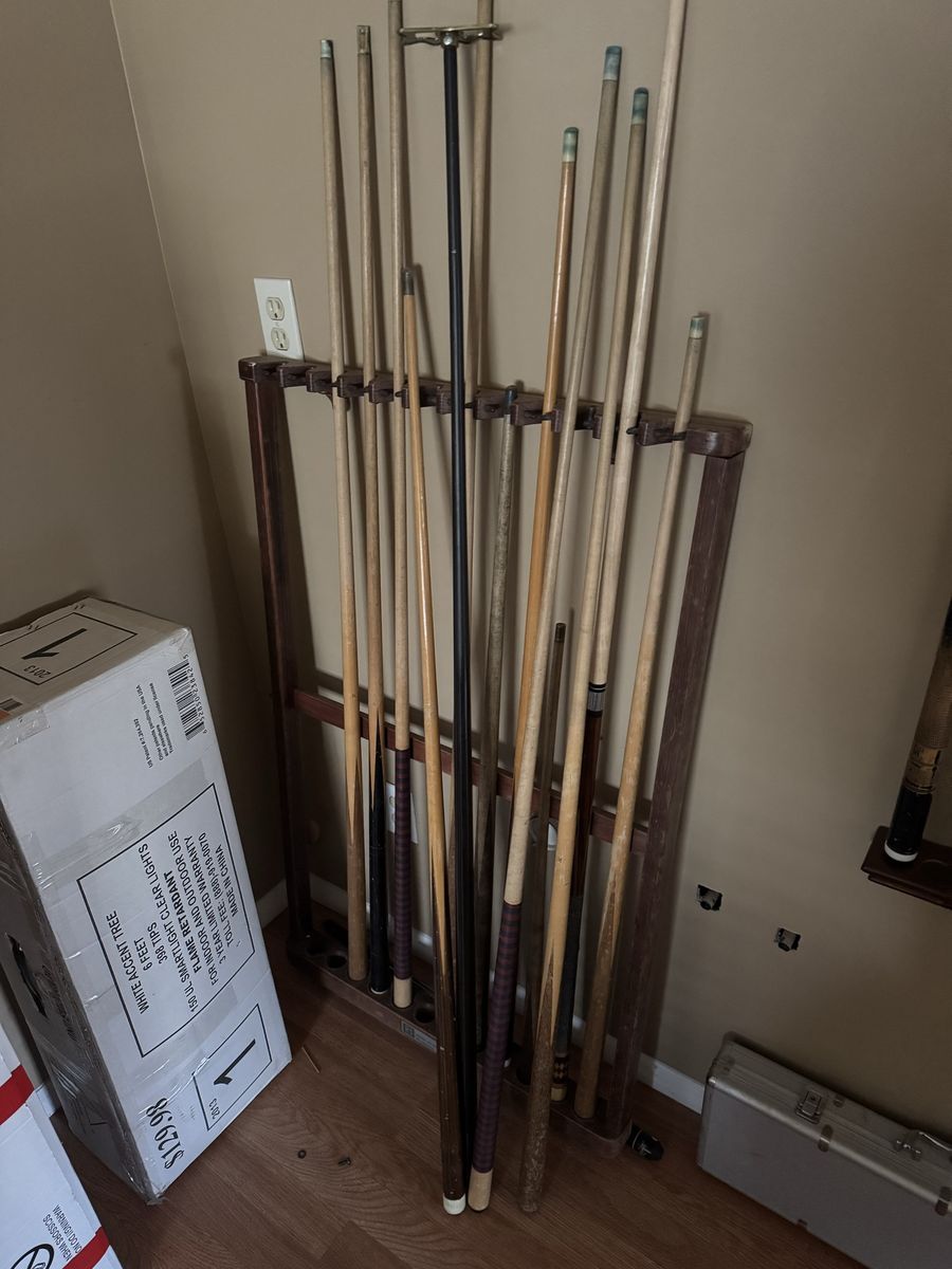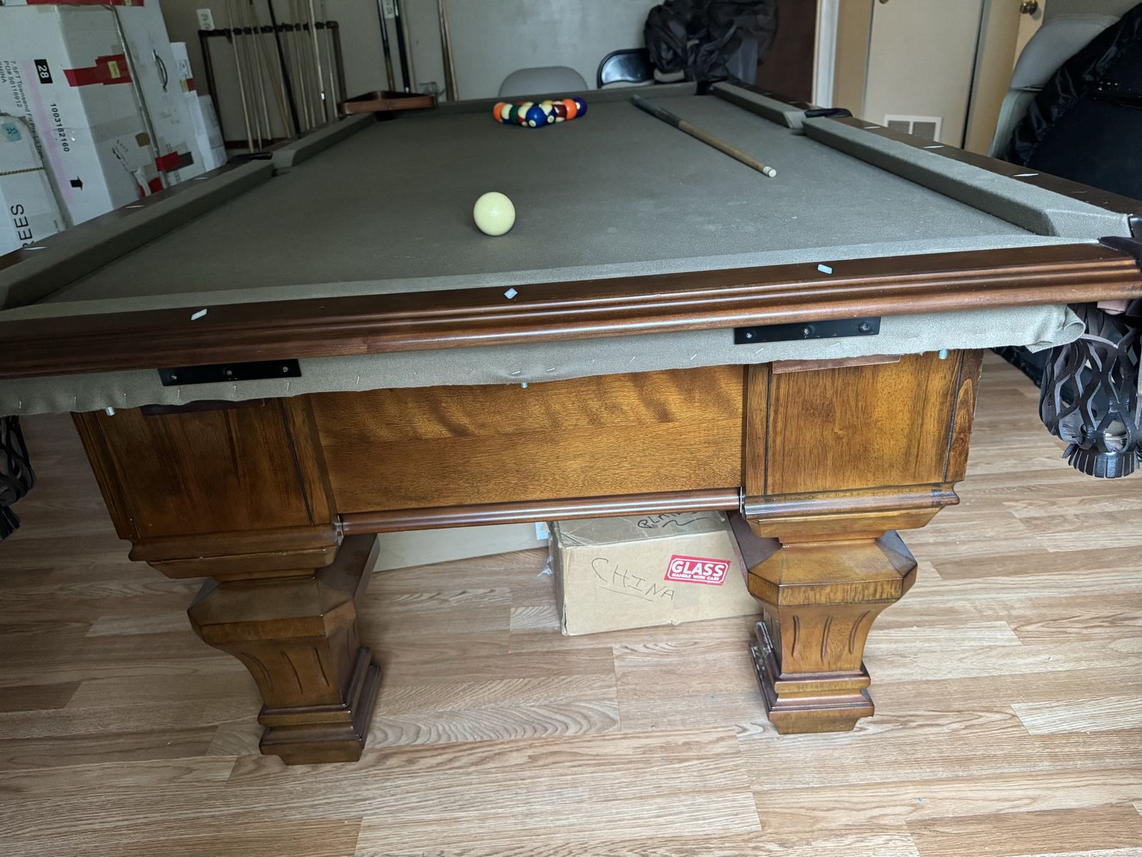 Selling our nice solid pool table. Comes with balls, sticks, frame, cover, etc. It does have the one end wood panel that just needs to be reattached.