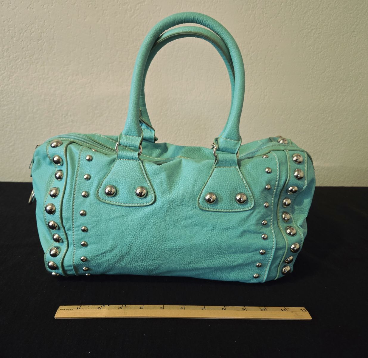 ZelleStylish turquoise handbag with silver studs and front zipper pocket.