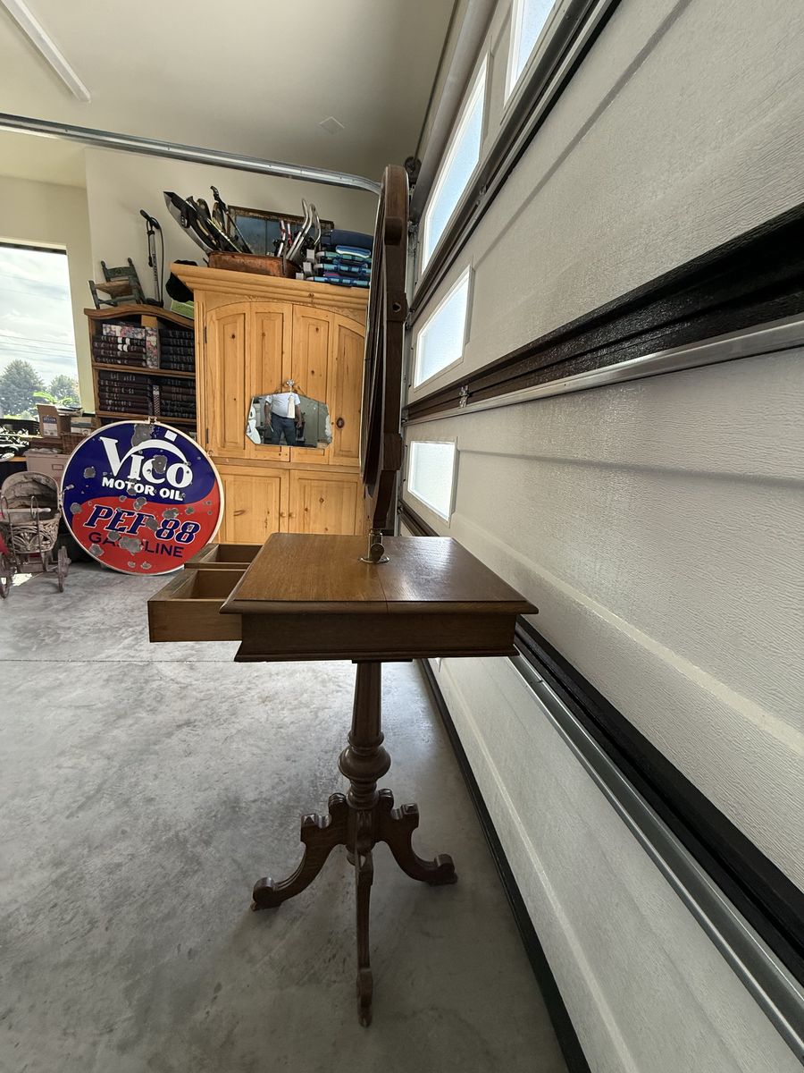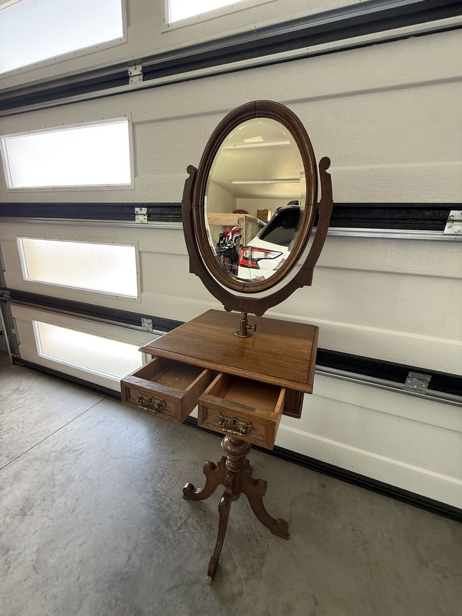 Top is 18 3/4” x 18 1/2” and 59” tall. Mirror tilts and elevate. 2 drawers.