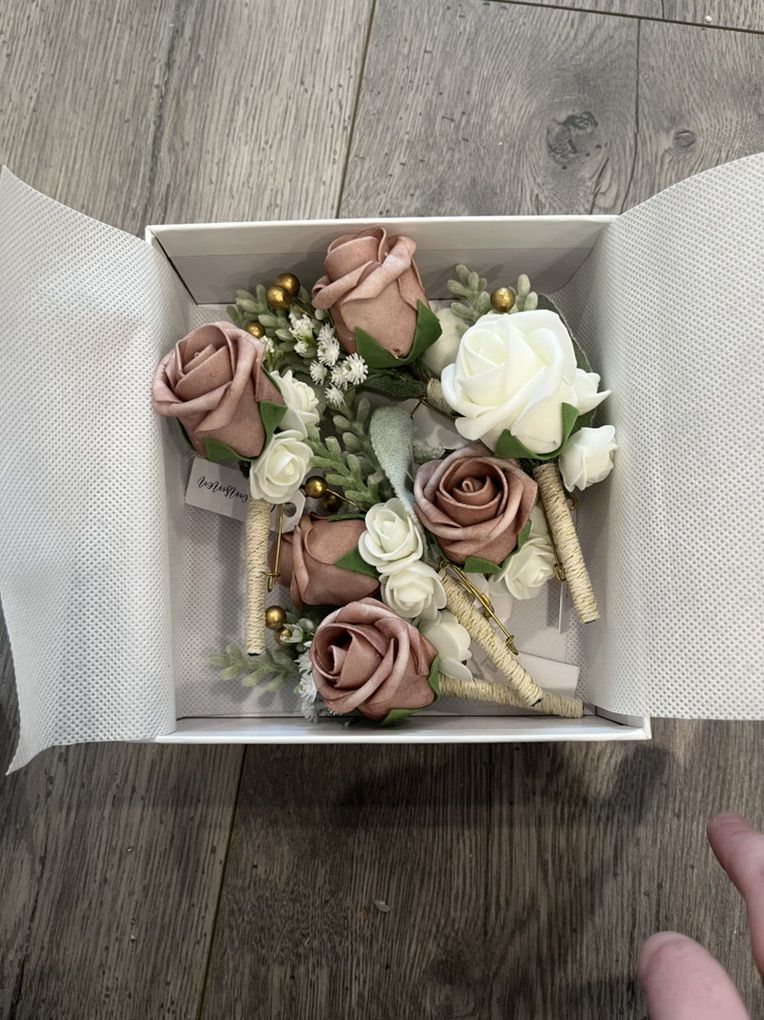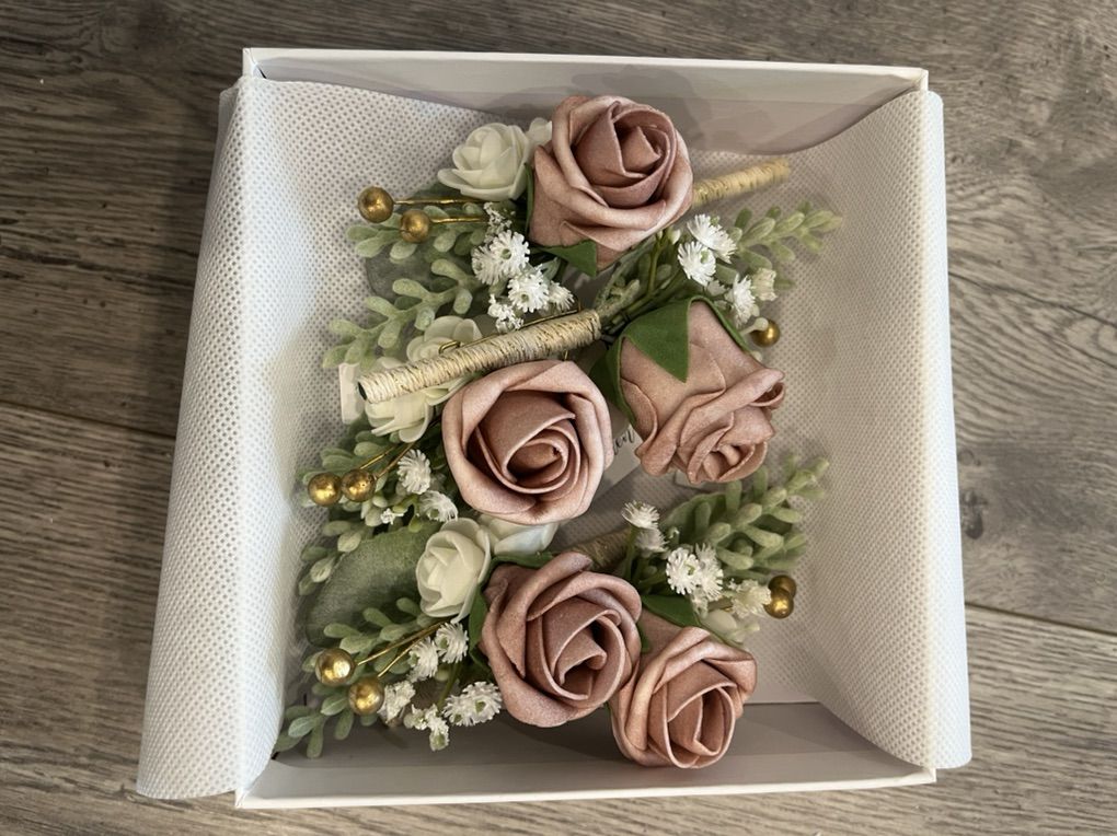 Selling 11 Ling’s Moment boutonnieres in dusty rose/pink. Originally from two 6-piece sets (one piece missing). You would get 1 white flower boutonnière and 10 in dusty rose.