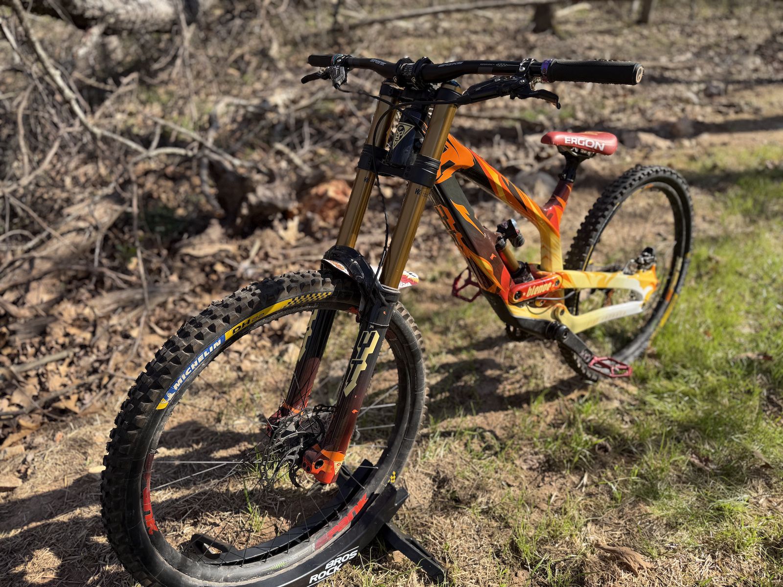 BIKE DETAILS Frame: YT TUES – 27.5” (Small) Fork: Fox 40 – 190mm Shock: Fox Float X2 Brakes: SRAM Code RSC w/ 203mm Galfer rotor Drivetrain: SRAM X01 / SB One Singlespeed Wheelset: Spank 359 Tires: Maxxis Assegai 2.5 Cockpit: Spank Spike Bars (790mm) Saddle: Ergon