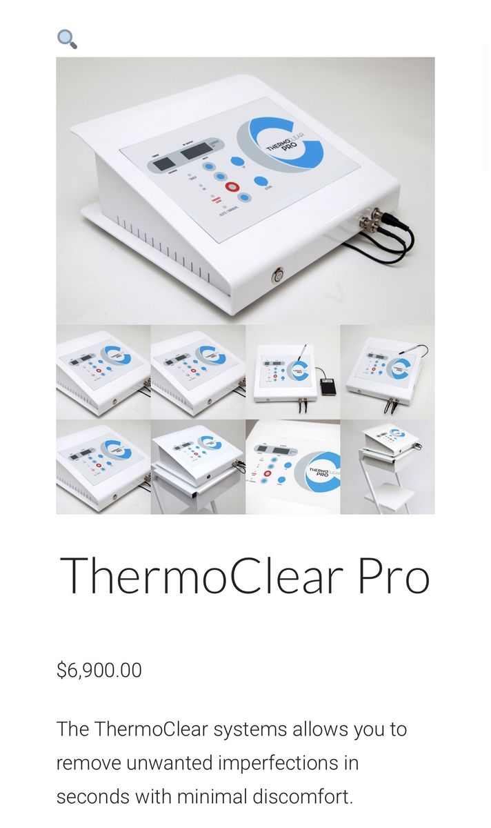 The ThermoClear systems allows you to treat unwanted imperfections in seconds with minimal discomfort. This radio frequency machine (low and high radio frequency) will help you treat sun spots, age spots, moles, acne scars, injury scars, cholesterol deposits, sebaceous hyperplasia, keratosis, fibromas, skin tags, cherry angiomas and spider capillaries, among others.