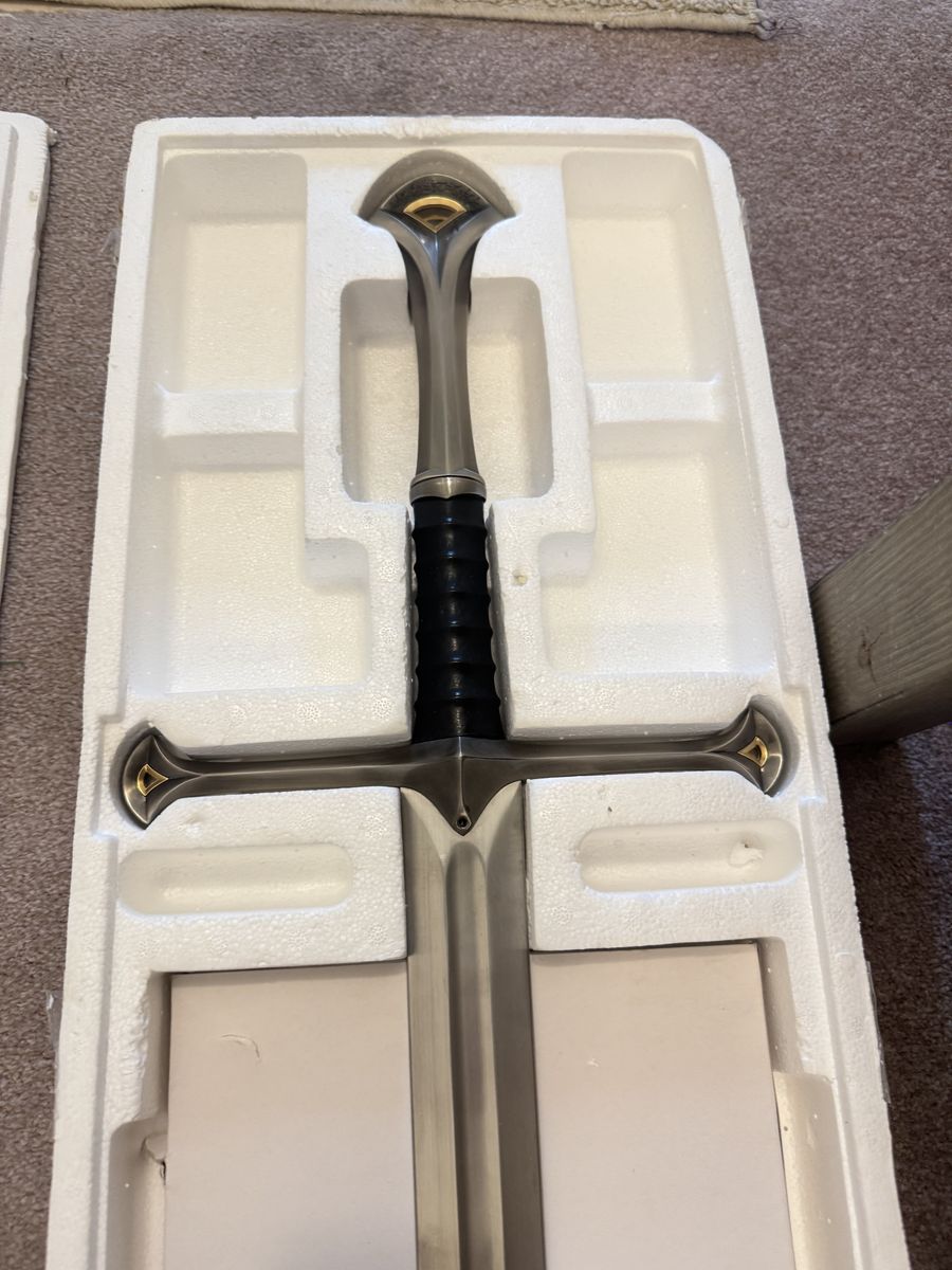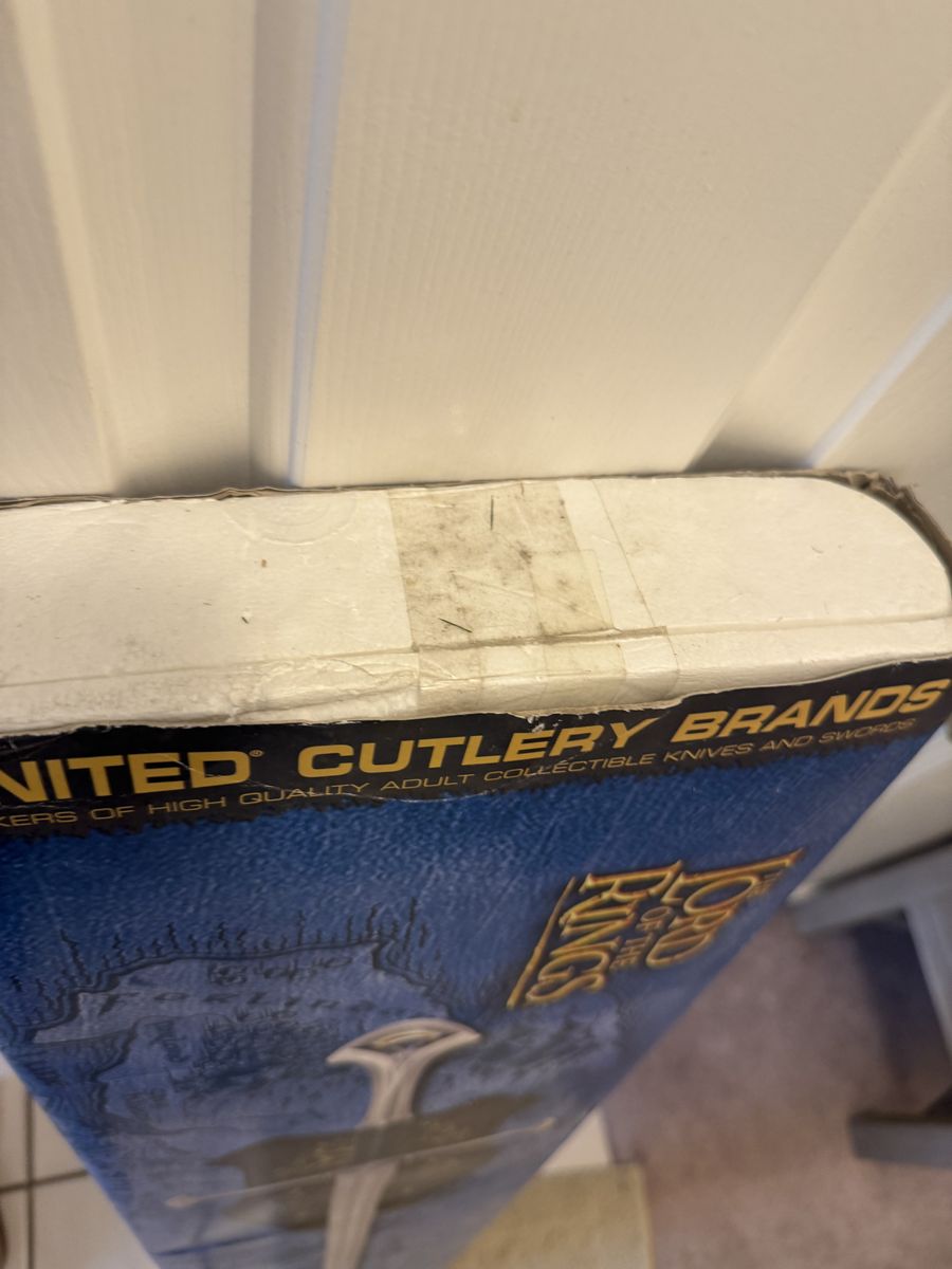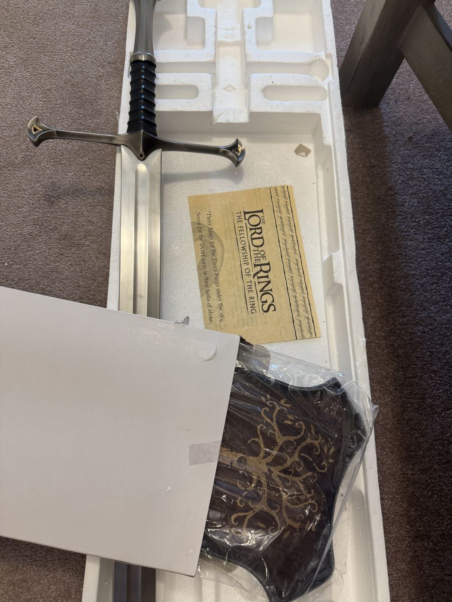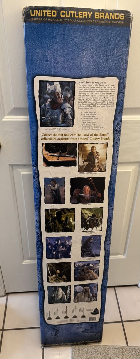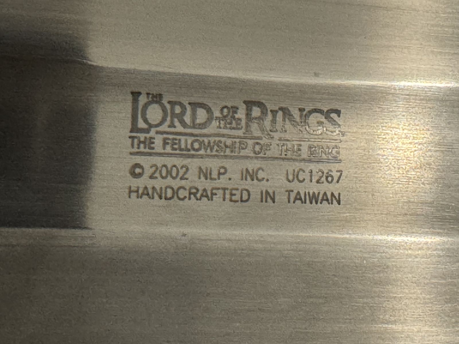 ZelleLord of the Rings United Cutlery reproduction sword of Elendil called Narsil (later becomes Aragorn’s sword). Made in 2002. All original packaging, paper of authenticity, and never-used display plaque w/ screws.