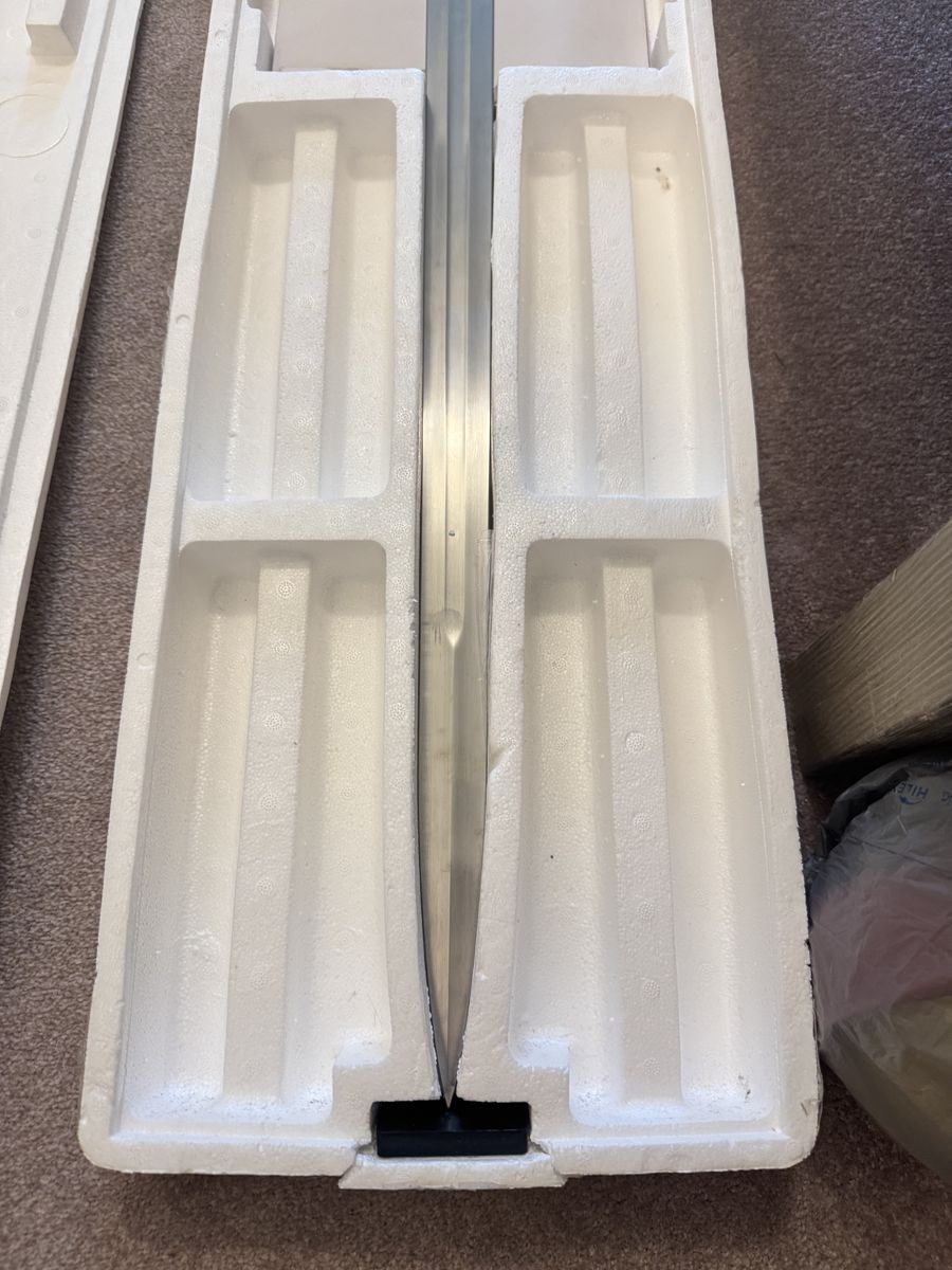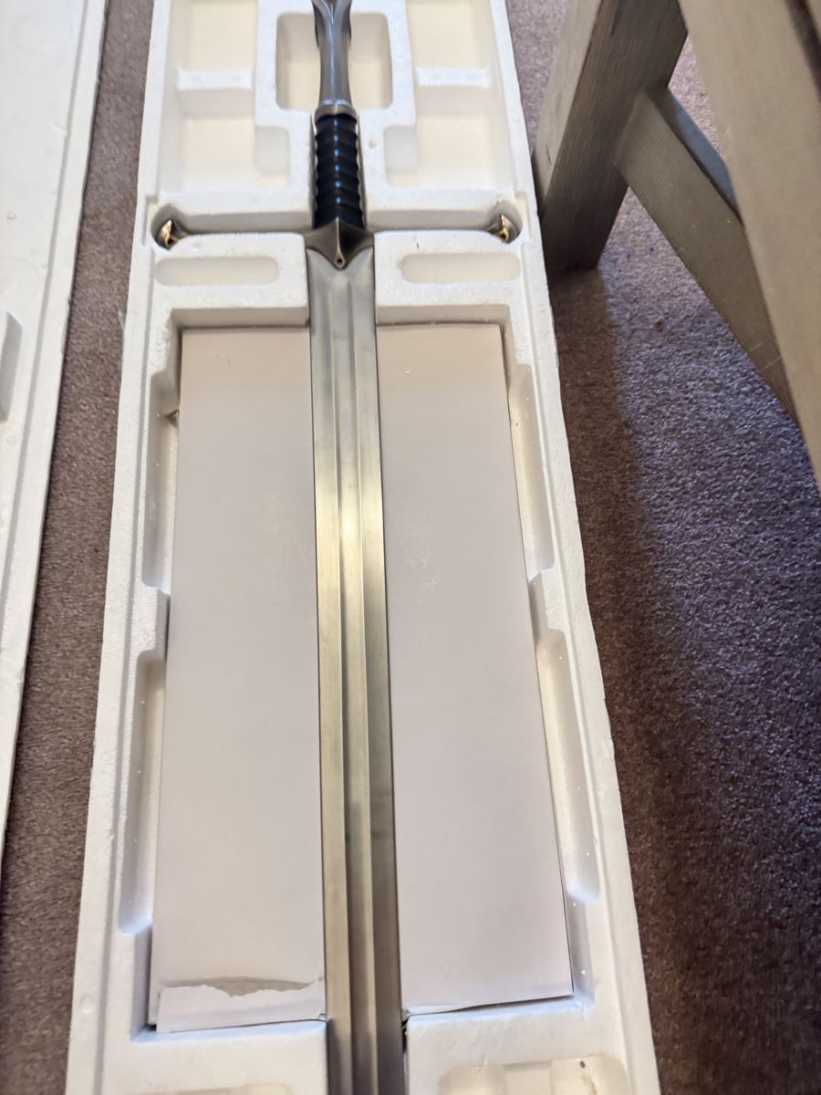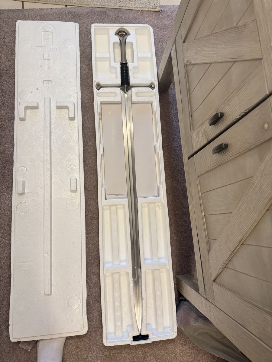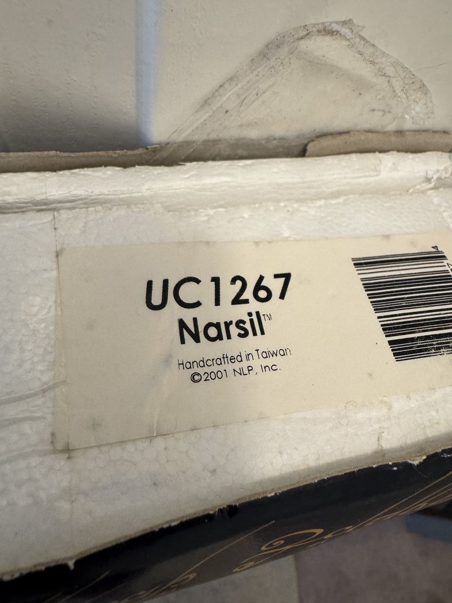 ZelleLord of the Rings United Cutlery reproduction sword of Elendil called Narsil (later becomes Aragorn’s sword). Made in 2002. All original packaging, paper of authenticity, and never-used display plaque w/ screws.