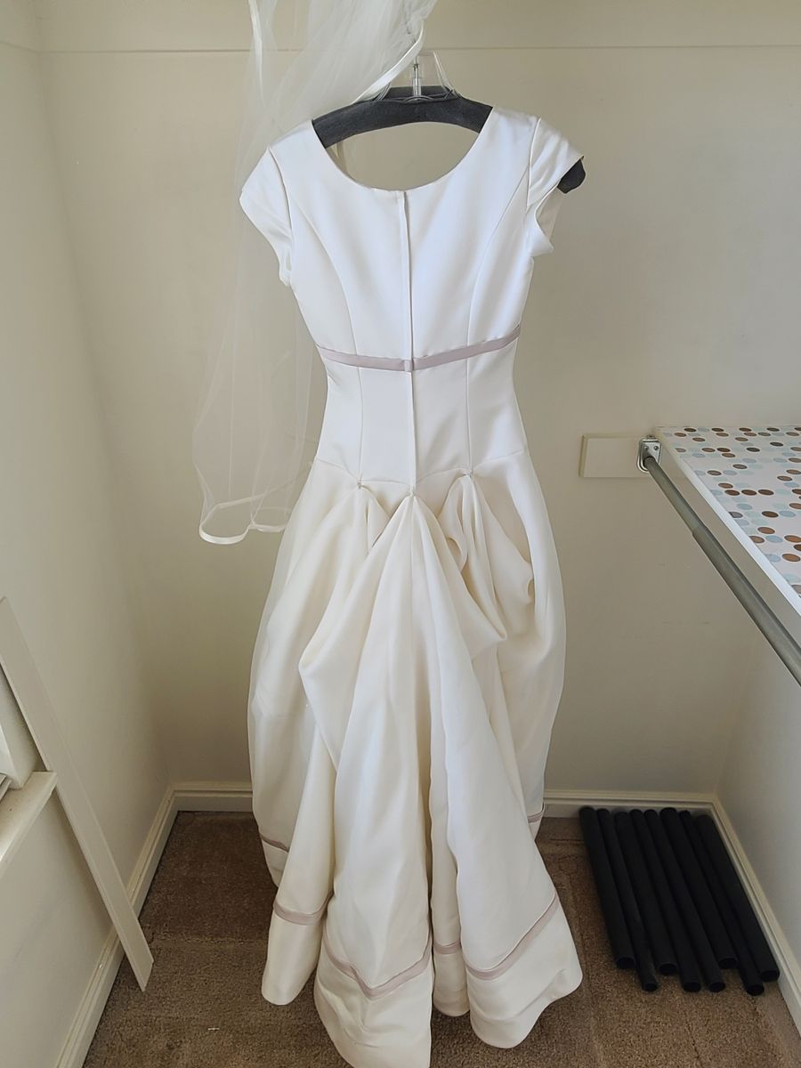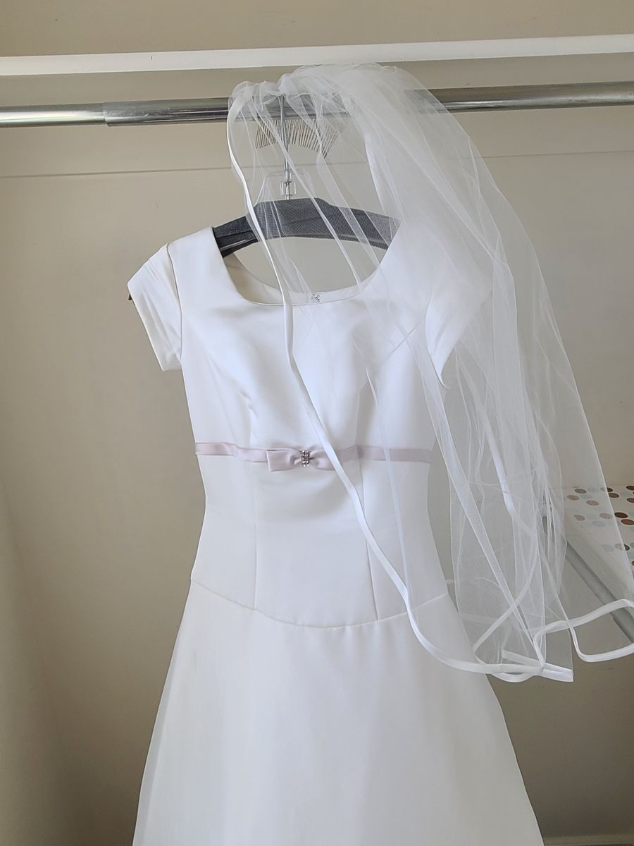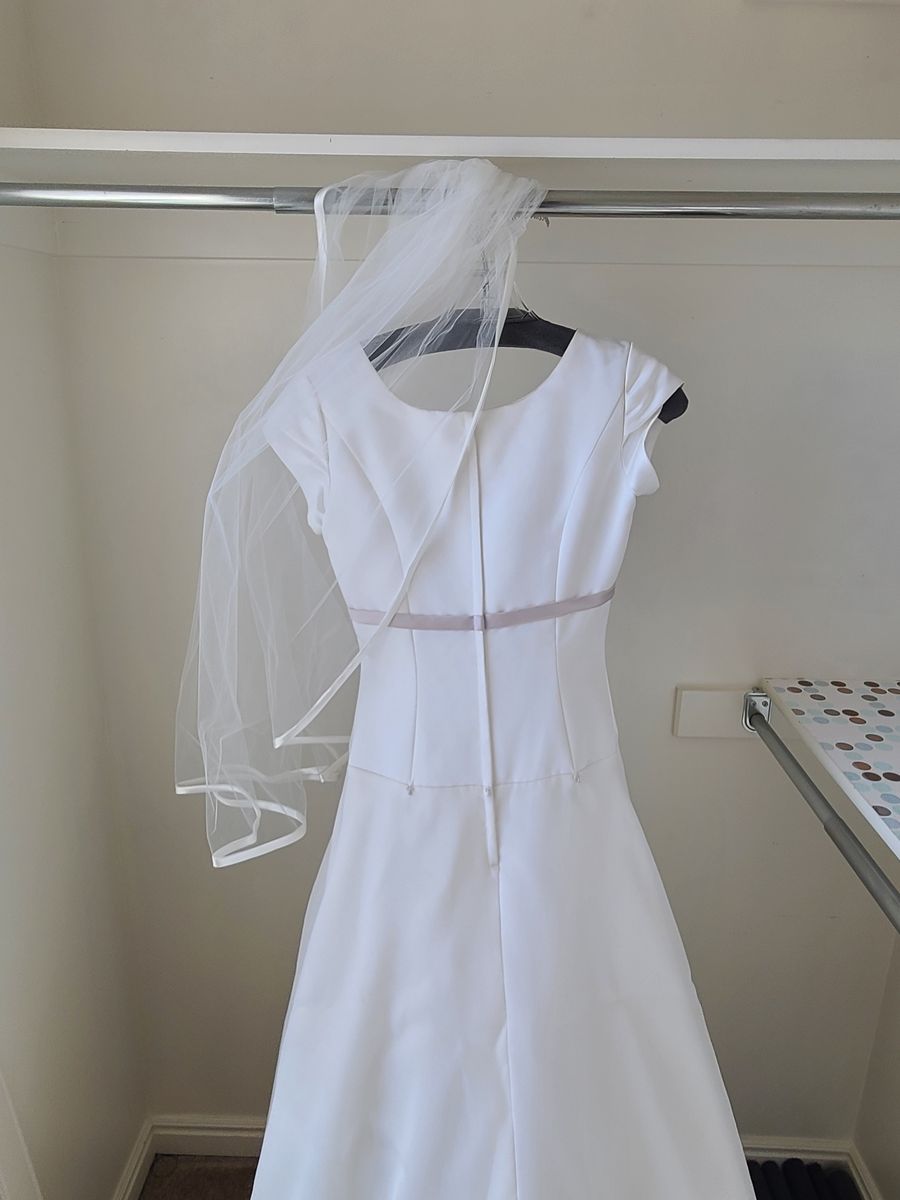 VenmoWedding dress with accompanying veil. Used but in good condition. Size 0. Adjustable train to flow or hook on back of dress.