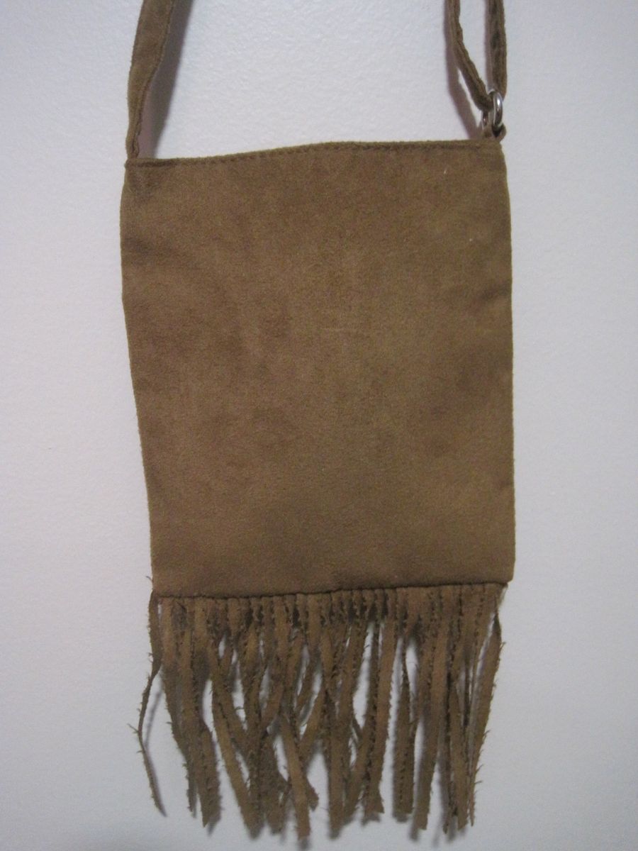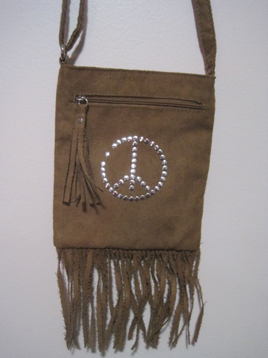 The Justice Brown Suede Crossbody Shoulder Bag is a small rectangular bag with a zip closure and brown suede exterior and lining. It features a peace sign hippie theme with whipstitch and fringe accents, making it a unique and stylish accessory for travel, parties, or casual outings. The bag has a crossbody strap in brown suede with silver hardware, allowing for easy and adjustable wear. The bag is designed for women and exudes a hipster aesthetic with a touch of retro flair.