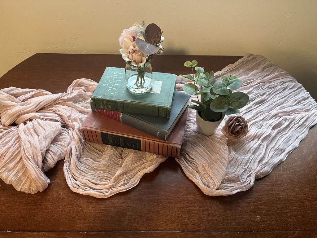 Set of 10 light pink cheesecloth table runners, perfect for weddings, baby showers, or spring events.\