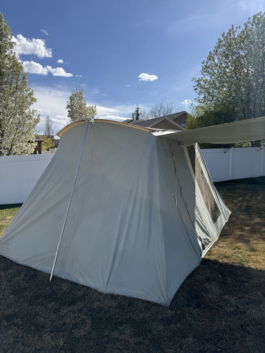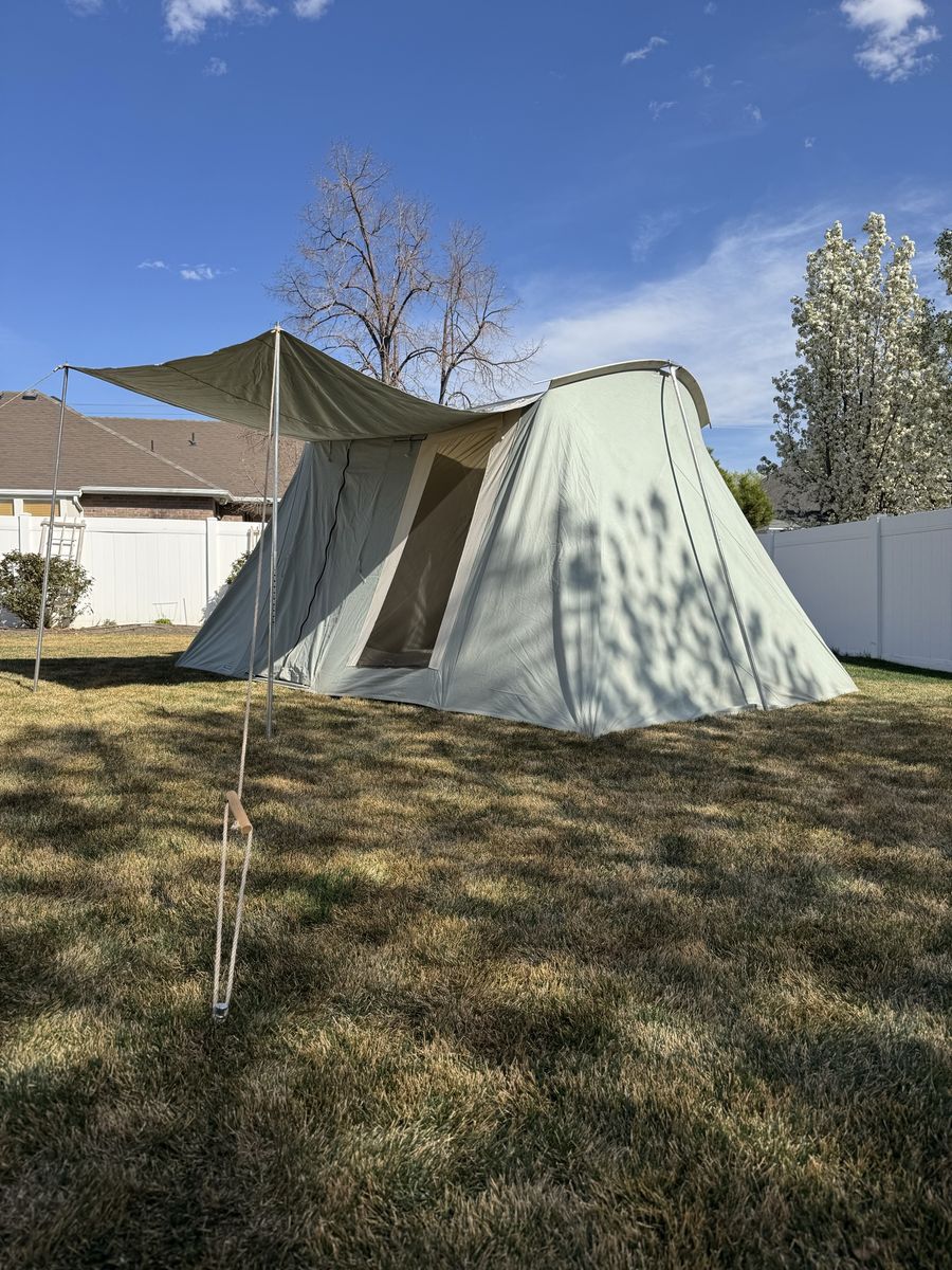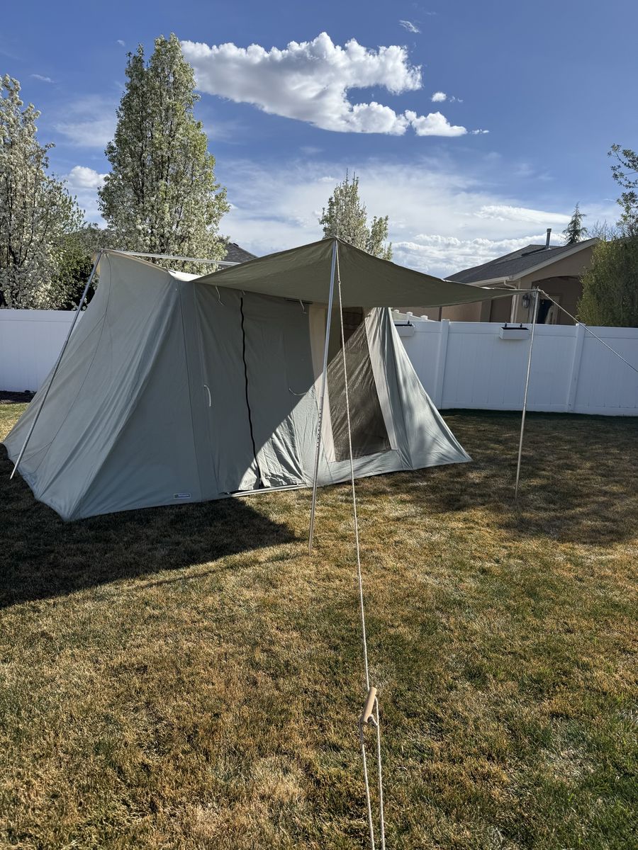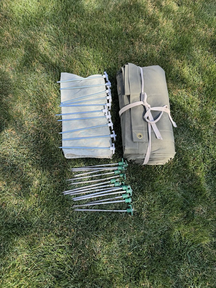 Venmo10’x14’ Kirkham’s Spring Bar tent. Gently used and well taken care of. Hate to see it go. No rips, tears, or holes. All zippers work like new. This tent has never seen rain. Heavy duty ground tarp, extra tent stakes, all poles, canopy ropes, and all original carry bags included. $975.00.