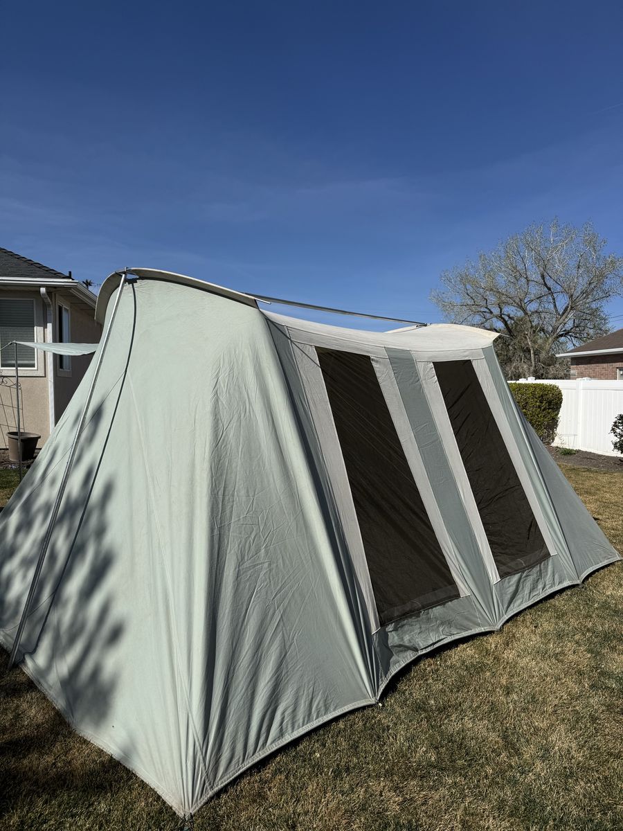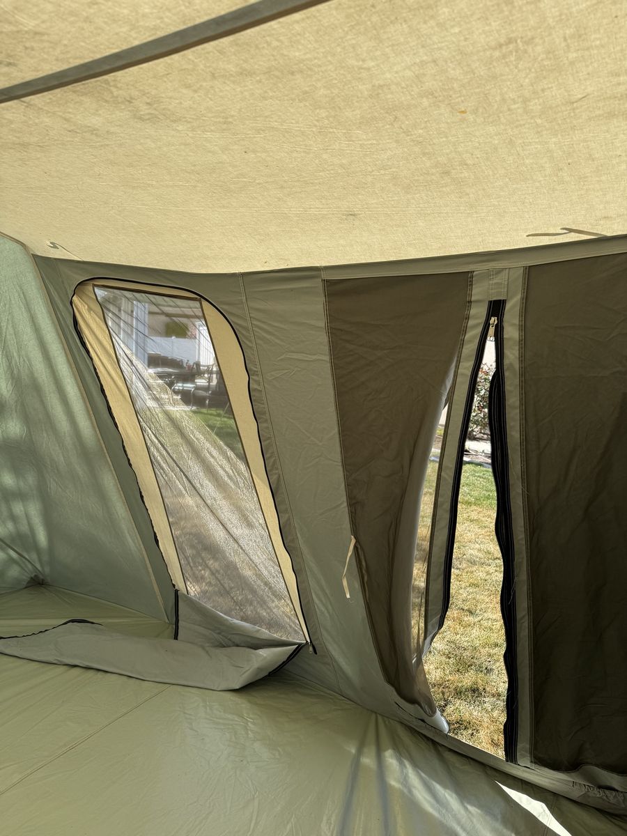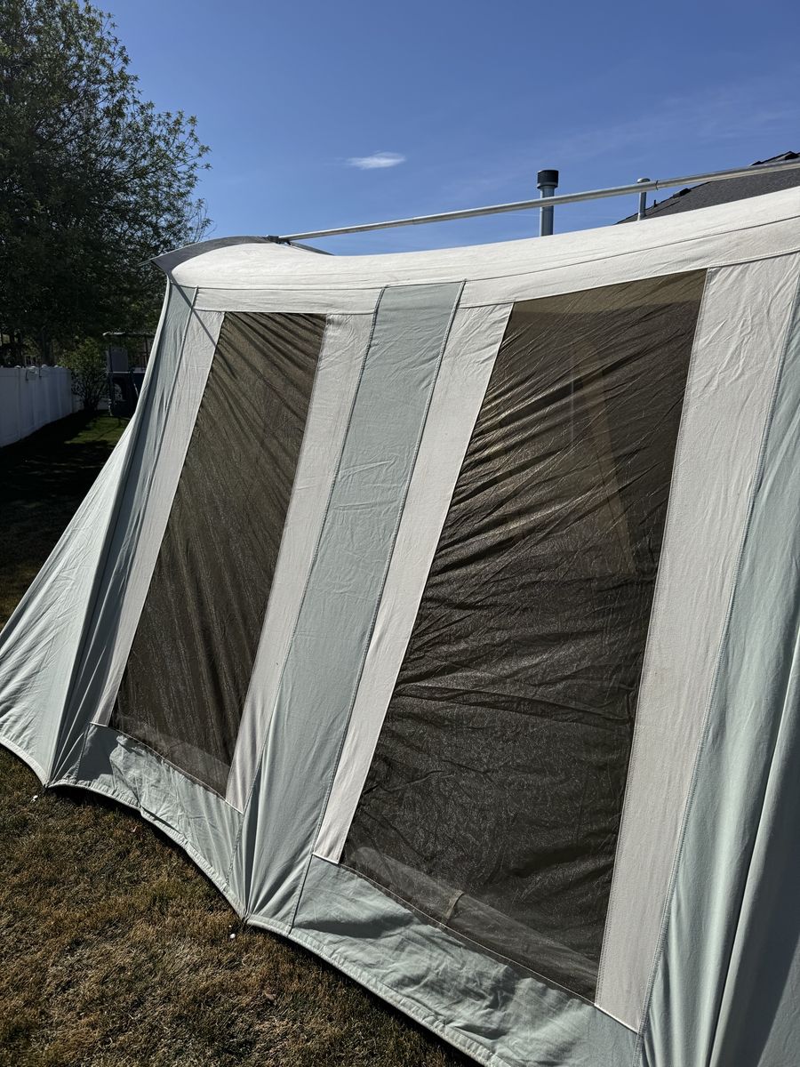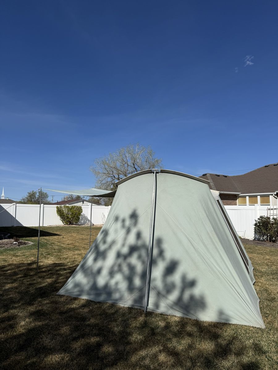 Venmo10’x14’ Kirkham’s Spring Bar tent. Gently used and well taken care of. Hate to see it go. No rips, tears, or holes. All zippers work like new. This tent has never seen rain. Heavy duty ground tarp, extra tent stakes, all poles, canopy ropes, and all original carry bags included. $975.00.