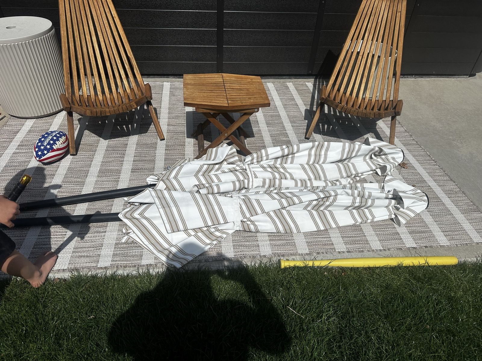 Both umbrellas are used but in good condition. One umbrella has a broken rib, but it should be an easy fix if you’re handy.