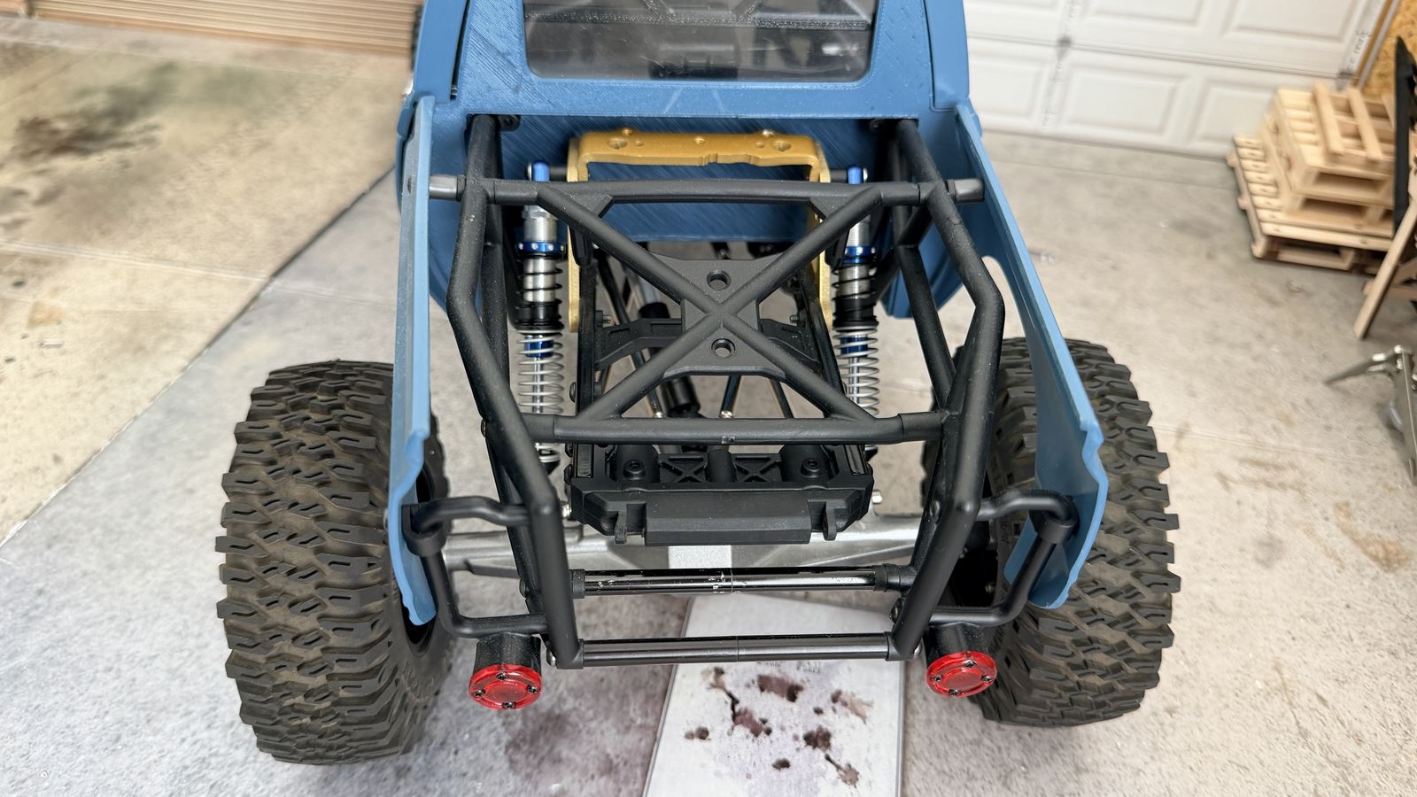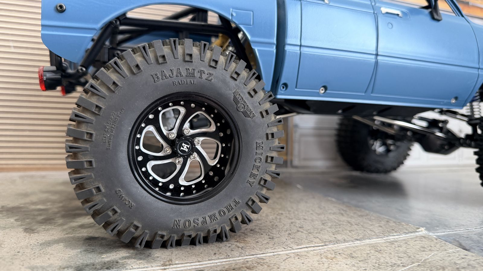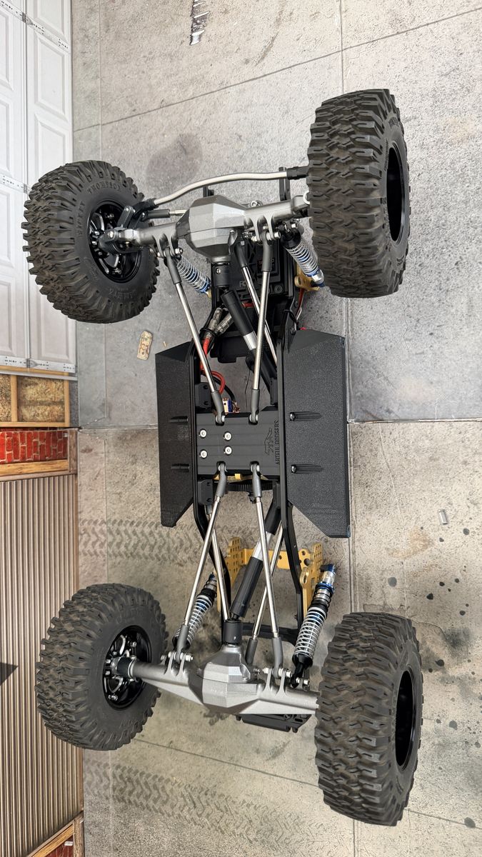VenmoRC4WD 4door body Vanquish Phoenix rear cage Artful Dodgers Fox Belly transmission Artful Dodgers Shock Towers Metal axles Bowhouse battery tray Proline Pro-spec shocks (90mm & 100mm) Interior with 3d printed detail parts RC4WD 2.2 Mickey Thompson tires (4.75” tall) 2.2 metal beadlock wheels