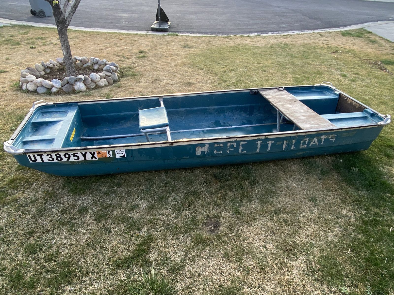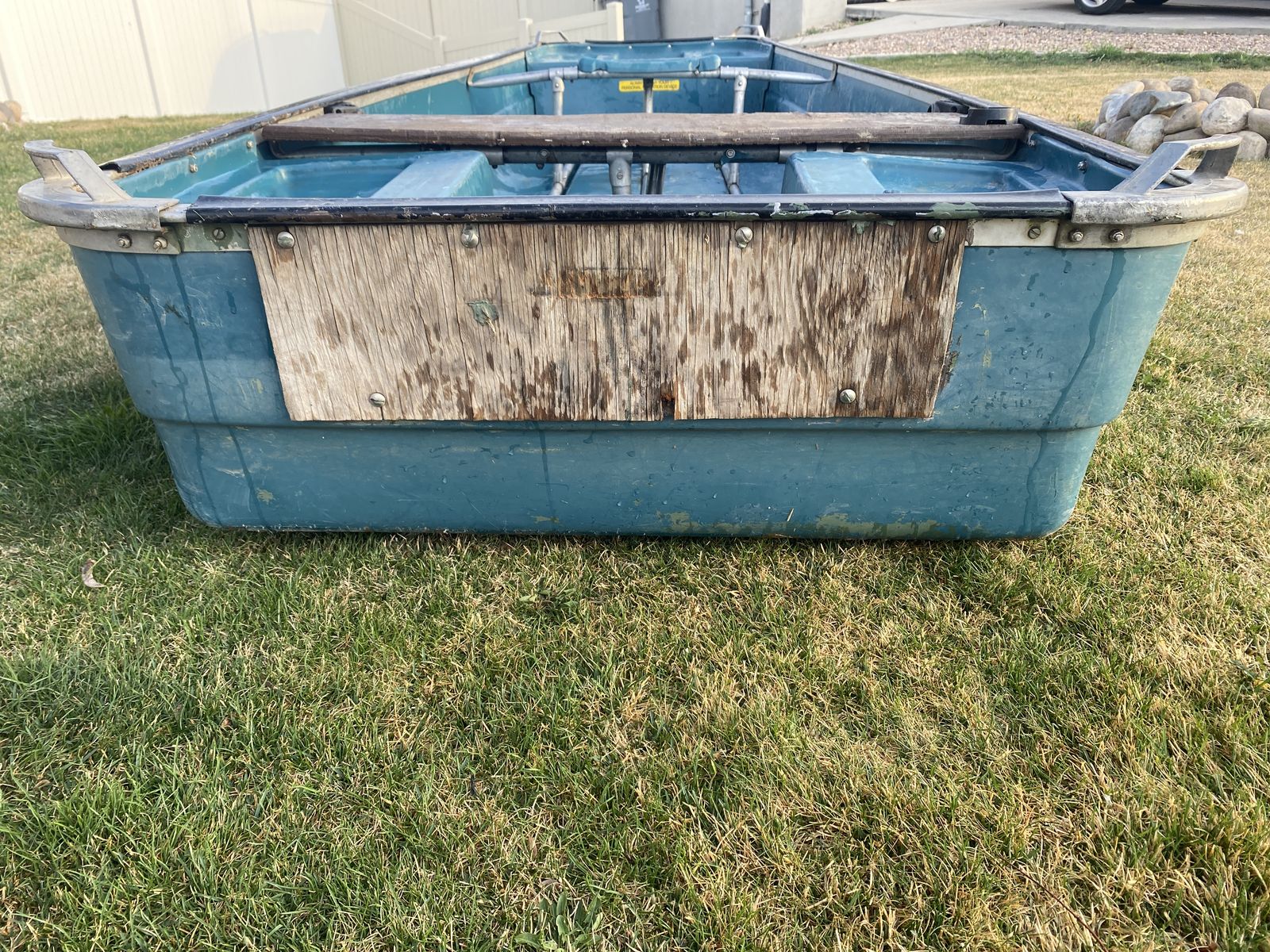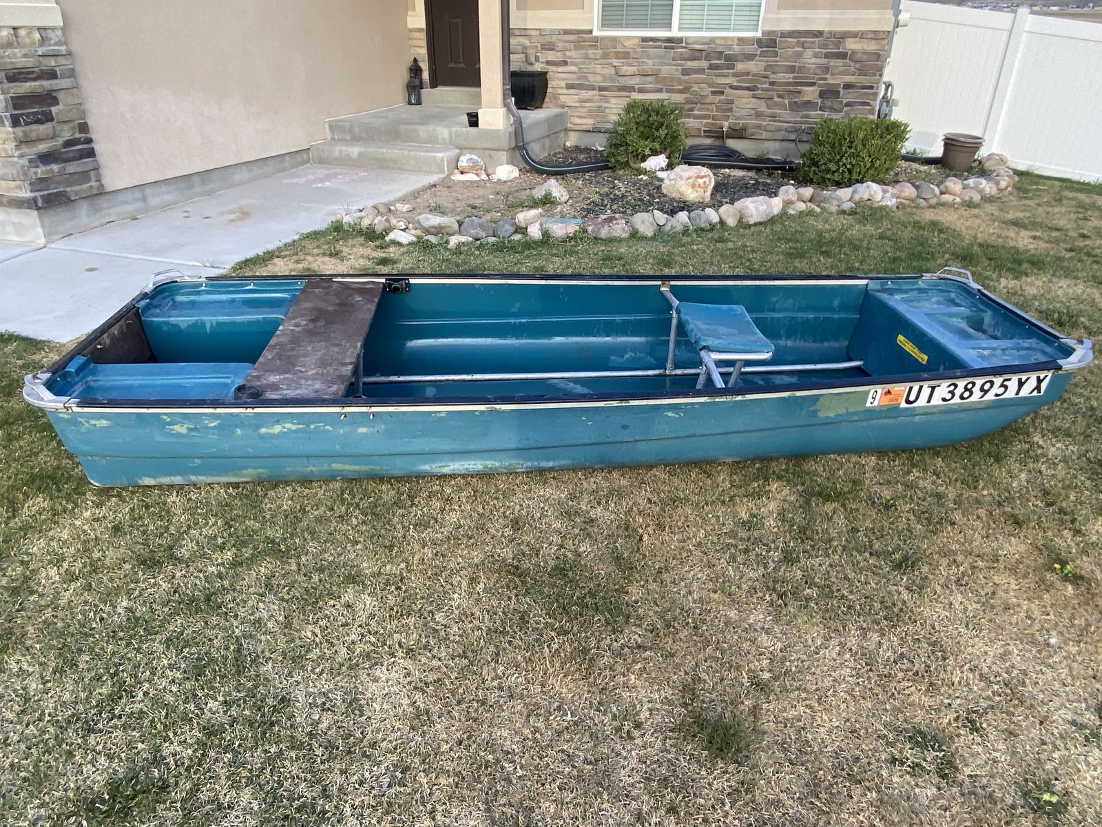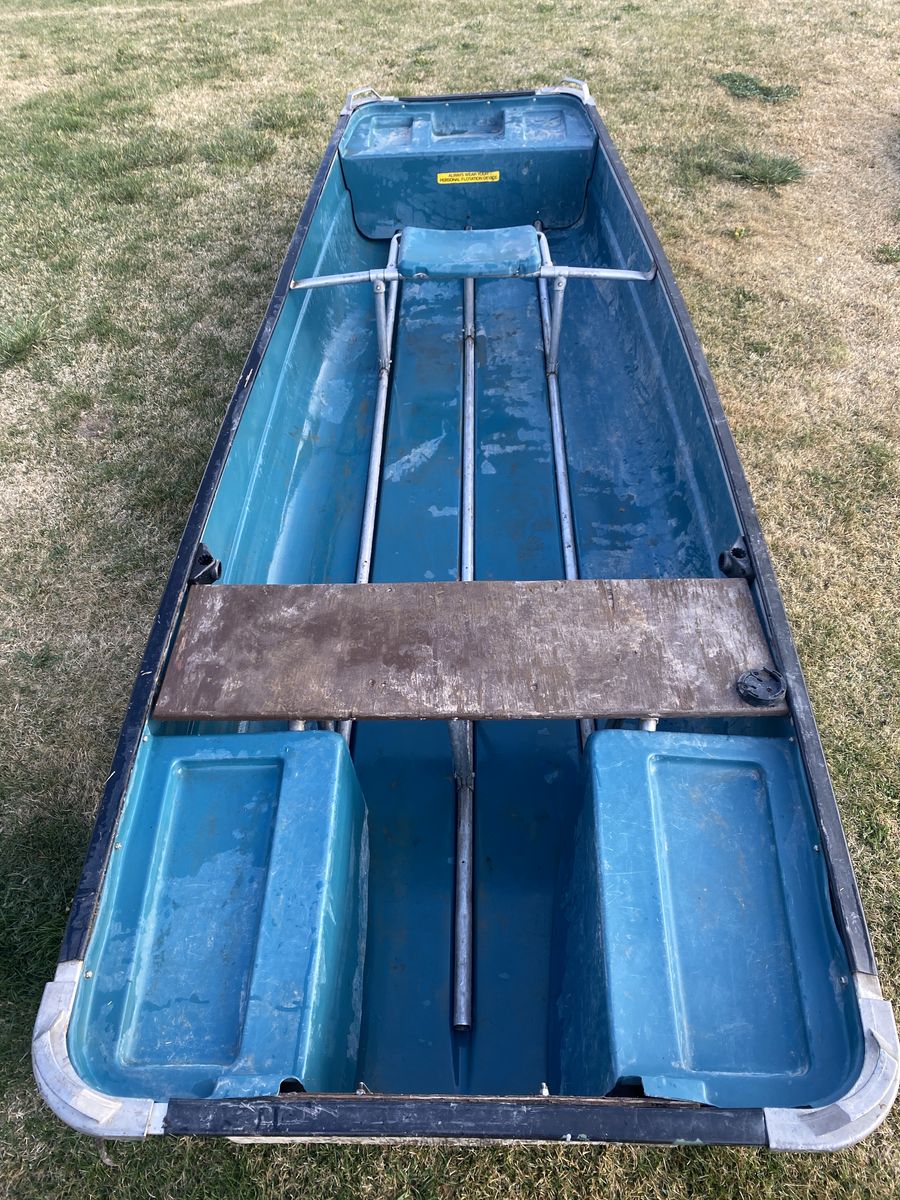 Venmo12 foot plastic Jon boat Beefed uo transom and three patched holes but no leaks it has been on the water 50 plus times since they have been patched