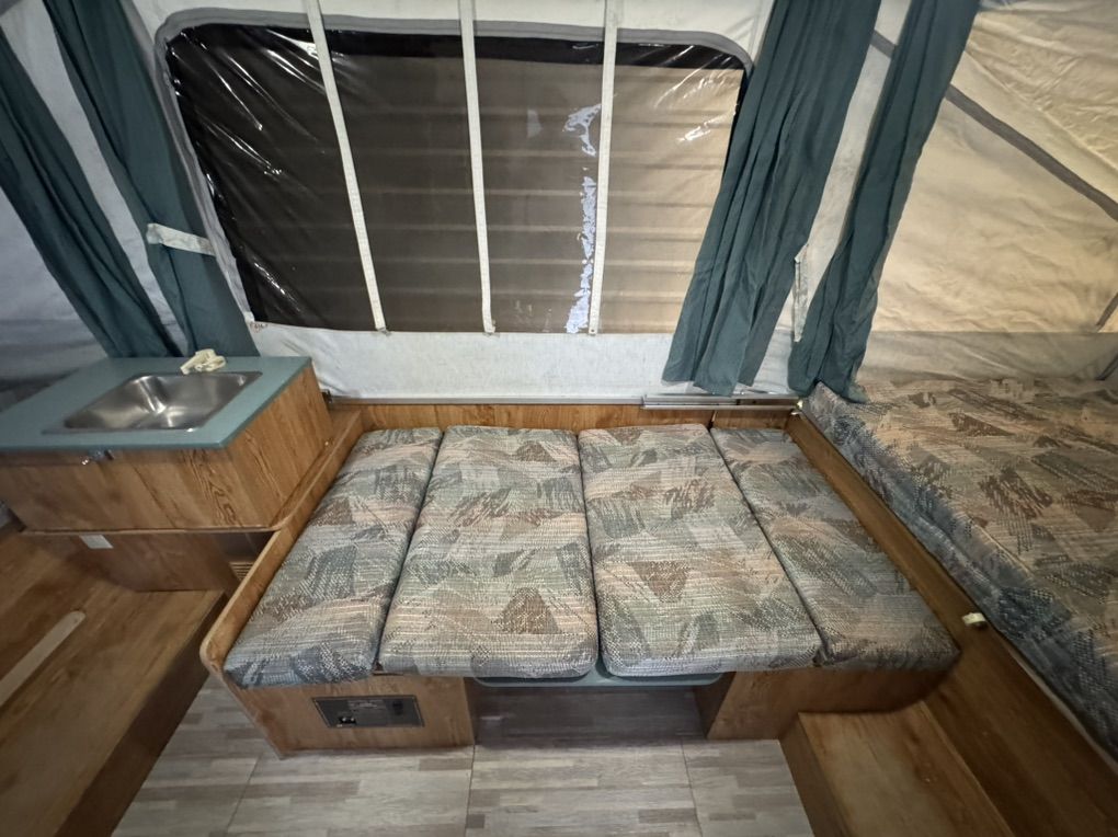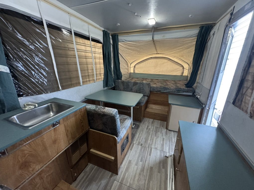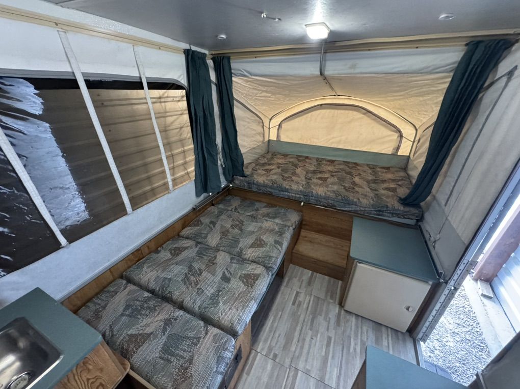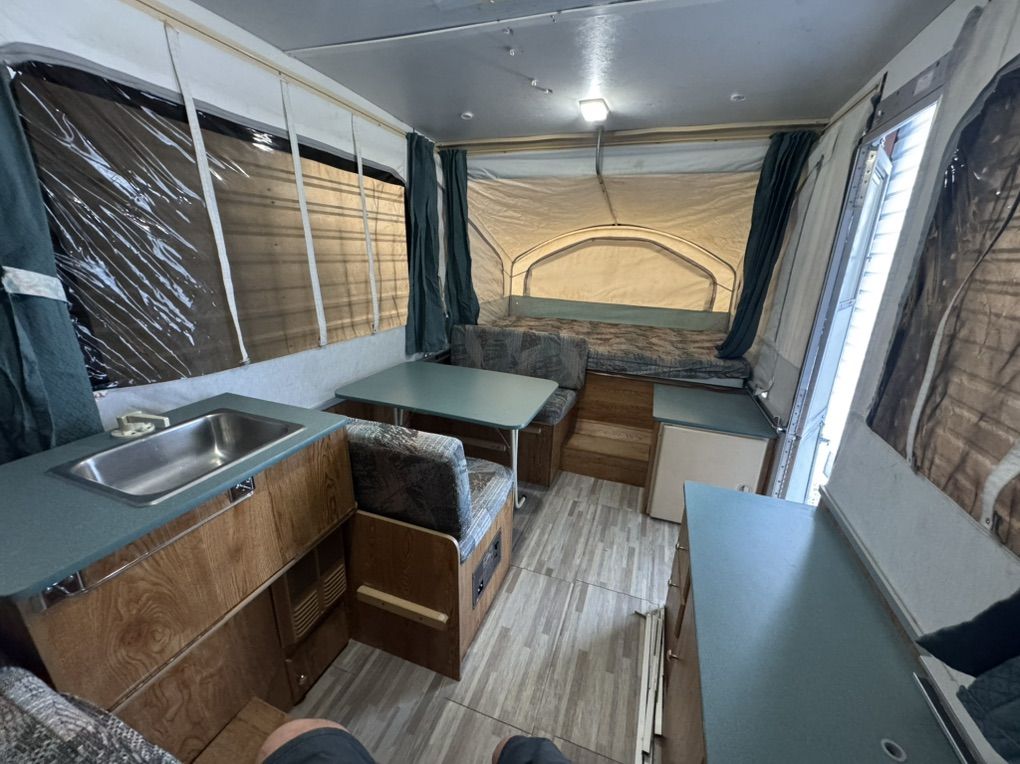 VenmoClean Viking 1706 tent trailer. Roof is in Awsome condition!! Never any leaks Sleeps 6 with two double beds up front, with additional table bed Canvas/screens in amazing like new condition and thick quality canvas/vynl they don’t put in the latest models Sink with large water tank - works great All electrical works great Brand new outside attachable barbecue gas grill with case Electronically controlled thermostat heater- needs igniter 5g propane tank All interior/exterior lights work excellent 110v electrical hookups. Tires/spare are in excellent shape Exterior awning Has been Garaged every winter. It is in extremely clean inside Clean thick mattresses -no pets or smoking extremely light at only 1260 pounds anything can tow it so easily All the curtains are clean and work great lift cranks up and down like brand new Smoothly and effortlessly