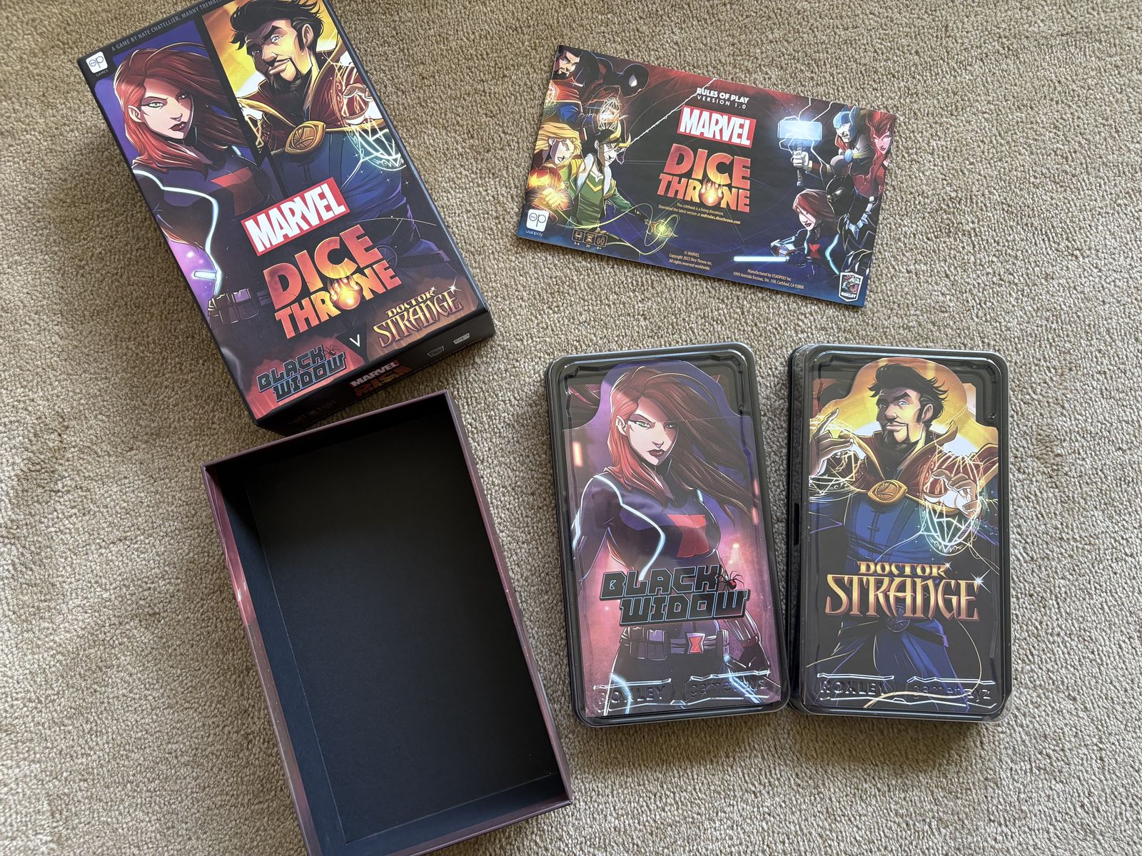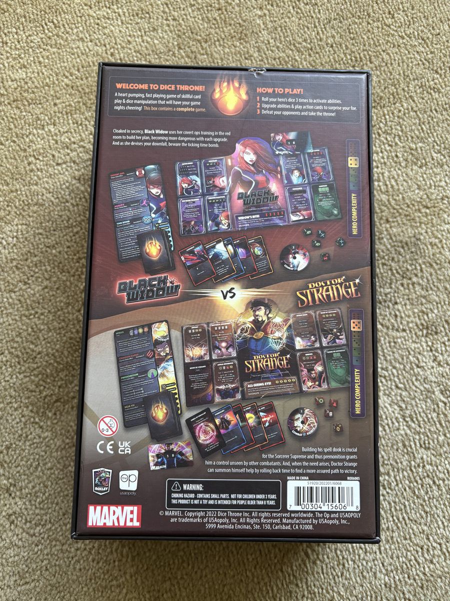 COMPLETE Marvel Dice Throne Game (Black Widow vs. Doctor Strange). The OP Games, 2022. Complete, no missing pieces. Excellent condition, some cards still sealed. Text only. Cash or Venmo. Discount on multiple items.