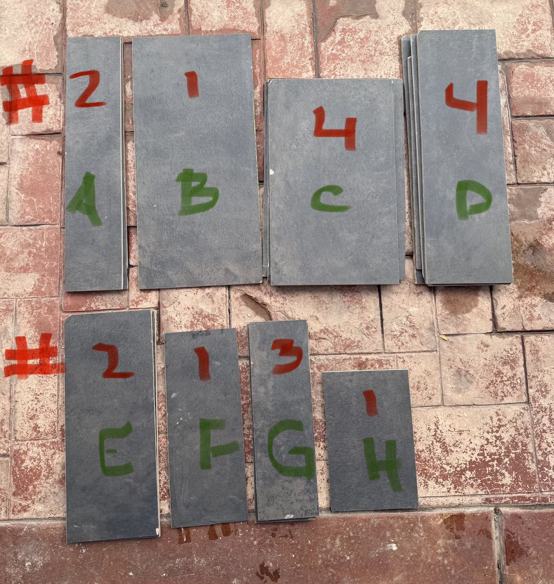 A= 2 qty, 4.75 x 23.25 B= 1 qty, 10.75 x 23.5 C= 3 qty, 11 x 18.5 D= 4 qty, 7.25 x 23.25 E= 2 qty, 7.5 x 18.25 F= 1 qty, 6.25 x 15.75 G= 3 qty, 5 x 16 H= 1 qty, 7.25 x 11.25