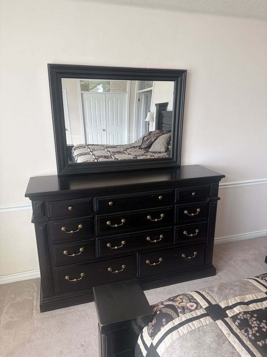 Large bedroom suite. king bed with storage and pillow top mattress. In excellent shape. Includes all pieces in pictures. $2400.00 O.B.O