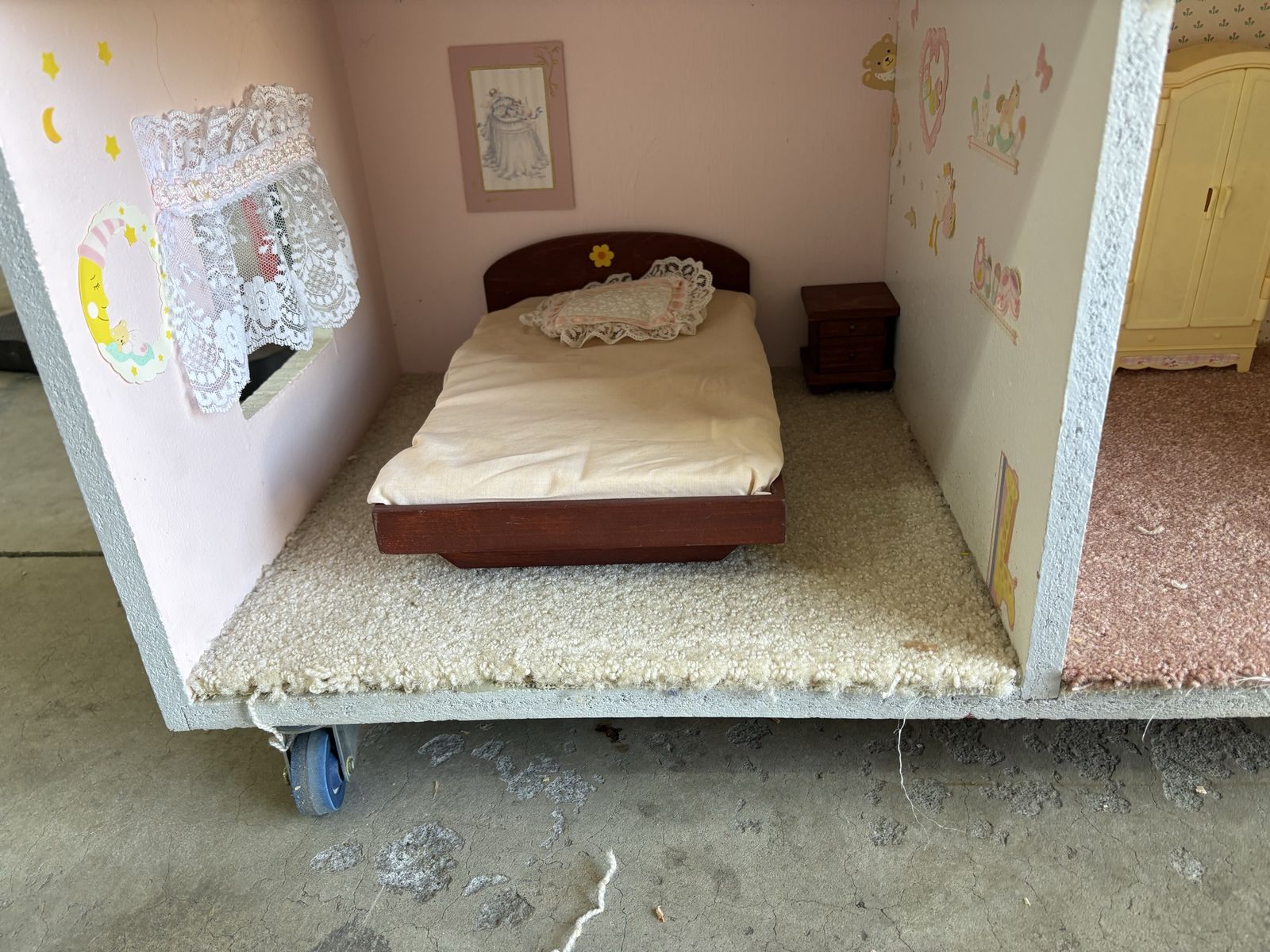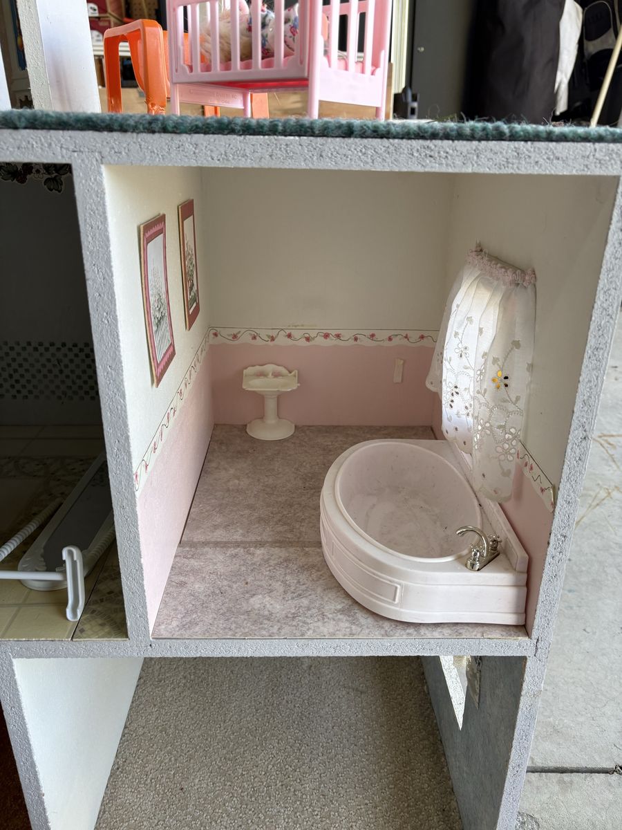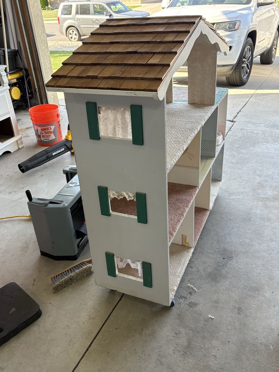 VenmoHomemade wooden Barbie dollhouse. Includes furniture for all of the rooms, 10 Barbies, Barbie jeep and Barbie Volkswagen bug. House is on castors so it is easy to move