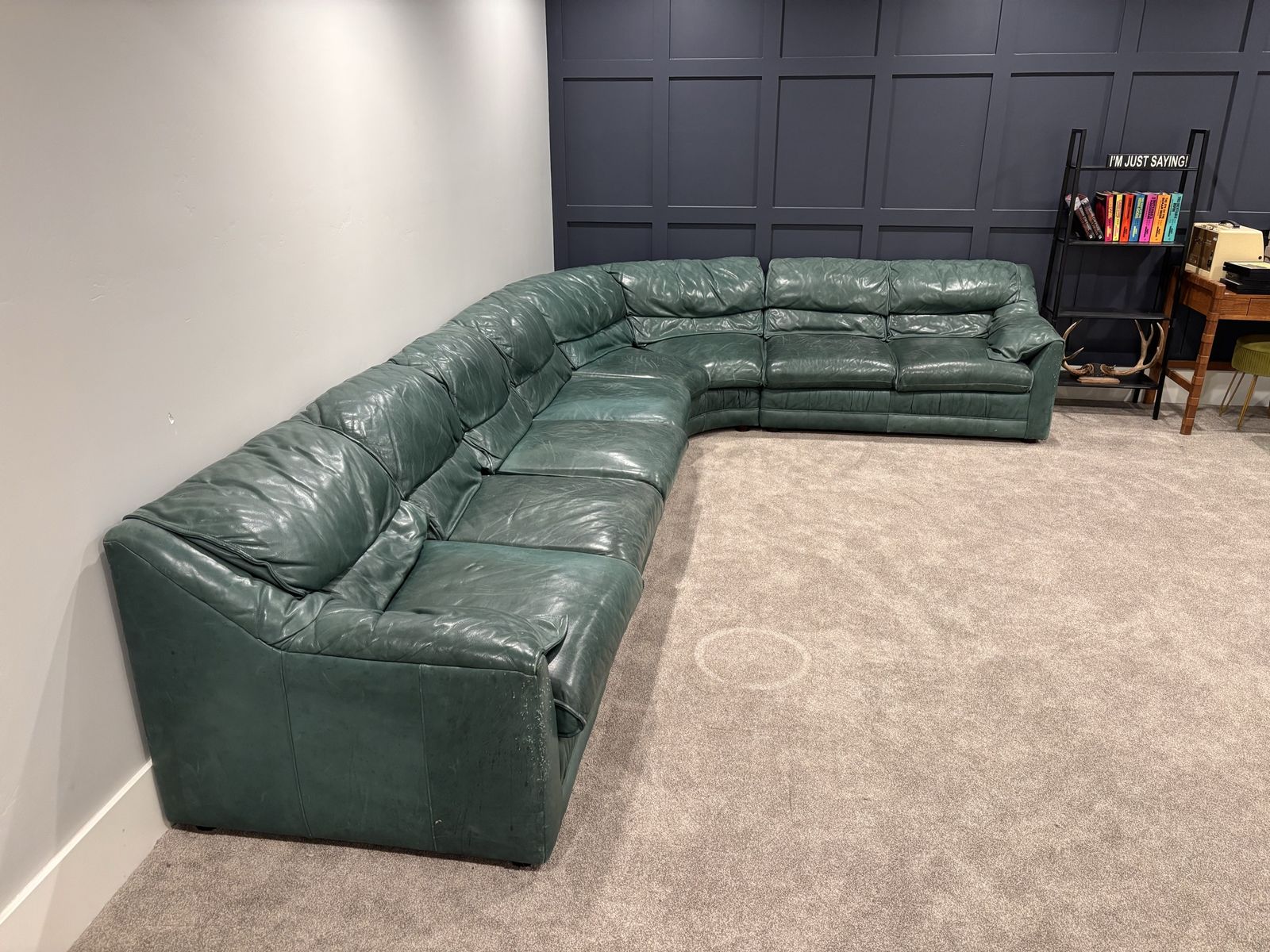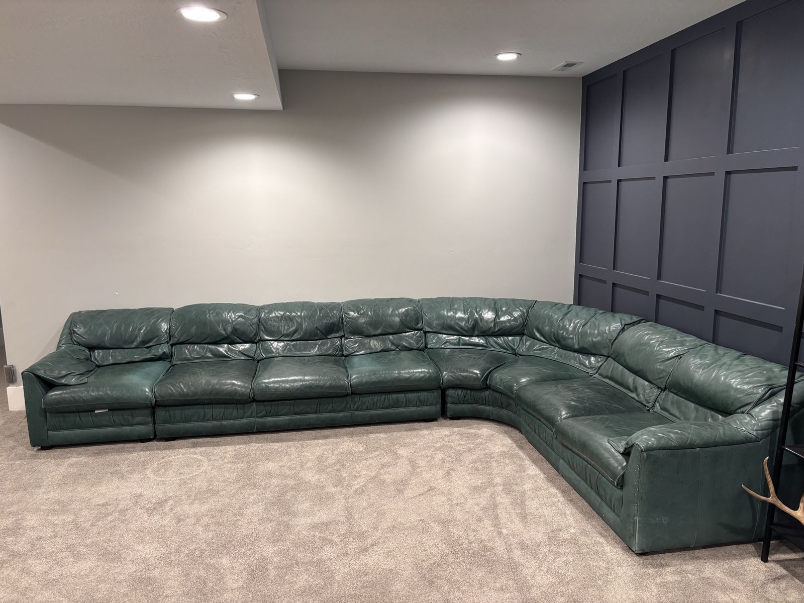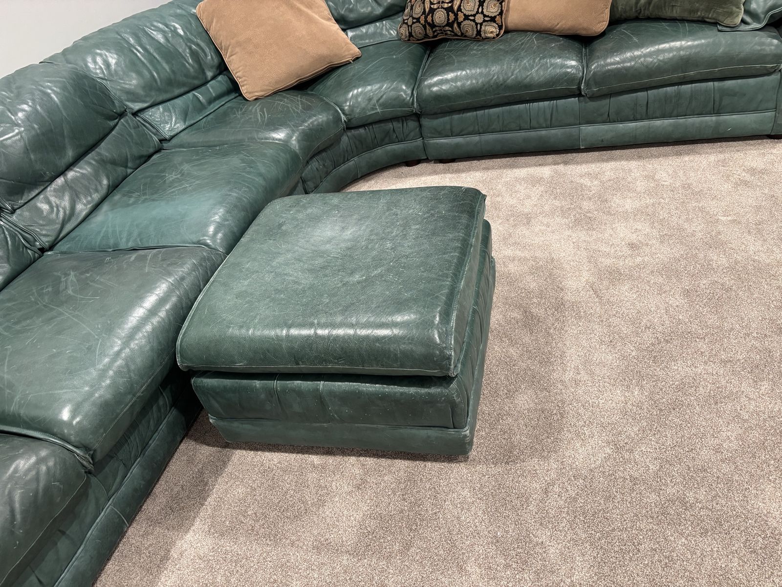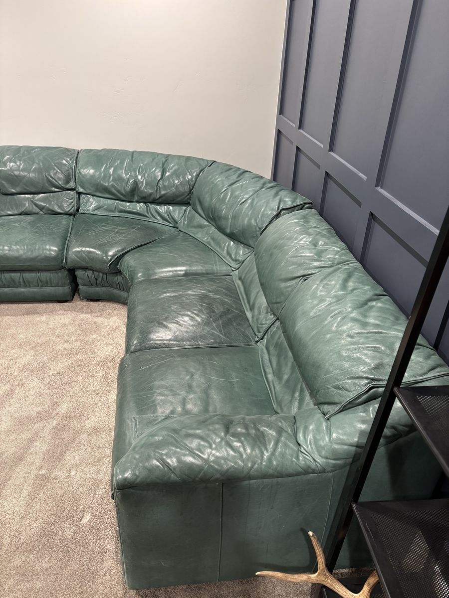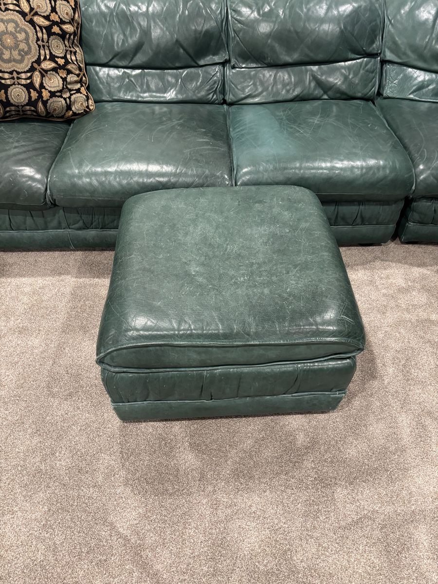 VenmoThis is a nice large green leather sectional. It has 3 sections, 1 long, the corner, 1 short, plus a small ottoman. Put together it is about 13ft 7in on the long side and about 9ft on the short side. There is some light damage from a cat and a dog that is superficial but not too bad. Still in great shape and very comfortable.