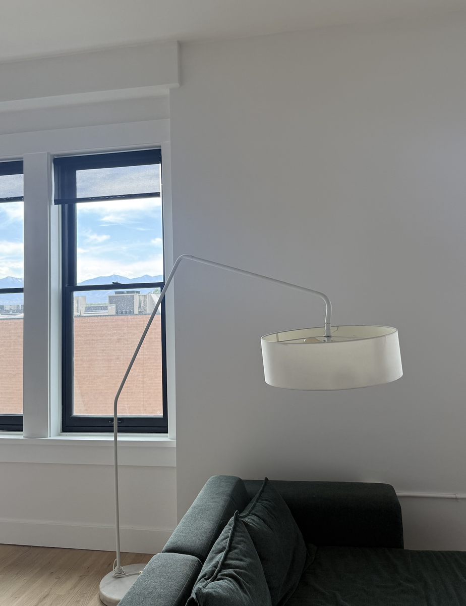 ZelleA lamp that knows its angles. The Heron lamp evokes the stately elegance of the bird it is named for. A wide circular shade is cantilevered from a solid, gleaming marble base by a twice-bent stem. Place the Heron Floor lamp wherever you need some soft, focused lighting.