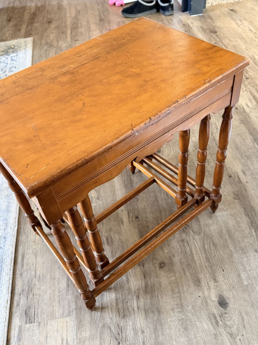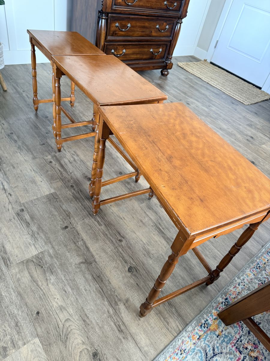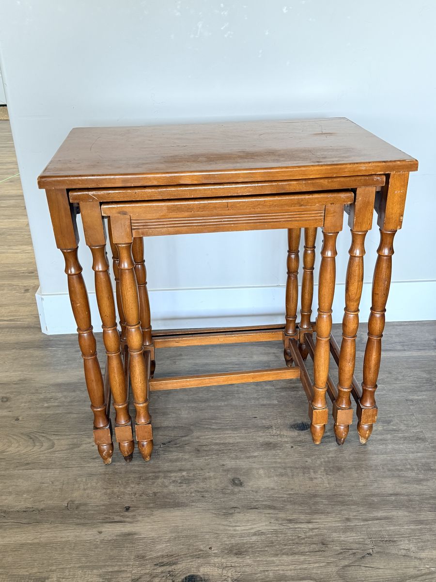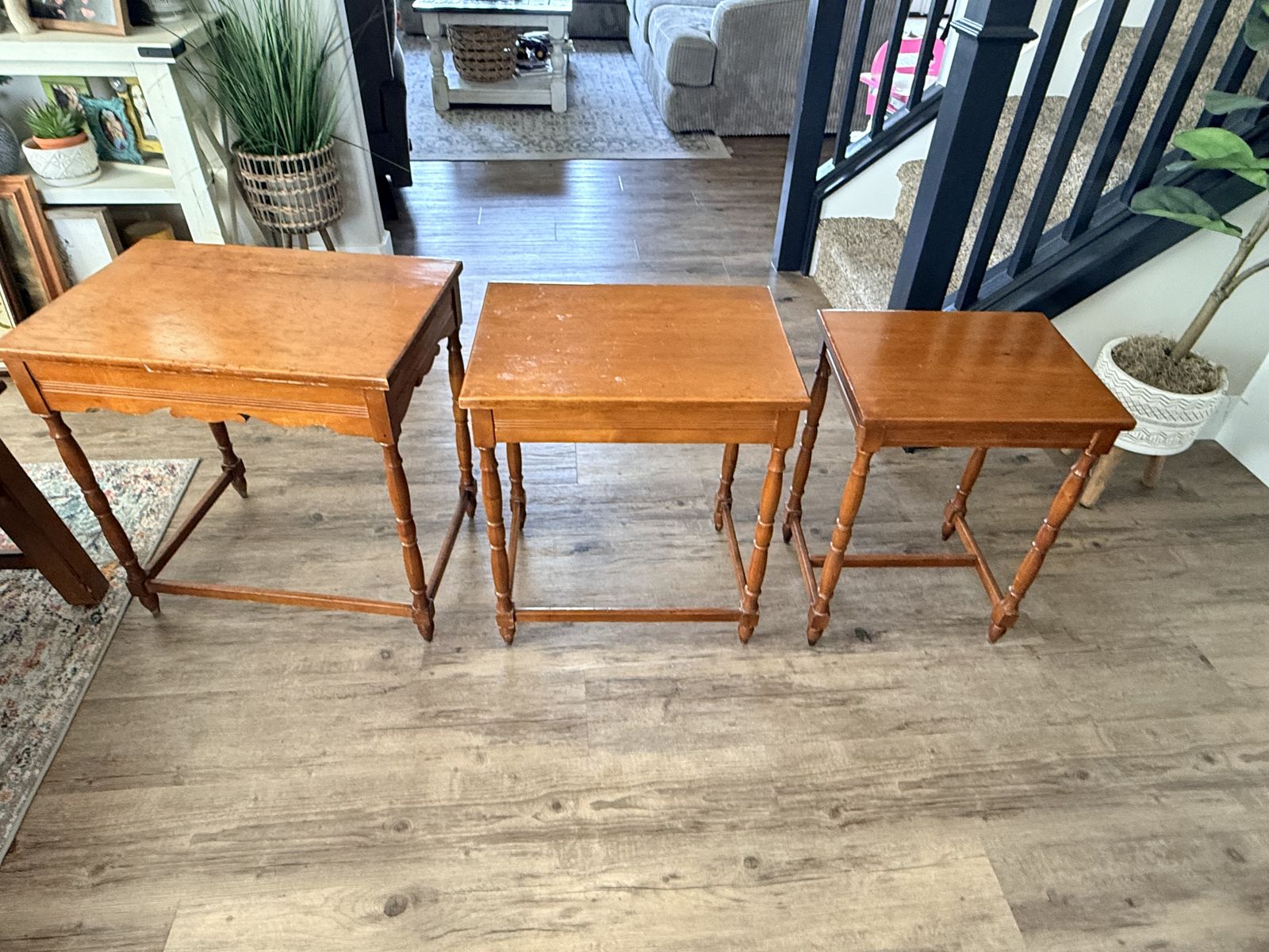 set of three vintage nesting tables features a traditional design often associated with mid-20th century colonial or farmhouse styles, likely dating from the 1950s to the 1970s.