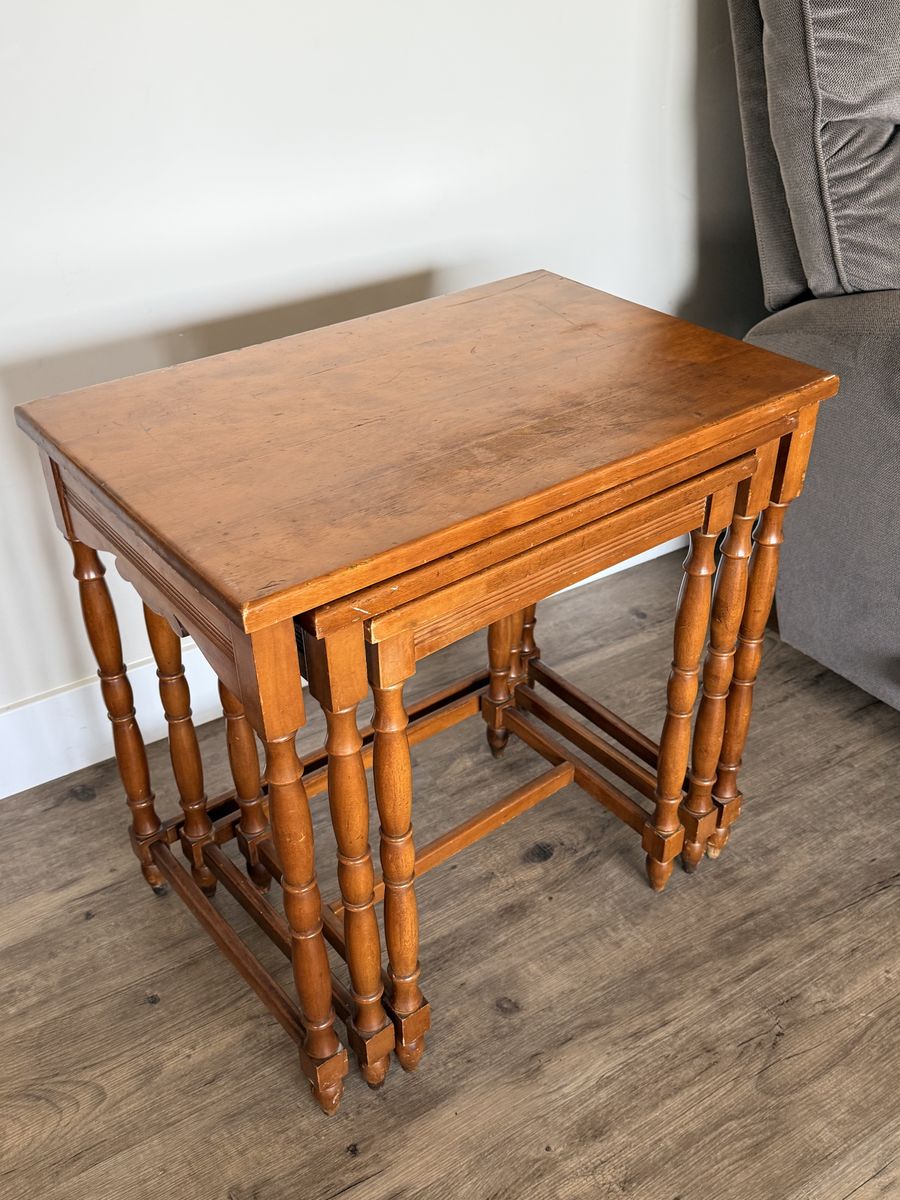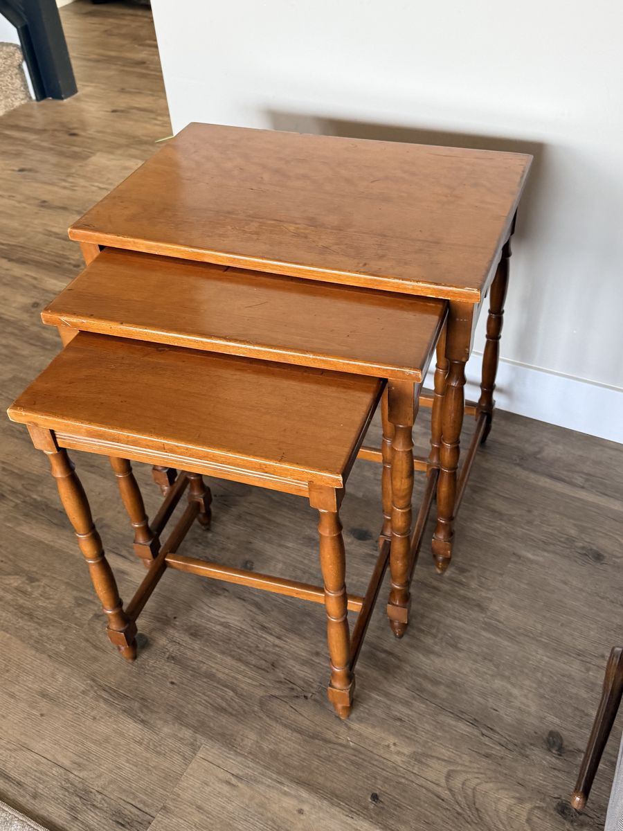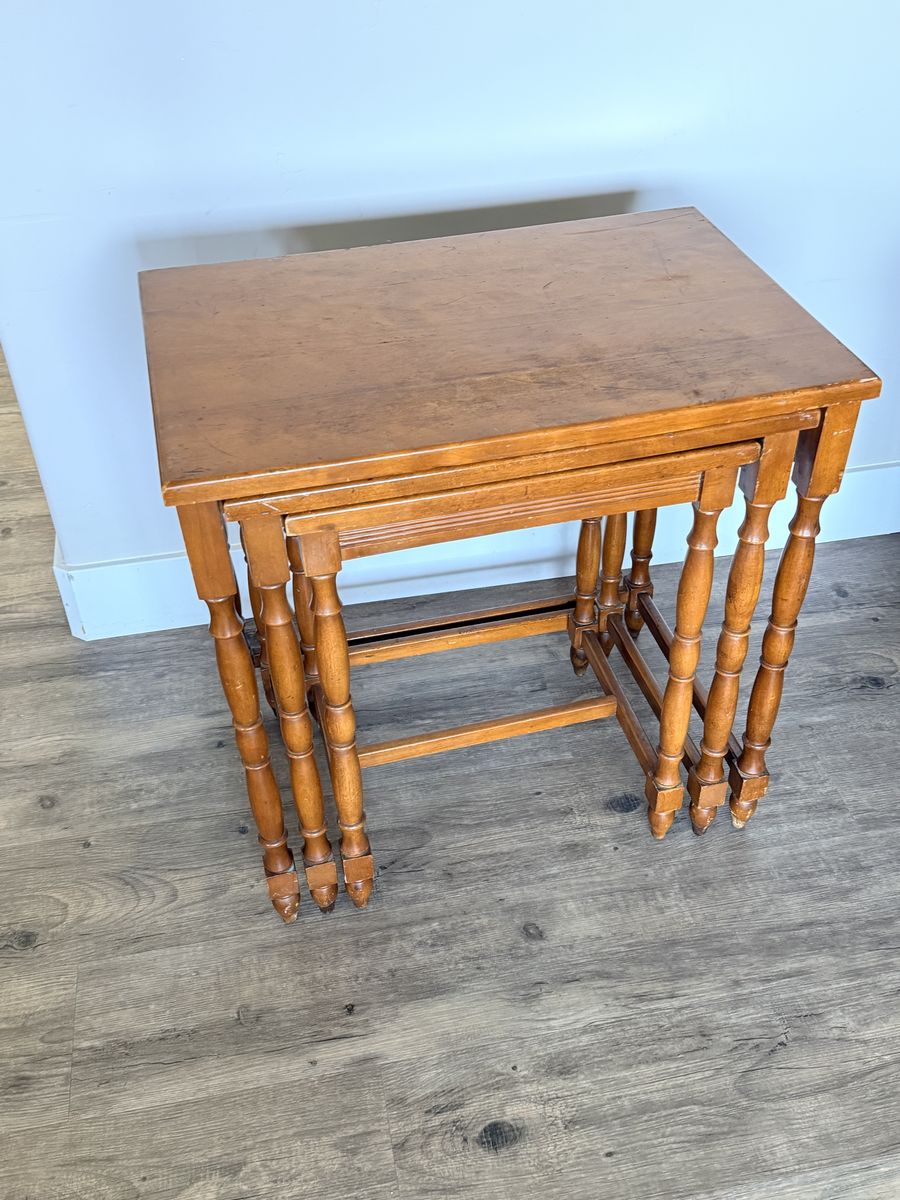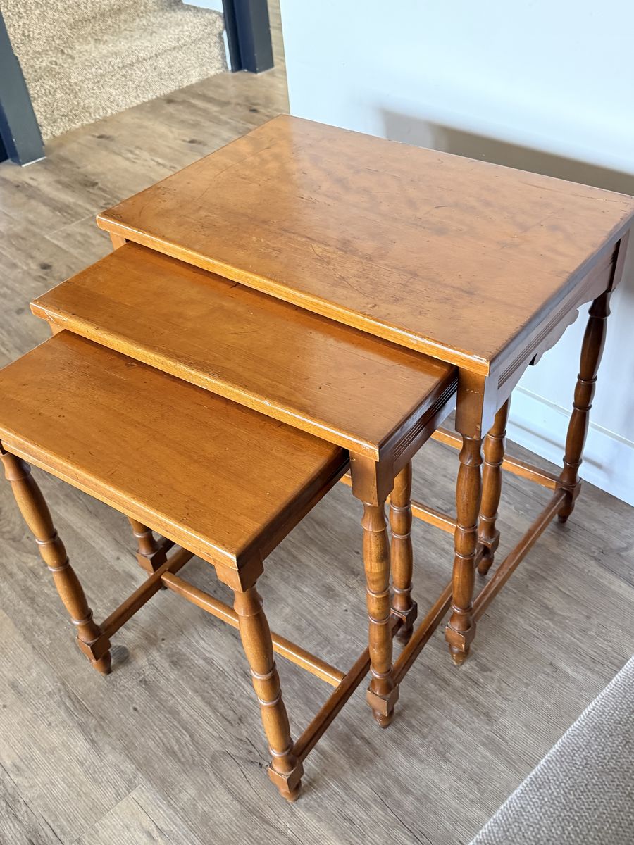 set of three vintage nesting tables features a traditional design often associated with mid-20th century colonial or farmhouse styles, likely dating from the 1950s to the 1970s.
