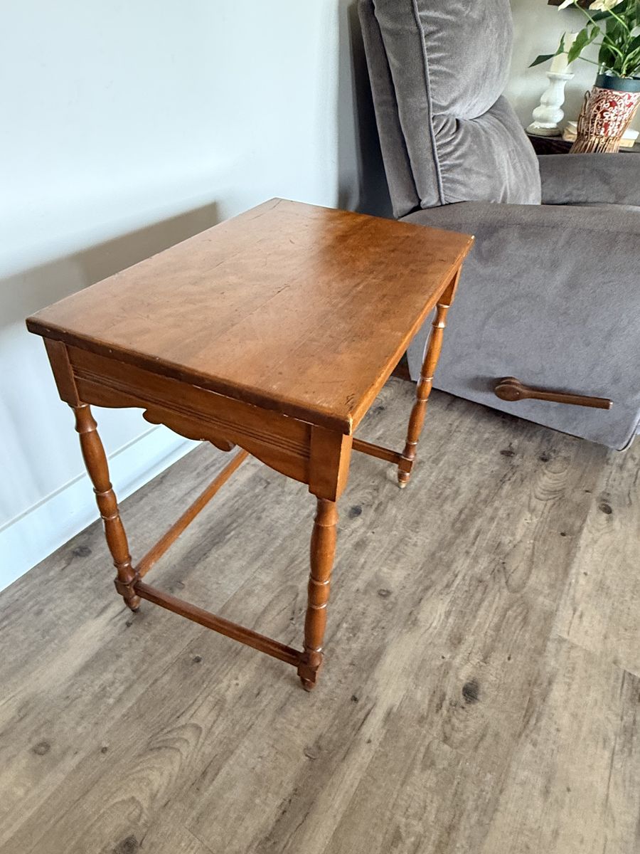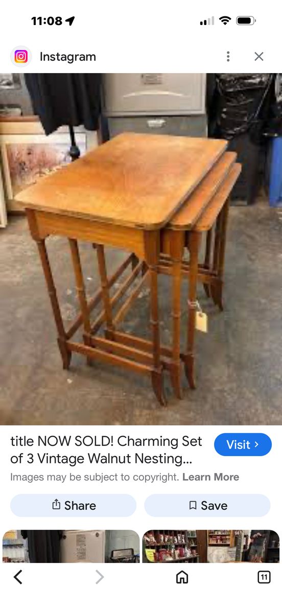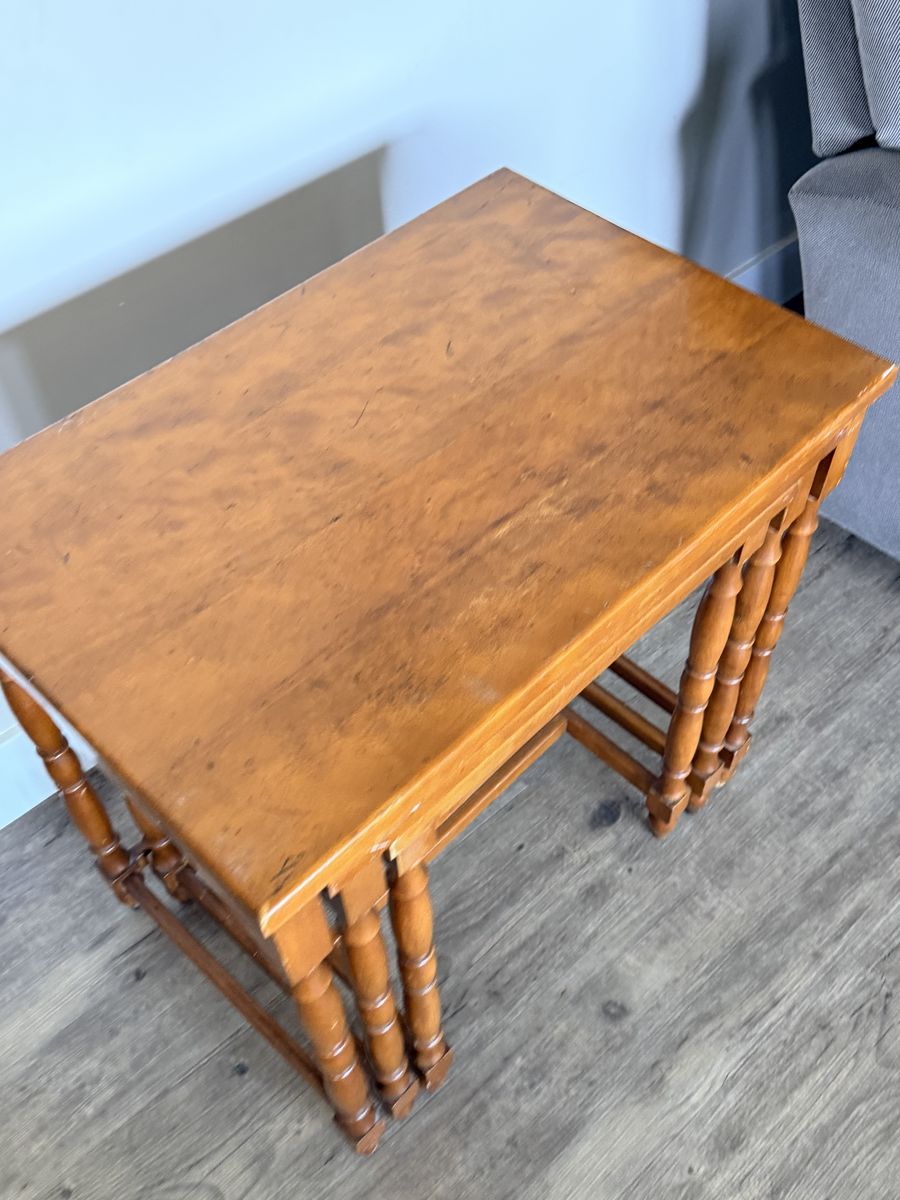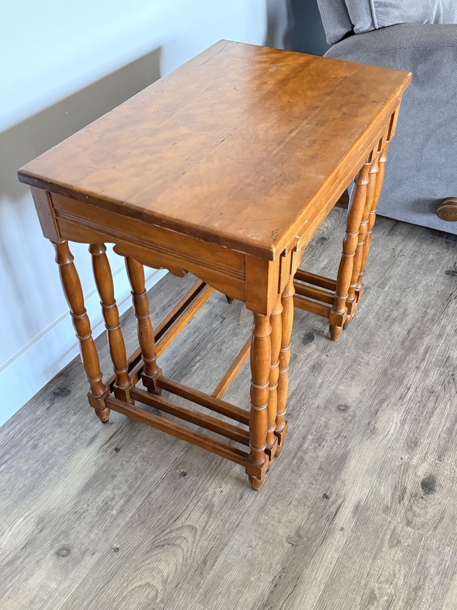 set of three vintage nesting tables features a traditional design often associated with mid-20th century colonial or farmhouse styles, likely dating from the 1950s to the 1970s.