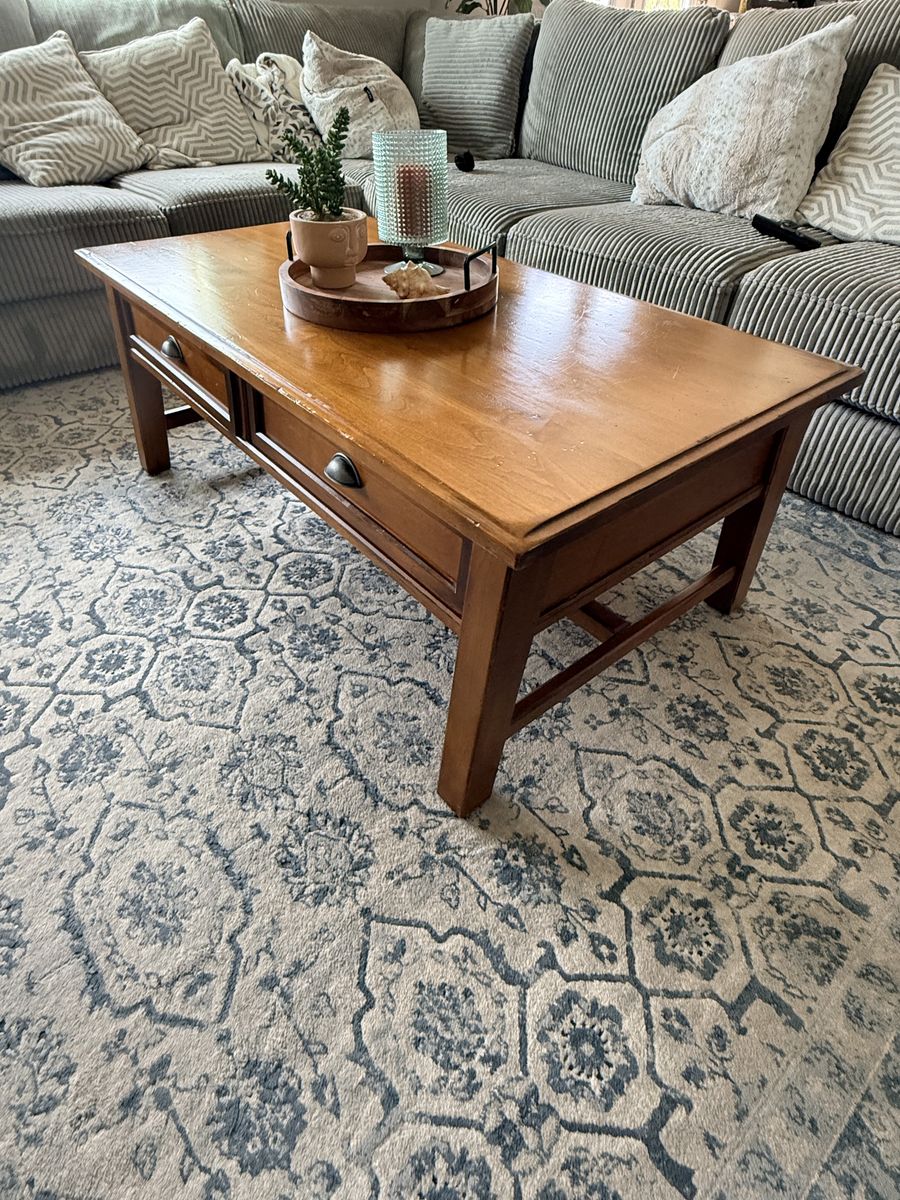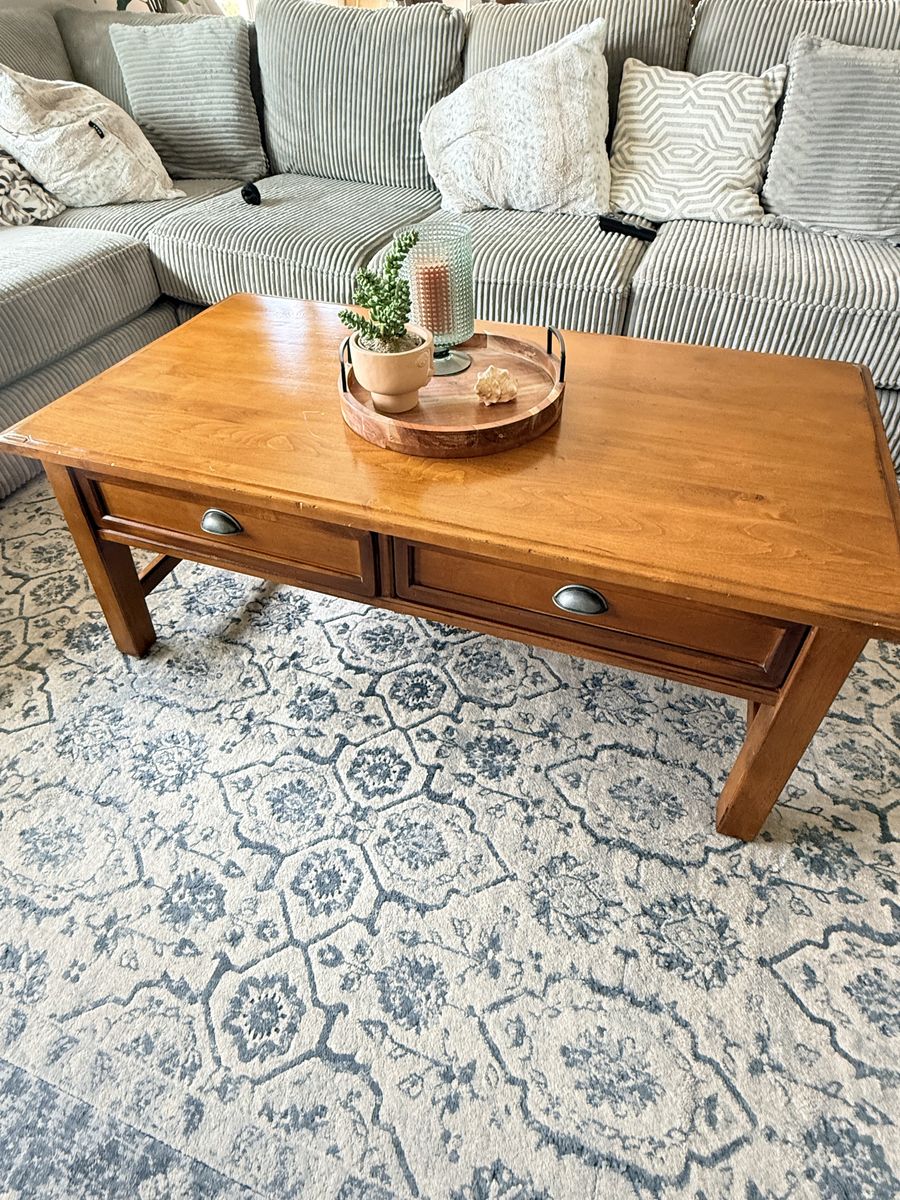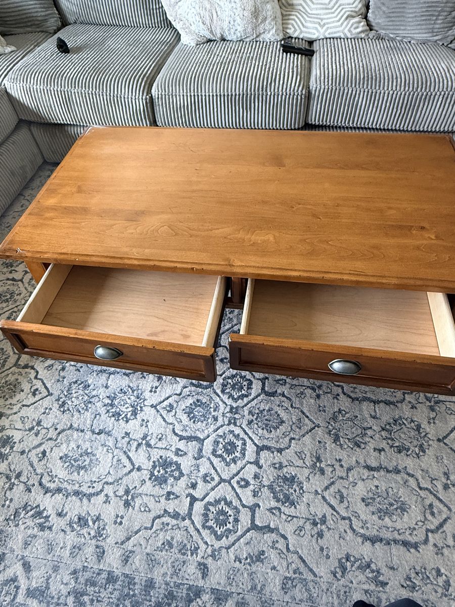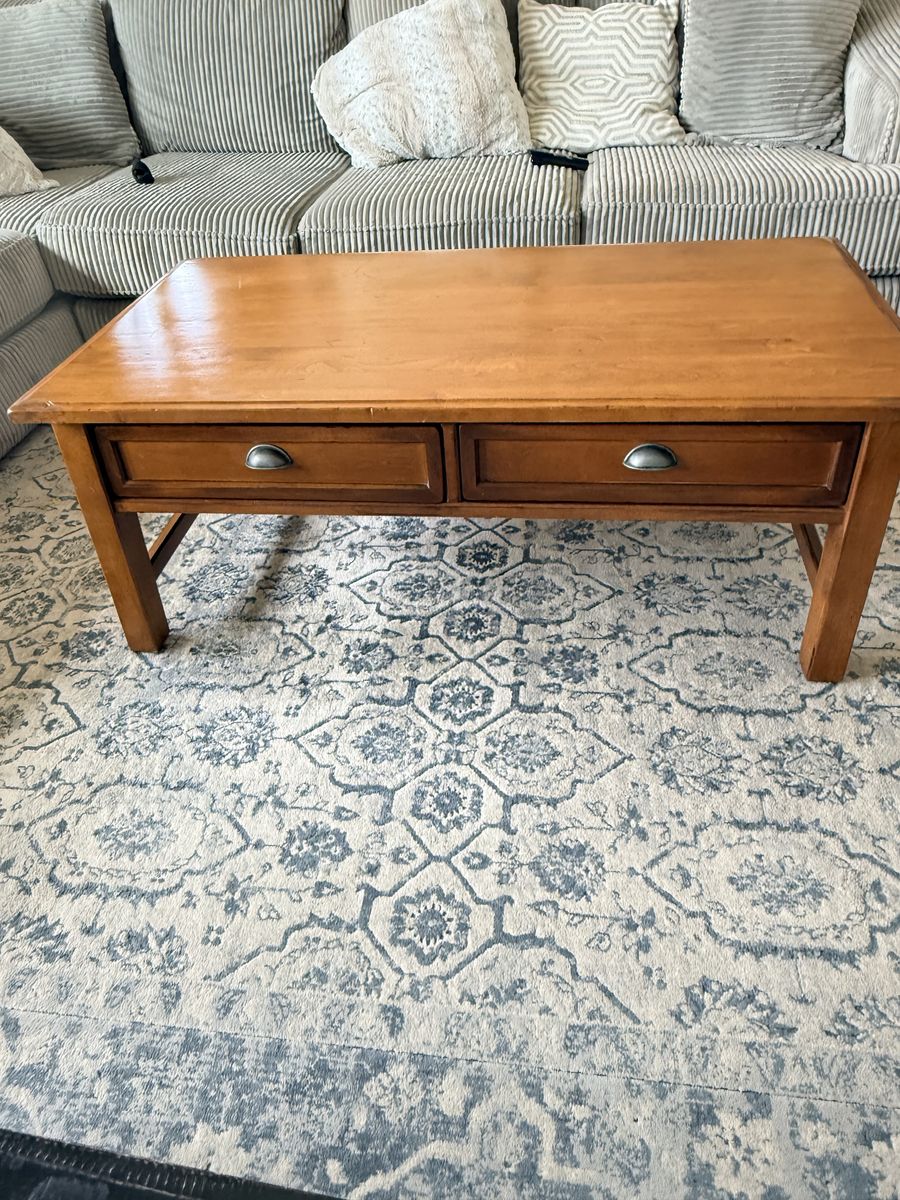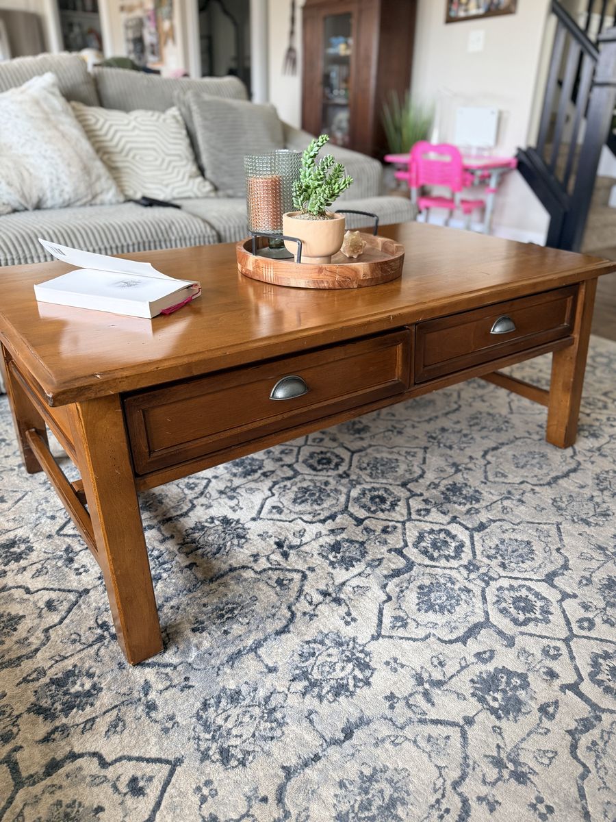 Venmo52x27x19 Gorgeous Pottery Barn solid wood coffee table. In great shape Has two pull drawers to storage.