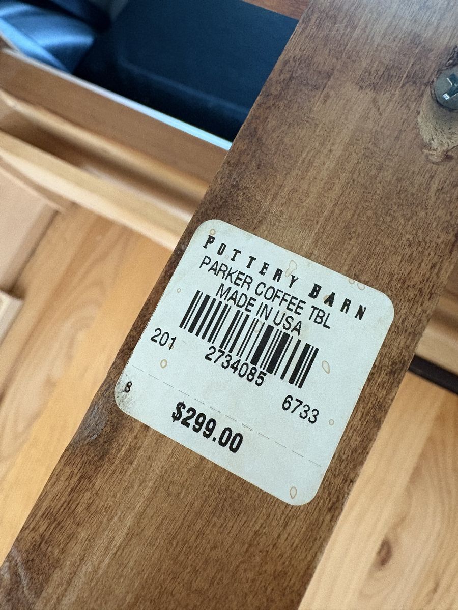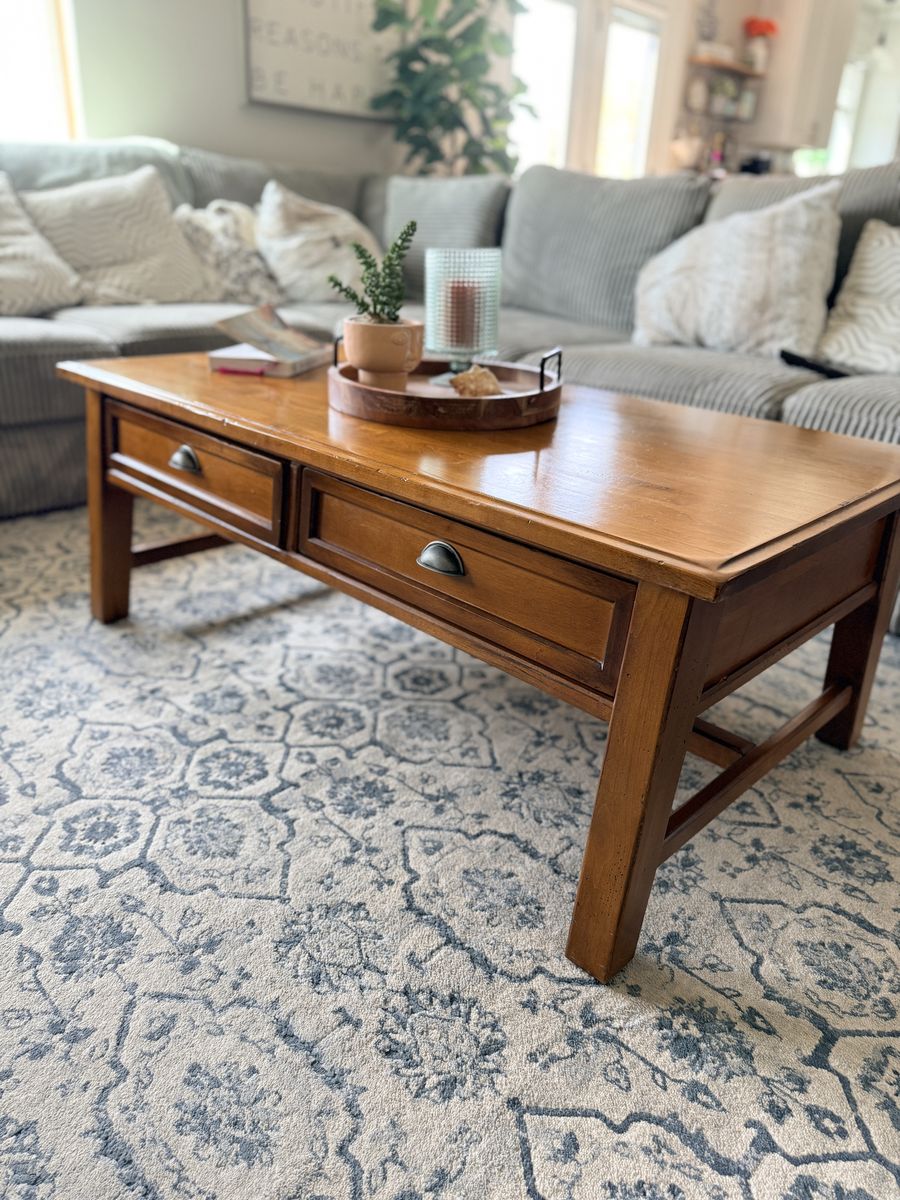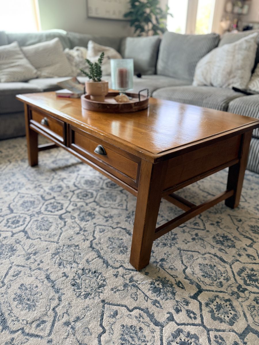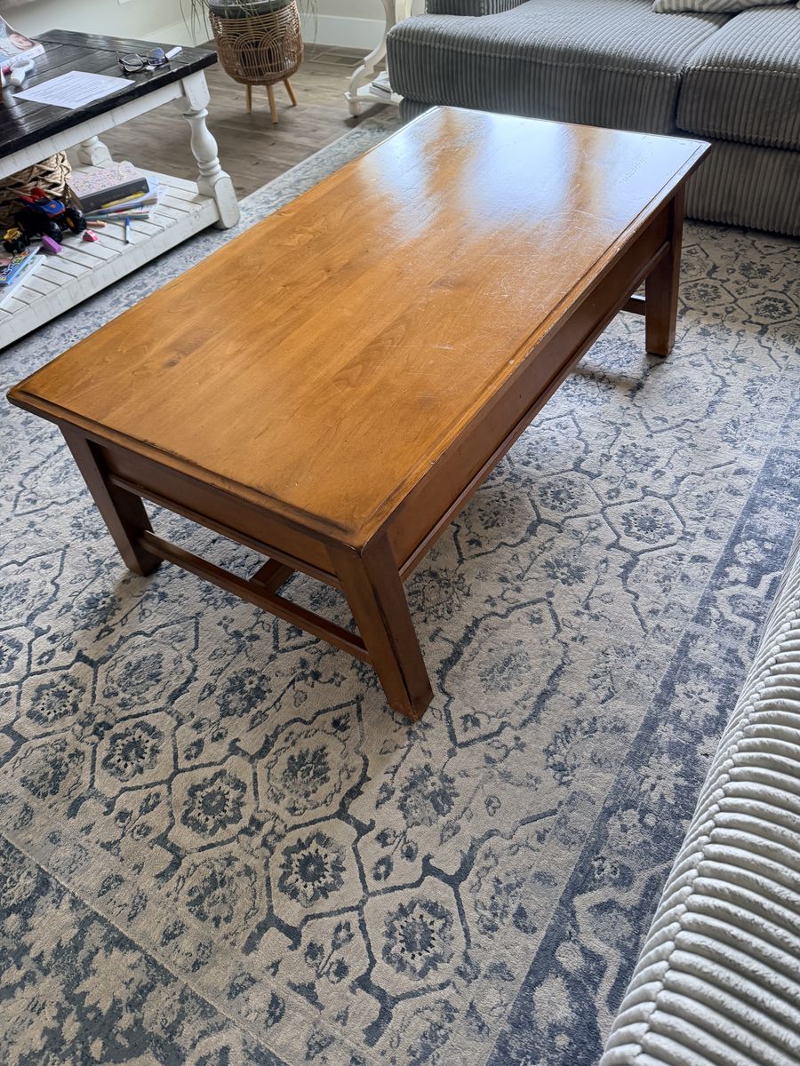 Venmo52x27x19 Gorgeous Pottery Barn solid wood coffee table. In great shape Has two pull drawers to storage.