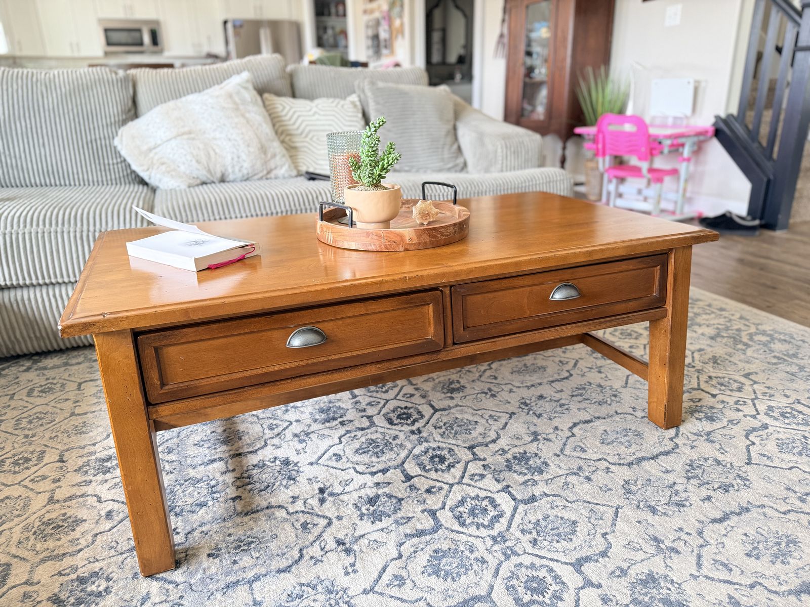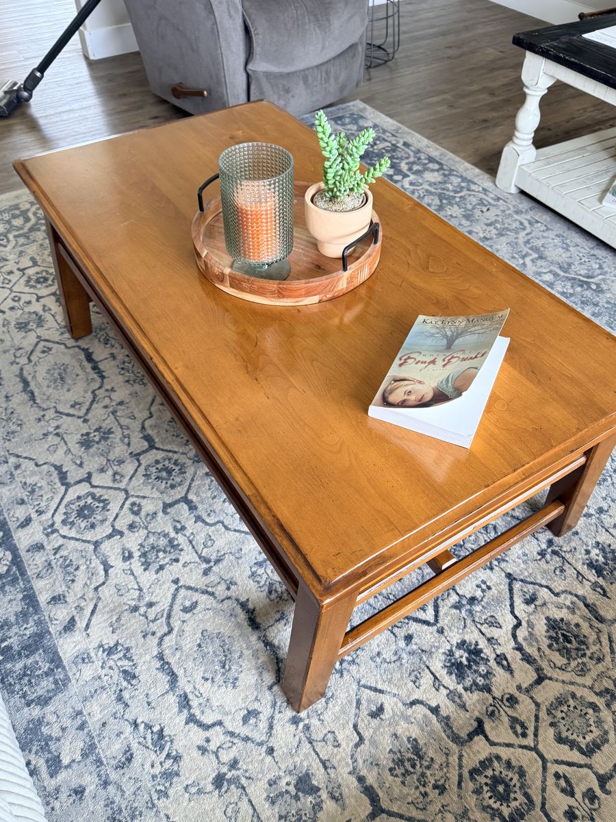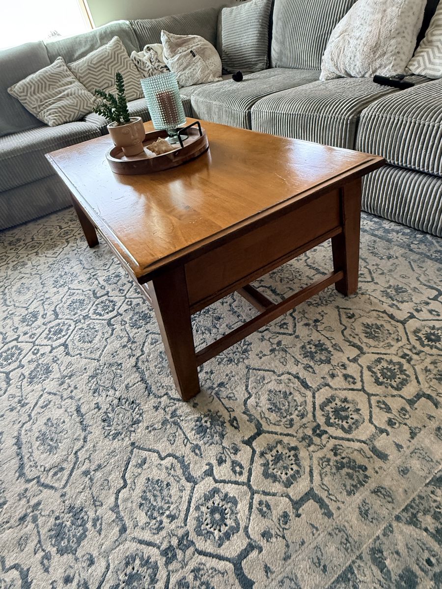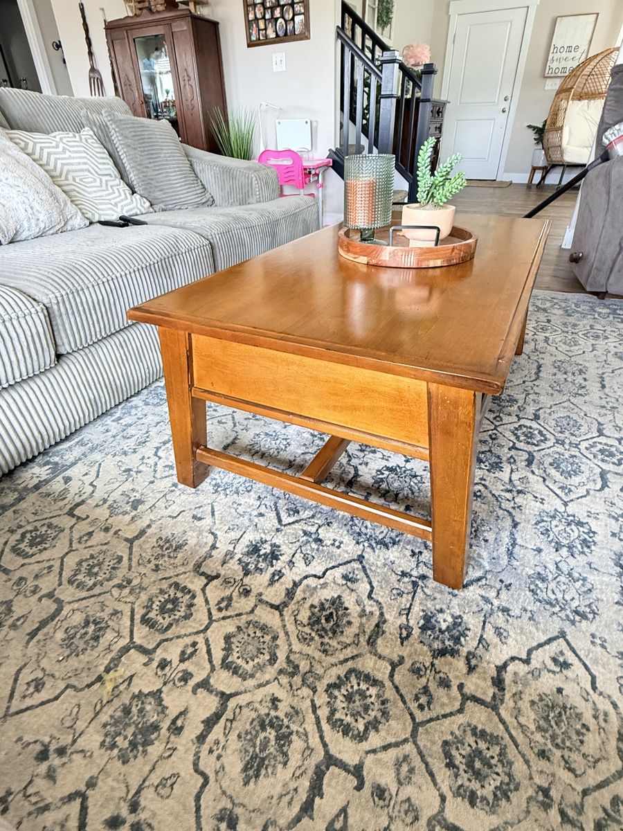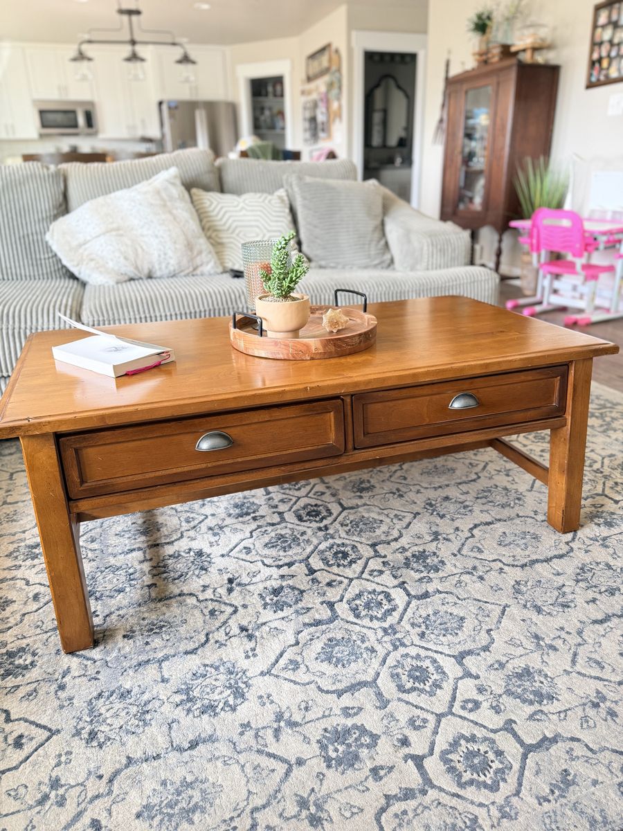 Venmo52x27x19 Gorgeous Pottery Barn solid wood coffee table. In great shape Has two pull drawers to storage.