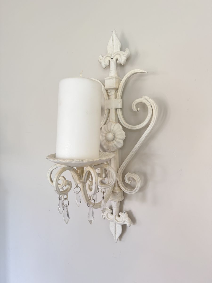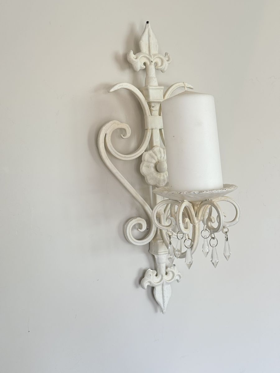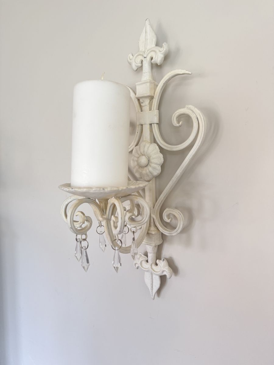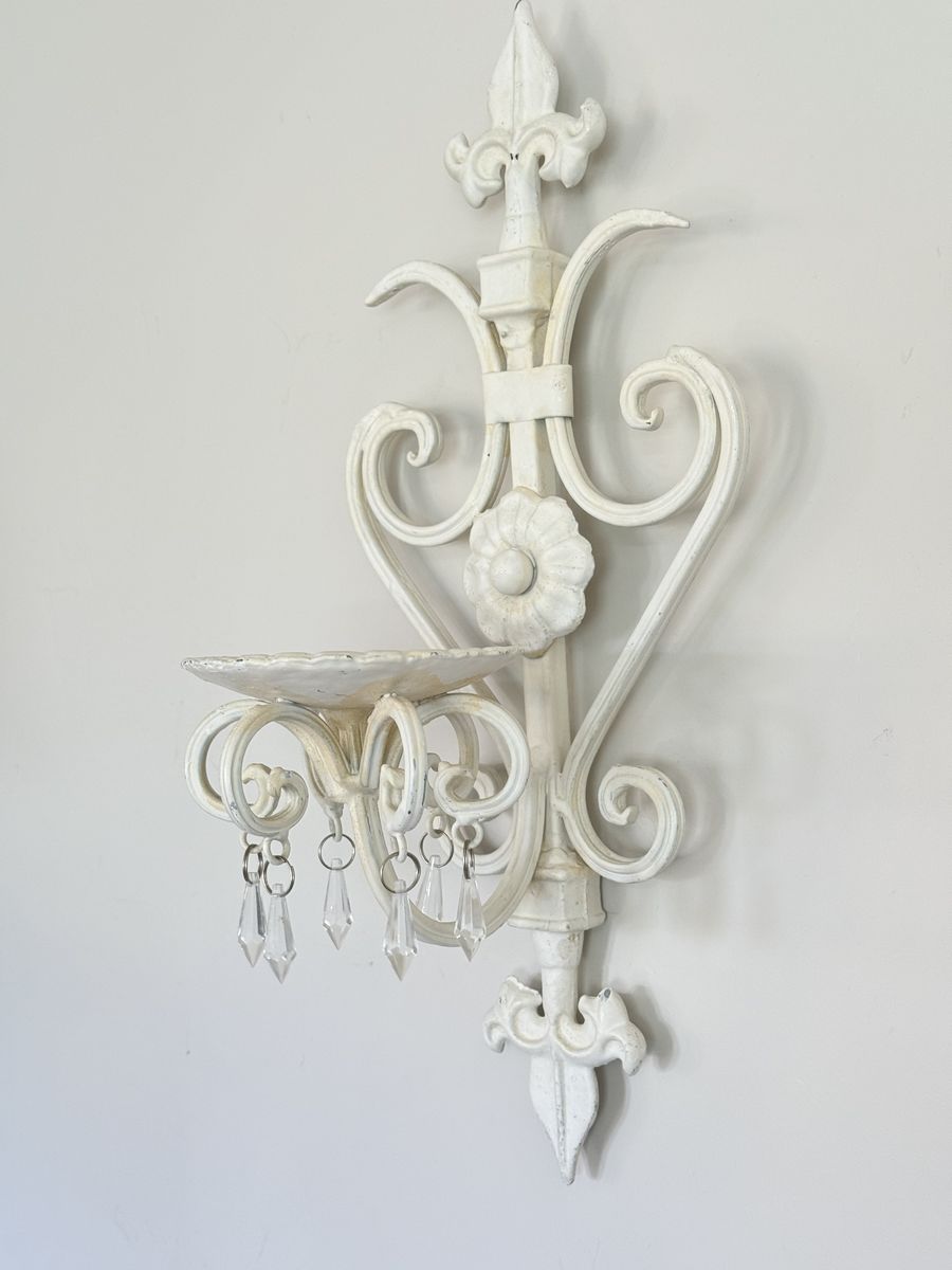 VenmoSet of 2 ornate, white-painted metal wall sconce features a classic fleur-de-lis motif at the top and bottom, complemented by elegant scrollwork and a central floral accent. The design includes a flared candle platform supported by a decorative bracket, from which several faceted clear crystal prisms are suspended, adding a touch of "shabby chic" or French country elegance.