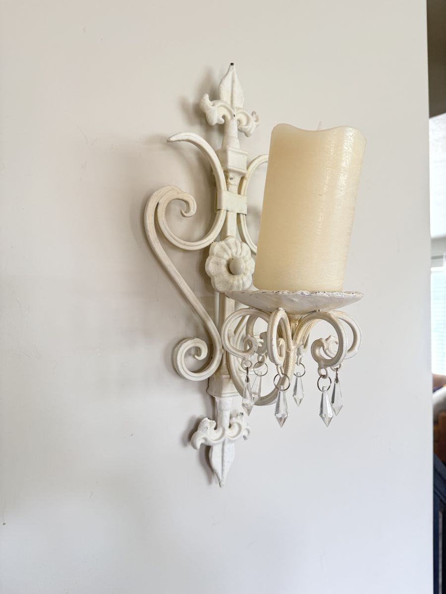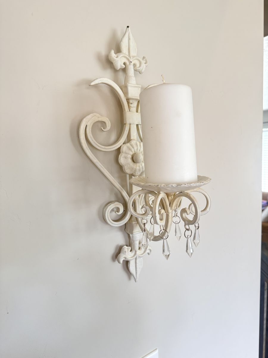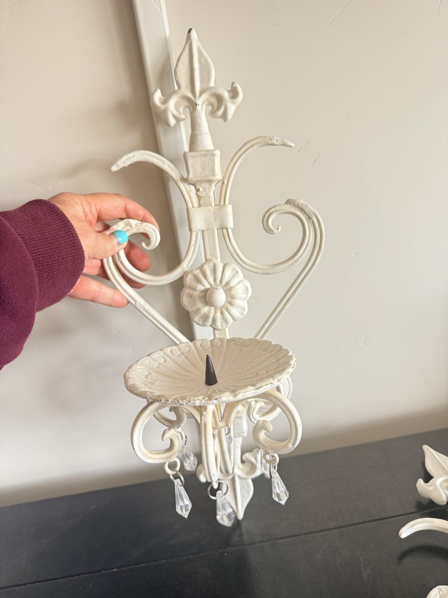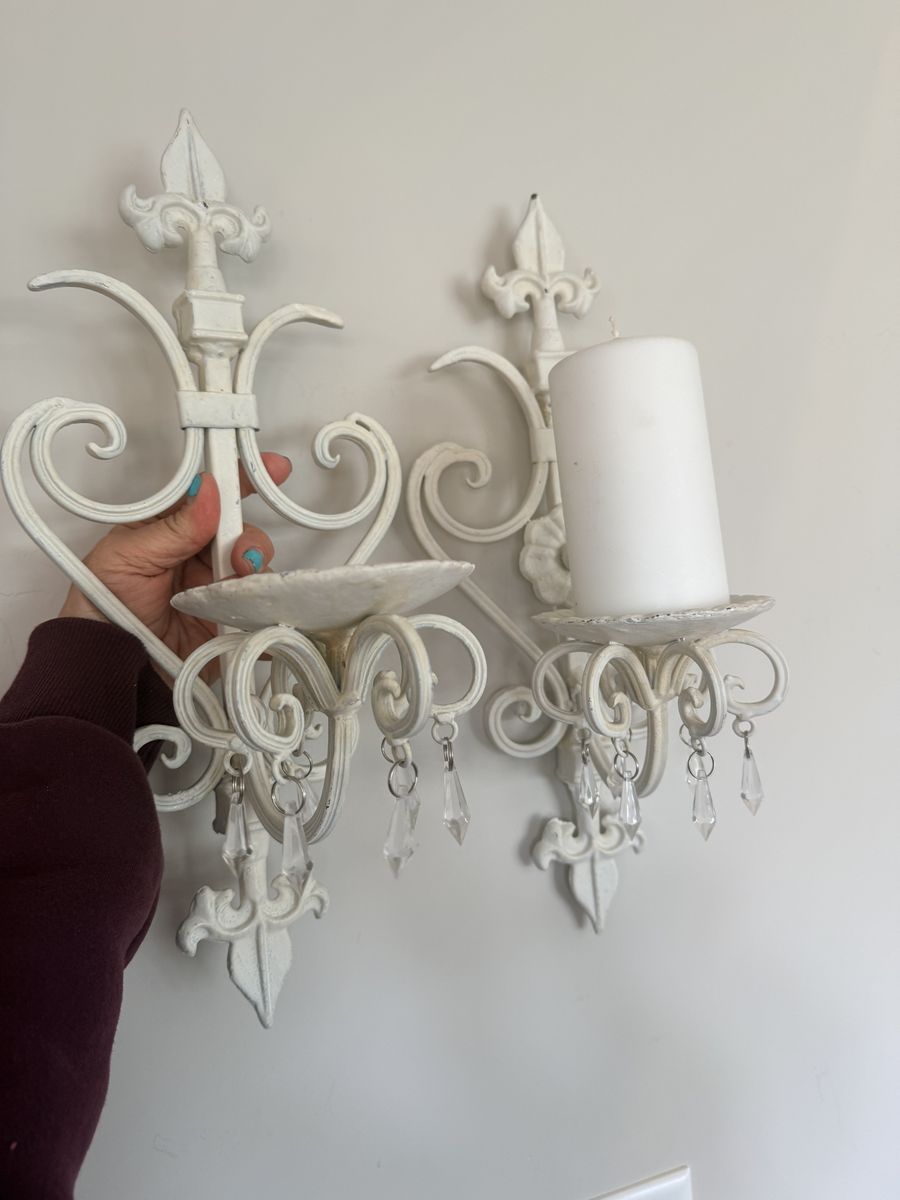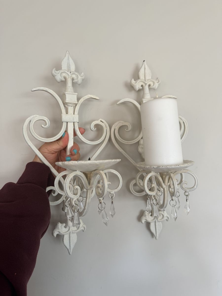 VenmoSet of 2 ornate, white-painted metal wall sconce features a classic fleur-de-lis motif at the top and bottom, complemented by elegant scrollwork and a central floral accent. The design includes a flared candle platform supported by a decorative bracket, from which several faceted clear crystal prisms are suspended, adding a touch of "shabby chic" or French country elegance.