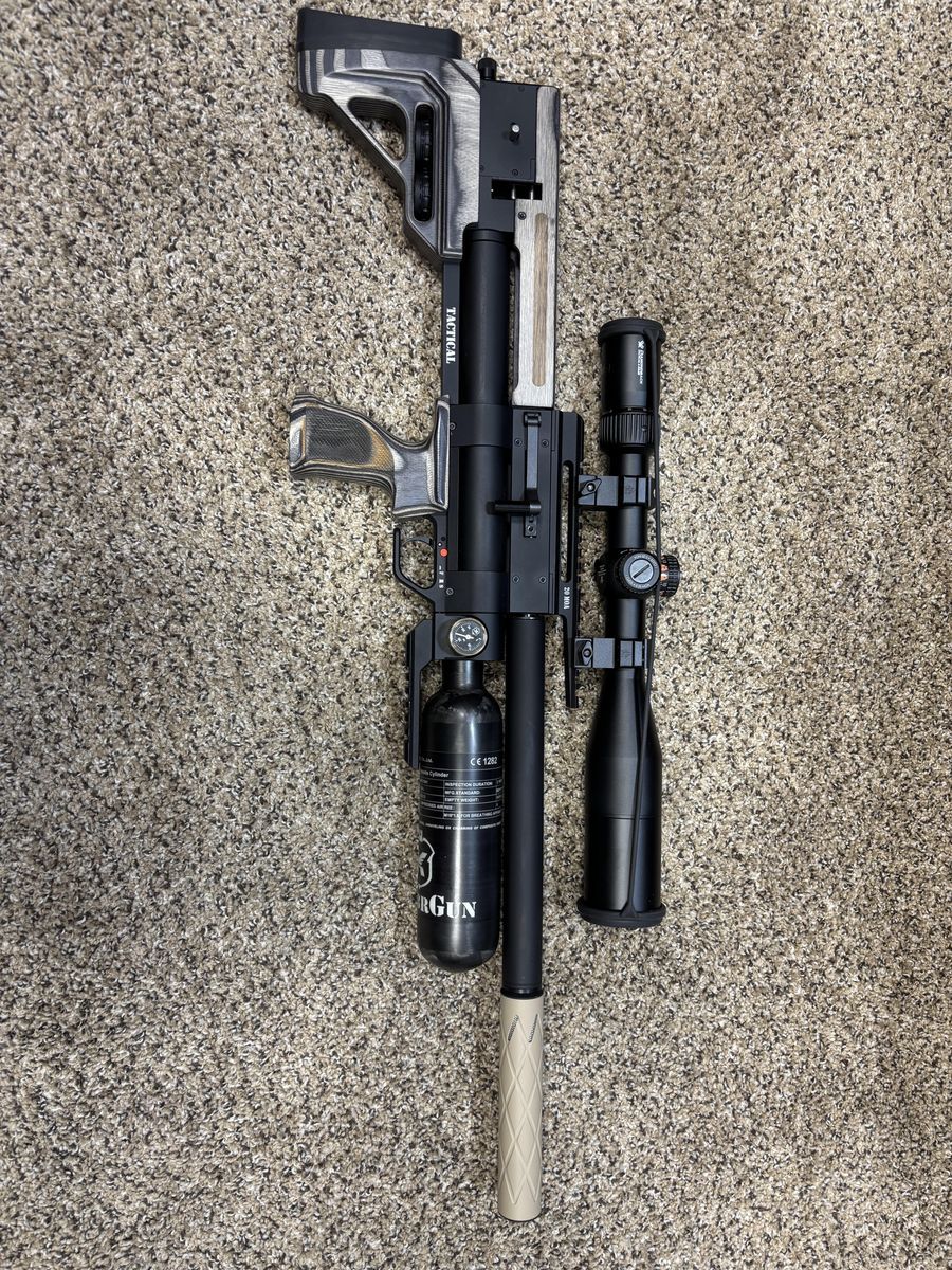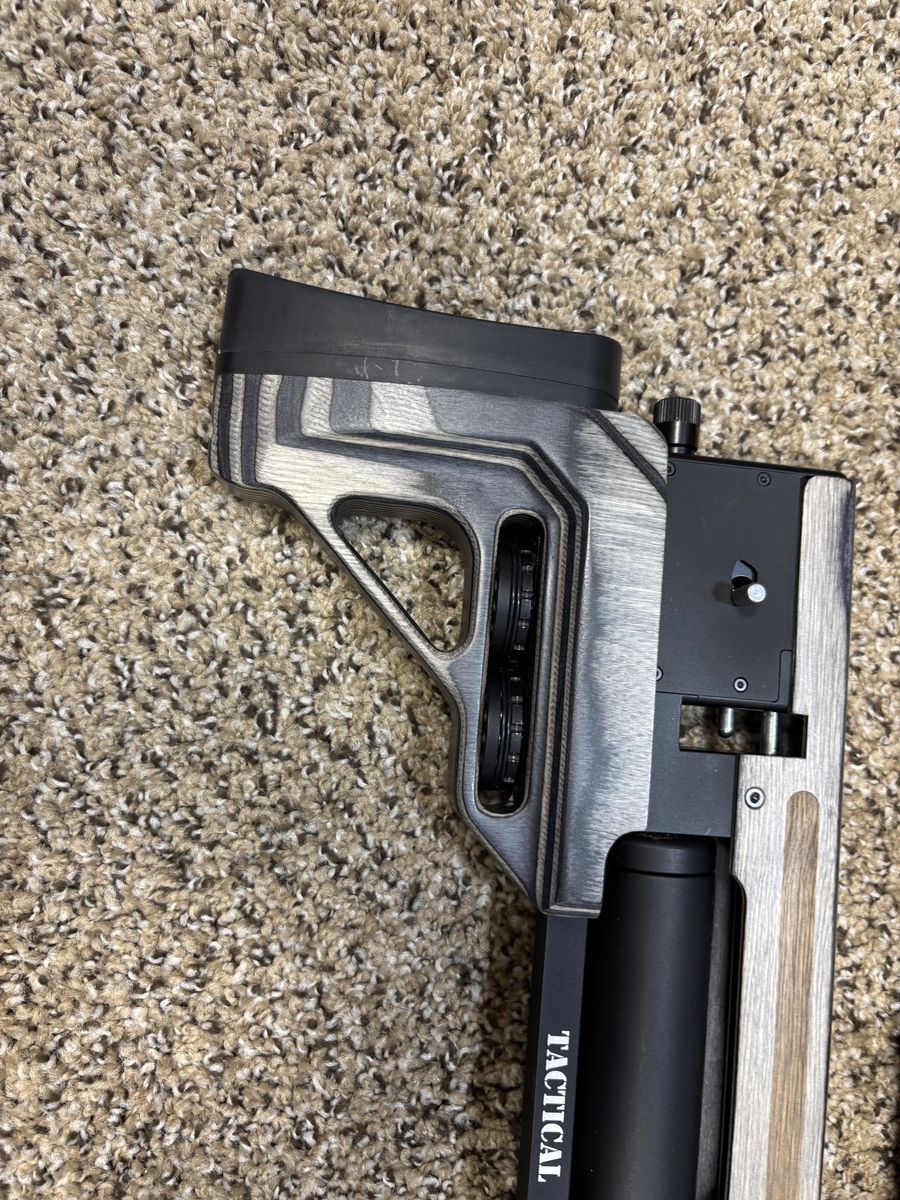 Kaliber Gun Cricket 2, tactical 45 laminate overall length is 28 inches without moderator 22 caliber. does not come with scope.