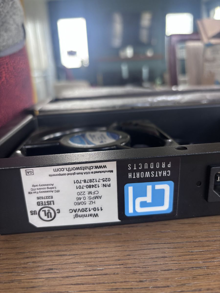 Chatsworth Products (CPI) 12480-701 cooling fan kit for sale—high-performance 400 CFM system designed for server racks, network cabinets, and AV enclosures. This unit includes 4 fans mounted on dual frames, runs on standard 115V power, and operates quietly (~37 dBA per fan) with durable ball-bearing motors for long life.