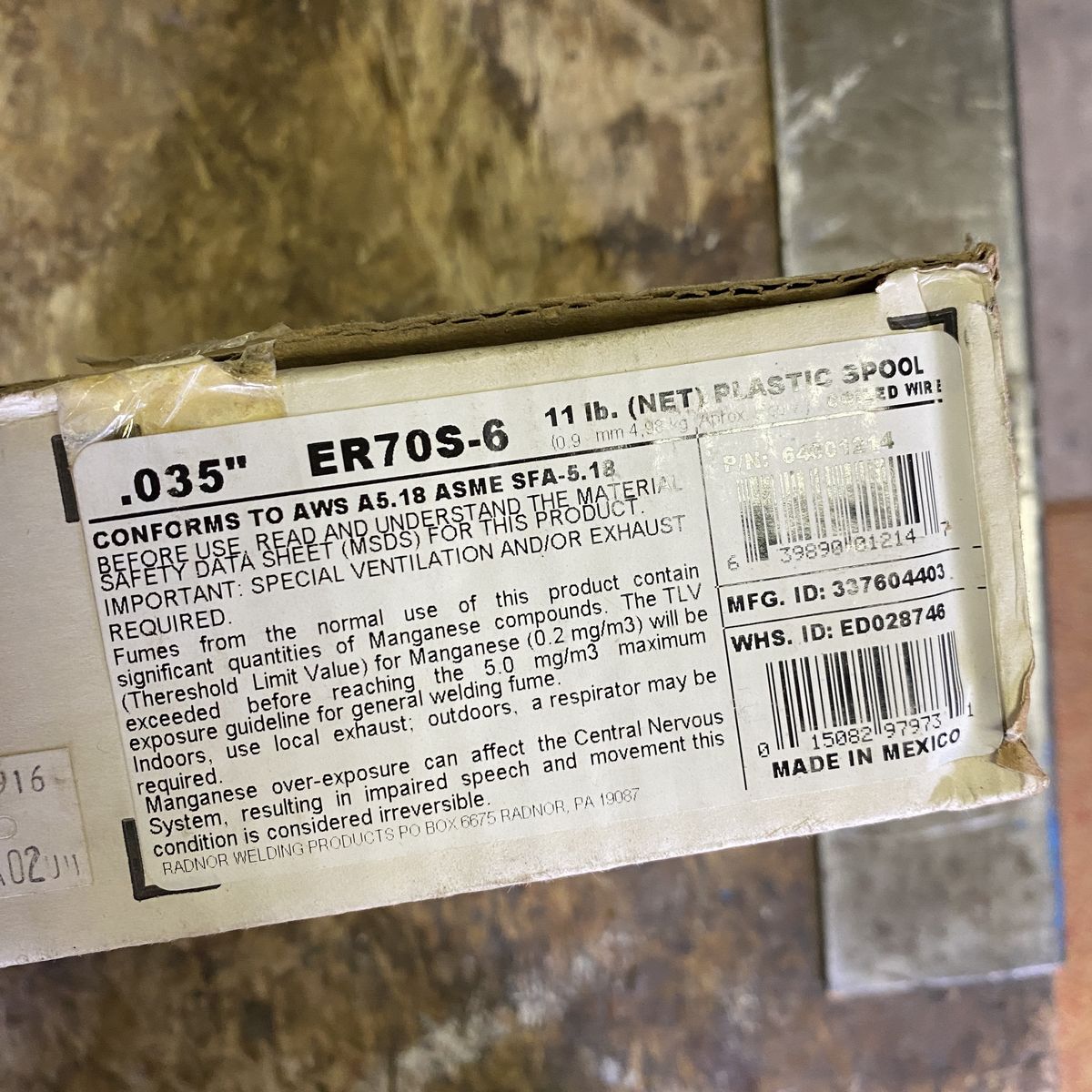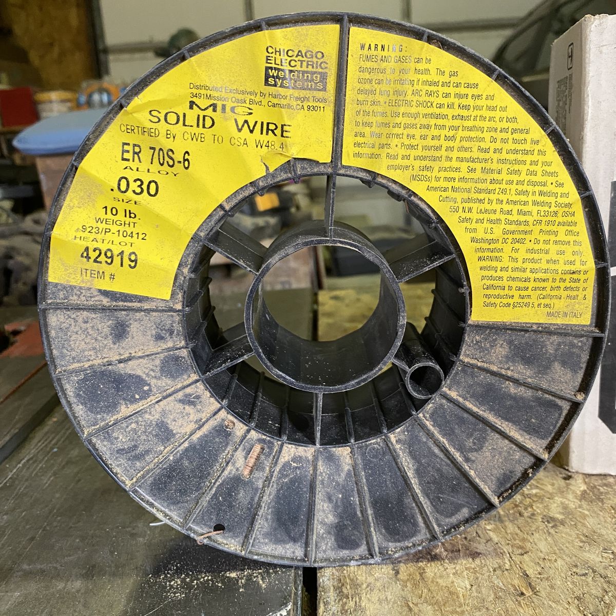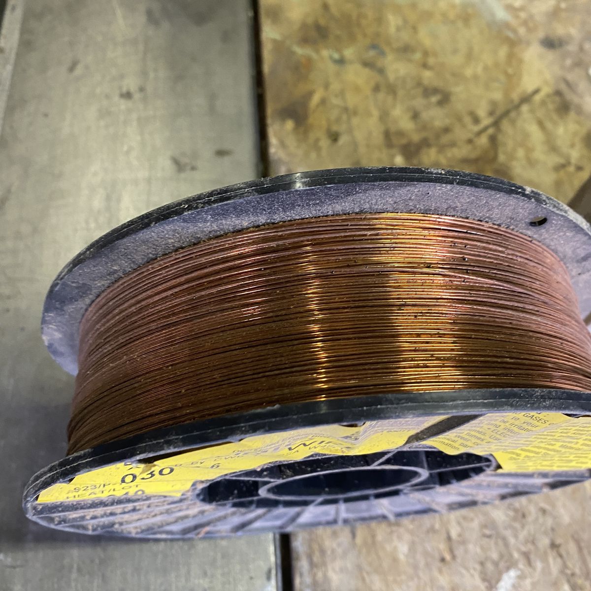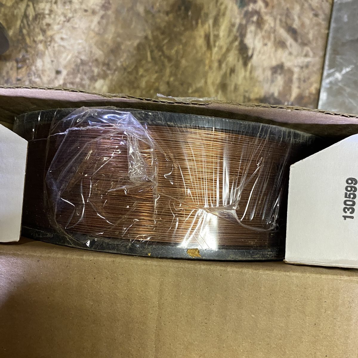Two spools of MIG welding wire. One spool looks to be partially used and has a .030" diameter. The other spool is new in box and has a .035" diameter.